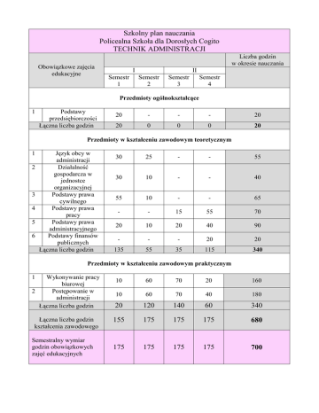 Szkolny plan nauczania Policealna Szkoła dla Dorosłych Cogito TECHNIK ADMINISTRACJI Obowiązkowe zajęcia edukacyjne Liczba godzin w okresie nauczania I Semestr 1 II Semestr 2 Semestr 3 Semestr 4 Przedmioty ogólnokształcące 1 Podstawy przedsiębiorczości Łączna liczba godzin 20 - - - 20 20 0 0 0 20 Przedmioty w kształceniu zawodowym teoretycznym 1 2 3 4 5 6 Język obcy w administracji Działalność gospodarcza w jednostce organizacyjnej Podstawy prawa cywilnego Podstawy prawa pracy Podstawy prawa administracyjnego Podstawy finansów publicznych Łączna liczba godzin 30 25 - - 55 30 10 - - 40 55 10 - - 65 - - 15 55 70 20 10 20 40 90 - - - 20 20 135 55 35 115 340 Przedmioty w kształceniu zawodowym praktycznym 1 Wykonywanie pracy biurowej 2 Postępowanie w administracji Łączna liczba godzin Łączna liczba godzin kształcenia zawodowego Semestralny wymiar godzin obowiązkowych zajęć edukacyjnych 10 60 70 20 160 10 60 70 40 180 20 120 140 60 340 155 175 175 175 680 175 175 175 175 700