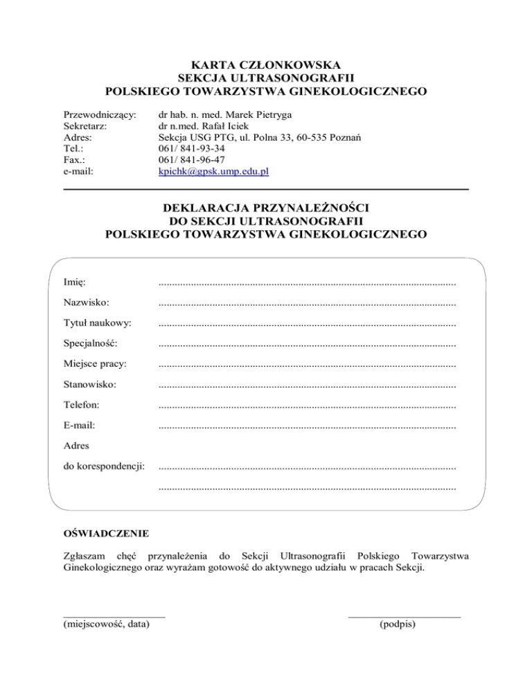KARTA CZŁONKOWSKA SEKCJA ULTRASONOGRAFII POLSKIEGO TOWARZYSTWA GINEKOLOGICZNEGO Przewodniczący: Sekretarz: Adres: Tel.: Fax.: e-mail: dr hab. n. med. Marek Pietryga dr n.med. Rafał Iciek Sekcja USG PTG, ul. Polna 33, 60-535 Poznań 061/ 841-93-34 061/ 841-96-47 [email protected] DEKLARACJA PRZYNALEŻNOŚCI DO SEKCJI ULTRASONOGRAFII POLSKIEGO TOWARZYSTWA GINEKOLOGICZNEGO Imię: ............................................................................................................... Nazwisko: ............................................................................................................... Tytuł naukowy: ............................................................................................................... Specjalność: ............................................................................................................... Miejsce pracy: ............................................................................................................... Stanowisko: ............................................................................................................... Telefon: ............................................................................................................... E-mail: ............................................................................................................... Adres do korespondencji: ............................................................................................................... ............................................................................................................... OŚWIADCZENIE Zgłaszam chęć przynależenia do Sekcji Ultrasonografii Polskiego Towarzystwa Ginekologicznego oraz wyrażam gotowość do aktywnego udziału w pracach Sekcji. ___________________ (miejscowość, data) _____________________ (podpis)