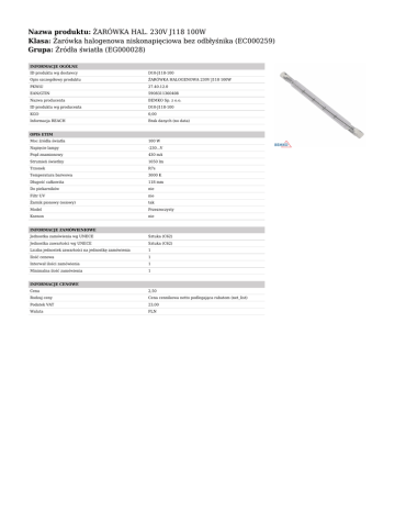 Nazwa produktu: ŻARÓWKA HAL. 230V J118 100W Klasa