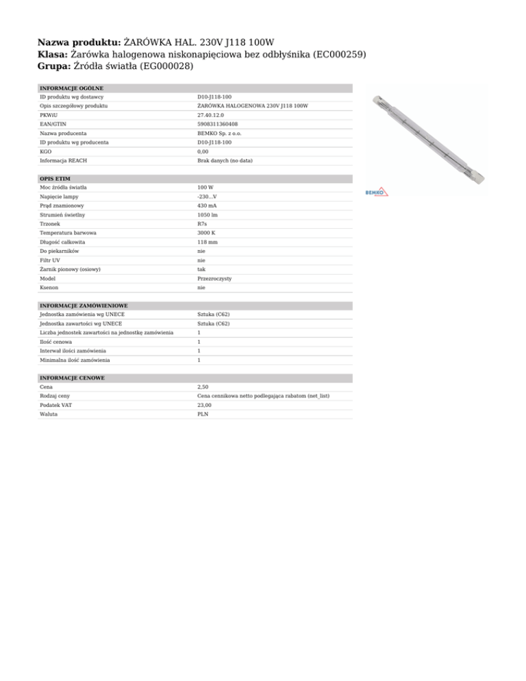 Nazwa produktu: ŻARÓWKA HAL. 230V J118 100W Klasa: Żarówka halogenowa niskonapięciowa bez odbłyśnika (EC000259) Grupa: Źródła światła (EG000028) INFORMACJE OGÓLNE ID produktu wg dostawcy D10-J118-100 Opis szczegółowy produktu ŻARÓWKA HALOGENOWA 230V J118 100W PKWiU 27.40.12.0 EAN/GTIN 5908311360408 Nazwa producenta BEMKO Sp. z o.o. ID produktu wg producenta D10-J118-100 KGO 0,00 Informacja REACH Brak danych (no data) OPIS ETIM Moc źródła światła 100 W Napięcie lampy -230...V Prąd znamionowy 430 mA Strumień świetlny 1050 lm Trzonek R7s Temperatura barwowa 3000 K Długość całkowita 118 mm Do piekarników nie Filtr UV nie Żarnik pionowy (osiowy) tak Model Przezroczysty Ksenon nie INFORMACJE ZAMÓWIENIOWE Jednostka zamówienia wg UNECE Sztuka (C62) Jednostka zawartości wg UNECE Sztuka (C62) Liczba jednostek zawartości na jednostkę zamówienia 1 Ilość cenowa 1 Interwał ilości zamówienia 1 Minimalna ilość zamówienia 1 INFORMACJE CENOWE Cena 2,50 Rodzaj ceny Cena cennikowa netto podlegająca rabatom (net_list) Podatek VAT 23,00 Waluta PLN