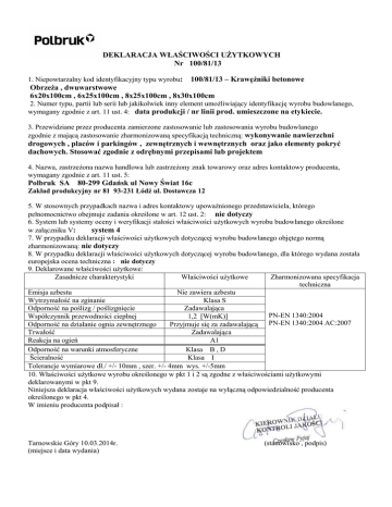 DEKLARACJA WŁAŚCIWOŚCI UŻYTKOWYCH Nr 100/81/13 1. Niepowtarzalny kod identyfikacyjny typu wyrobu: 100/81/13 – Krawężniki betonowe Obrzeża , dwuwarstwowe 6x20x100cm , 6x25x100cm , 8x25x100cm , 8x30x100cm 2. Numer typu, partii lub serii lub jakikolwiek inny element umożliwiający identyfikację wyrobu budowlanego, wymagany zgodnie z art. 11 ust. 4: data produkcji / nr linii prod. umieszczone na etykiecie. 3. Przewidziane przez producenta zamierzone zastosowanie lub zastosowania wyrobu budowlanego zgodnie z mającą zastosowanie zharmonizowaną specyfikacją techniczną: wykonywanie nawierzchni drogowych , placów i parkingów , zewnętrznych i wewnętrznych oraz jako elementy pokryć dachowych. Stosować zgodnie z odrębnymi przepisami lub projektem 4. Nazwa, zastrzeżona nazwa handlowa lub zastrzeżony znak towarowy oraz adres kontaktowy producenta, wymagany zgodnie z art. 11 ust. 5: Polbruk SA 80-299 Gdańsk ul Nowy Świat 16c Zakład produkcyjny nr 81 93-231 Łódź ul. Dostawcza 12 5. W stosownych przypadkach nazwa i adres kontaktowy upoważnionego przedstawiciela, którego pełnomocnictwo obejmuje zadania określone w art. 12 ust. 2: nie dotyczy 6. System lub systemy oceny i weryfikacji stałości właściwości użytkowych wyrobu budowlanego określone w załączniku V: system 4 7. W przypadku deklaracji właściwości użytkowych dotyczącej wyrobu budowlanego objętego normą zharmonizowaną: nie dotyczy 8. W przypadku deklaracji właściwości użytkowych dotyczącej wyrobu budowlanego, dla którego wydana została europejska ocena techniczna : nie dotyczy 9. Deklarowane właściwości użytkowe: Zasadnicze charakterystyki Właściwości użytkowe Zharmonizowana specyfikacja techniczna Emisja azbestu Nie zawiera azbestu Wytrzymałość na zginanie Klasa S Odporność na poślizg / poślizgnięcie Zadawalająca PN-EN 1340:2004 Współczynnik przewodności cieplnej 1,2 [W(mK)] Odporność na działanie ognia zewnętrznego Przyjmuje się za zadawalającą PN-EN 1340:2004 AC:2007 Trwałość Zadawalająca Reakcja na ogień A1 Odporność na warunki atmosferyczne Klasa B , D Ścieralność Klasa I Tolerancje wymiarowe dł./ +/- 10mm , szer. +/- 4mm wys. +/-5mm 10. Właściwości użytkowe wyrobu określonego w pkt 1 i 2 są zgodne z właściwościami użytkowymi deklarowanymi w pkt 9. Niniejsza deklaracja właściwości użytkowych wydana zostaje na wyłączną odpowiedzialność producenta określonego w pkt 4. W imieniu producenta podpisał : Tarnowskie Góry 10.03.2014r. (miejsce i data wydania) (stanowisko , podpis)