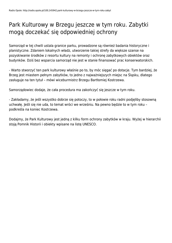 Radio Opole: http://radio.opole.pl/100,145942,park-kulturowy-w-brzegu-jeszcze-w-tym-roku-zabyt Park Kulturowy w Brzegu jeszcze w tym roku. Zabytki mogą doczekać się odpowiedniej ochrony Samorząd w tej chwili ustala granice parku, prowadzone są również badania historyczne i planistyczne. Zdaniem lokalnych władz, utworzenie takiej strefy da większe szanse na pozyskiwanie środków z resortu kultury na remonty i ochronę zabytkowych obiektów oraz budynków. Dziś bez wsparcia samorząd nie jest w stanie finansować prac konserwatorskich. - Warto stworzyć ten park kulturowy właśnie po to, by móc sięgać po dotacje. Tym bardziej, że Brzeg jest miastem pełnym zabytków, to jedno z najważniejszych miejsc na Śląsku, dlatego zasługuje na ten tytuł – mówi wiceburmistrz Brzegu Bartłomiej Kostrzewa. Samorządowiec dodaje, że cała procedura ma zakończyć się jeszcze w tym roku. - Zakładamy, że jeśli wszystko dobrze się potoczy, to w połowie roku radni podjęliby stosowną uchwałę. Jeśli się nie uda, to temat wróci we wrześniu. Na pewno będzie to w tym roku – podkreśla na koniec Kostrzewa. Dodajmy, że Park Kulturowy jest jedną z kilku form ochrony zabytków w kraju. Wyżej w hierarchii stoją Pomnik Historii i obiekty wpisane na listę UNESCO.