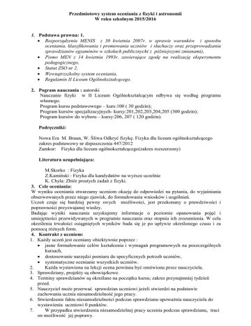 Przedmiotowy system oceniania z fizyki i astronomii W roku szkolnym 2015/2016 1. Podstawa prawna: 1. Rozporządzeniu MENIS z 30 kwietnia 2007r. w sprawie warunków i sposobu oceniania, klasyfikowania i promowania uczniów i słuchaczy oraz przeprowadzania sprawdzianów egzaminów w szkołach publicznych( z późniejszymi zmianami), Pismo MEN z 14 kwietnia 1993r. zawierające zgodę na realizację eksperymentu pedagogicznego, Statut ZSO nr 2, Wewnątrzszkolny system oceniania, Regulamin II Liceum Ogólnokształcącego. 2. Pogram nauczania : autorski Nauczanie fizyki w II Liceum Ogólnokształcącym odbywa się według programu własnego. Program kursu podstawowego – kurs:100 ( 30 godzin); Program kursów specjalizacyjnych- kursy:201,202,203,204,205 (300 godzin); Program kursów do wyboru – kursy:206, 207 ( 120 godzin). Podręczniki: Nowa Era M. Braun, W. Śliwa Odkryć fizykę. Fizyka dla liceum ogólnokształcącego zakres podstawowy nr dopuszczenia 447/2012 Zamkor: Fizyka dla liceum ogólnokształcącego(zakres rozszerzony) Literatura uzupełniająca: M.Skorko : Fizyka Z.Kamiński : Fizyka dla kandydatów na wyższe uczelnie K. Chyla: Zbiór prostych zadań z fizyki. 3. Cele oceniania: W wyniku oceniania stwarzamy uczniom okazję do odpowiedzi na pytania, do wyjaśniania obserwowanych przez niego zjawisk, do formułowania wniosków i uogólnień. Uczeń czuje się bardziej pewny swych możliwości, jest przekonany o prawdziwości i poprawności przyswajanej wiedzy. Badając wyniki nauczania uzyskujemy informacje o poziomie opanowania pojęć i umiejętności przewidywanych w programie nauczania oraz stopniu ich zrozumienia. W celu określenia trwałości osiągniętych wyników bada się je po upływie określonego czasu i za pomocą różnych form. 4. Kontrakt z uczniem: 1. Każdy uczeń jest oceniany obiektywnie poprzez : jasne formułowanie celów kształcenia i wymagań programowych na poszczególnych kursach, dostosowanie narzędzi pomiaru do specyficznych potrzeb uczniów, systematyczne ocenianie wszystkich uczniów. 2. Każda wystawiona na lekcji ocena powinna być omówiona przez nauczyciela. 3. Sprawdziany, projekty są obowiązkowe. 4. Terminy sprawdzianów są określane na początku kursu; zakres przynajmniej tydzień przed. 5. Nauczyciel może przerwać sprawdzian uczniowi jeżeli stwierdzi na podstawie zachowania ucznia niesamodzielność jego pracy. 6. Stwierdzenie faktu niesamodzielności podczas sprawdzianu upoważnia nauczyciela do wystawienia uczniowi 0 punktów. 7. W przypadku stwierdzenia niesamodzielnej pracy uczenia podczas sprawdzianu, traci on możliwość jej poprawy. Uczeń może poprawić jeden sprawdzian, po uprzednim umówieniu się z nauczycielem. 9. Punkty uzyskany z poprawy sprawdzianu są ostateczne. 10. Po dłuższej nieobecności w szkole ( powyżej 1 tygodnia) uczeń ma prawo nie być oceniany przez trzy dni. 11. Laureaci lub finaliści olimpiady fizycznej na szczeblu okręgowym otrzymują 10 punktów, które dopisuje się do sumy punktów uzyskanych przez ucznia na danym kursie 12. Laureaci lub finaliści olimpiady fizycznej na szczeblu centralnym otrzymują ocenę trymestralną, roczną i końcową celującą. 13. Uczeń który opuścił 50% zajęć jest nieklasyfikowany. 14. Klasyfikacja trymestralna polegająca na sumowaniu punktów uzyskanych przez ucznia w danym okresie kształcenia oraz podsumowanie frekwencji odbywa się w obecności ucznia. 15. Uczeń i jego rodzice zostają poinformowani o grożącej ocenie niedostatecznej do 14 dni przed klasyfikacyjną trymestralną. 8. W sprawie wszystkich kwestii nie omówionych w powyższym kontrakcie nauczyciel ma prawo podejmować własne decyzje, powiadamiając o tym uczniów, a wyjątkowe przypadki losowe traktować indywidualnie. 5. Narzędzia i warunki pomiaru osiągnięć: Kurs 100 Planujemy w danym trymestrze przeprowadzenie 3 godzinnych sprawdzianów za 20 pkt. każdy. Uczeń może poprawić jeden godzinny sprawdzian- do wyboru pierwszy lub drugi. Termin jest ustalony przez nauczyciela (jeden termin do którego musi się dostosować uczeń). W przypadku stwierdzenia niesamodzielnej pracy podczas sprawdzianu lub korzystania z niedozwolonych materiałów uczeń nie uzyskuje z danego sprawdzianu pkt. i nie ma możliwości poprawienia tego sprawdzianu. Sprawdziany: Astronomia i grawitacja 20 pkt. Fizyka atomowa 20 pkt. Fizyka jądrowa 20 pkt. ............................... 60pkt. Kurs 201 Planujemy w danym trymestrze przeprowadzenie 4 godzinnych sprawdzianów za 25 pkt. każdy. Uczeń może poprawić jeden godzinny sprawdzian- do wyboru 1,2 lub 3. Termin jest ustalony przez nauczyciela (jeden termin do którego musi się dostosować uczeń). W przypadku stwierdzenia niesamodzielnej pracy podczas sprawdzianu lub korzystania z niedozwolonych materiałów uczeń nie uzyskuje z danego sprawdzianu pkt. i nie ma możliwości poprawienia tego sprawdzianu. Sprawdziany: Kinematyka- 25pkt. Dynamika-25pkt. Bryła sztywna- 25 pkt. Drgania i fale- 25 pkt. ………………………….. 100pkt. Kurs 202 Na tym kursie uczeń samodzielnie wykonuje 10 doświadczeń.Za każde może uzyskać 10 pkt.[3pkt.-wejściówka,2 pkt.-prawidłowe wykonanie doświadczenia, 5 pkt.-pisemne sprawozdanie] Uczeń może poprawić jedno doświadczenie do wyboru 1 -10. Termin jest ustalony przez nauczyciela (jeden termin do którego musi się dostosować uczeń). 10 dośw. * 10 pkt.= 100 pkt. Kurs 203 Planujemy w danym trymestrze przeprowadzenie 4 godzinnych sprawdzianów za 25pkt.każdy. Uczeń może poprawić jeden godzinny sprawdzian- do wyboru 1,2,3. Termin jest ustalony przez nauczyciela (jeden termin do którego musi się dostosować uczeń). W przypadku stwierdzenia niesamodzielnej pracy podczas sprawdzianu lub korzystania z niedozwolonych materiałów uczeń nie uzyskuje z danego sprawdzianu pkt. i nie ma możliwości poprawienia tego sprawdzianu. Sprawdziany: Termodynamika- 25pkt. Ośrodki ciągłe-25pkt. Grawitacja- 2