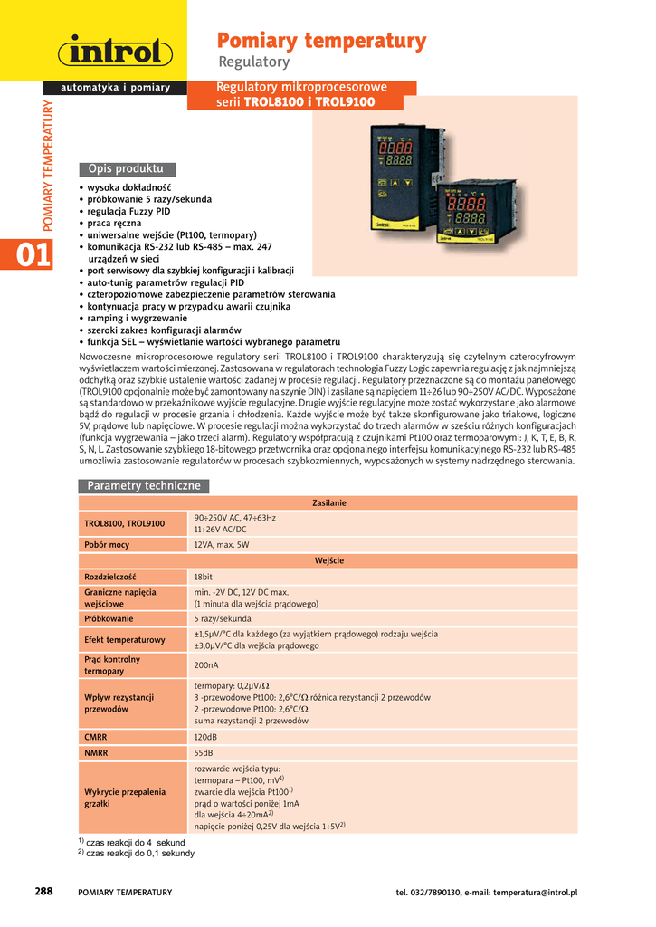 Pomiary temperatury POMIARY TEMPERATURY Regulatory 01 Regulatory mikroprocesorowe serii TROL8100 i TROL9100 Opis produktu • • • • • • wysoka dokładność próbkowanie 5 razy/sekunda regulacja Fuzzy PID praca ręczna uniwersalne wejście (Pt100, termopary) komunikacja RS-232 lub RS-485 – max. 247 urządzeń w sieci • port serwisowy dla szybkiej konfiguracji i kalibracji • auto-tunig parametrów regulacji PID • czteropoziomowe zabezpieczenie parametrów sterowania • kontynuacja pracy w przypadku awarii czujnika • ramping i wygrzewanie • szeroki zakres konfiguracji alarmów • funkcja SEL – wyświetlanie wartości wybranego parametru Nowoczesne mikroprocesorowe regulatory serii TROL8100 i TROL9100 charakteryzują się czytelnym czterocyfrowym wyświetlaczem wartości mierzonej. Zastosowana w regulatorach technologia Fuzzy Logic zapewnia regulację z jak najmniejszą odchyłką oraz szybkie ustalenie wartości zadanej w procesie regulacji. Regulatory przeznaczone są do montażu panelowego (TROL9100 opcjonalnie może być zamontowany na szynie DIN) i zasilane są napięciem 11÷26 lub 90÷250V AC/DC. Wyposażone są standardowo w przekaźnikowe wyjście regulacyjne. Drugie wyjście regulacyjne może zostać wykorzystane jako alarmowe bądź do regulacji w procesie grzania i chłodzenia. Każde wyjście może być także skonfigurowane jako triakowe, logiczne 5V, prądowe lub napięciowe. W procesie regulacji można wykorzystać do trzech alarmów w sześciu różnych konfiguracjach (funkcja wygrzewania – jako trzeci alarm). Regulatory współpracują z czujnikami Pt100 oraz termoparowymi: J, K, T, E, B, R, S, N, L. Zastosowanie szybkiego 18-bitowego przetwornika oraz opcjonalnego interfejsu komunikacyjnego RS-232 lub RS-485 umożliwia zastosowanie regulatorów w procesach szybkozmiennych, wyposażonych w systemy nadrzędnego sterowania. Parametry techniczne Zasilanie TROL8100, TROL9100 90÷250V AC, 47÷63Hz 11÷26V AC/DC Pobór mocy 12VA, max. 5W Rozdzielczość 18bit Graniczne napięcia wejściowe min. -2V DC, 12V DC max. (1 minuta dla wejścia prądowego) Próbkowanie 5 razy/sekunda Efekt temperaturowy ±1,5μV/°C dla każdego (za wyjątkiem prądowego) rodzaju wejścia ±3,0μV/°C dla wejścia prądowego Prąd kontrolny termopary 200nA Wpływ rezystancji przewodów termopary: 0,2μV/Ω 3 -przewodowe Pt100: 2,6°C/Ω różnica rezystancji 2 przewodów 2 -przewodowe Pt100: 2,6°C/Ω suma rezystancji 2 przewodów CMRR 120dB NMRR 55dB Wykrycie przepalenia grzałki rozwarcie wejścia typu: termopara – Pt100, mV1) zwarcie dla wejścia Pt1001) prąd o wartości poniżej 1mA dla wejścia 4÷20mA2) napięcie poniżej 0,25V dla wejścia 1÷5V2) Wejście 1) 2) 288 czas reakcji do 4 sekund czas reakcji do 0,1 sekundy POMIARY TEMPERATURY tel. 032/7890130, e-mail: [email protected] Pomiary temperatury POMIARY TEMPERATURY Regulatory 01 Wyjścia Przekaźnikowe parametry elektryczne: 2A/240V AC, 200 000 przełączeń dla obciążenia rezystancyjnego SSR napięcie: 5V rezystancja ograniczająca: 66Ω Liniowe rozdzielczość: 15bit, 0,02% pełnego zakresu wytrzymałość izolacji: 1000V AC efekt temperaturowy: ±0,01% zakresu/°C czas ustalenia wyjścia: 0,1s (99,9%) Triak (SSR) parametry elektryczne: 1A/240V AC prąd rozruchu: 20A dla 1 cyklu minimalny prąd obciążenia: 50mA rms prąd upływu (stan włączenia): 3mA rms napięcie (stan włączenia): 1,5V rms rezystancja izolacji: min. 1000MΩ @500V DC wytrzymałość dielektryka: 2,5kV AC przez 1 minutę Alarm parametry elektryczne: Typ C 2A/240V AC rodzaje: czasowy, odchyłka górna/dolna, wartość górna/dolna, wewnętrzne/zewnętrzne odchylenie tryby pracy: normalny, zatrzask, wstrzymanie, zatrzask/wstrzymanie czas wygrzewania: 0,1÷4553,6 minut Retransmisja sygnały wyjściowe: 4÷20mA, 0÷20mA, 0÷5mA, 1÷5V, 0÷10V rozdzielczość: 15bit, 0,01% pełnego zakresu dokładność: ±0,05% zakresu ±0,0025%/°C rezystancja obciążenia: 0÷500Ω (dla wyjścia prądowego) 10kΩ min. (dla wyjścia napięciowego) Interfejs RS-232 (1 urządzenie), RS-485 (do 247 urządzeń) Protokół transmisji Modbus RTU Adresy 1÷247 Prędkość transmisji 2,4÷38,4Kb/sekunda Bity danych 7 lub 8 Bit parzystości brak, parzysty, nieparzysty Bit(y) stopu 1 lub 2 Bufor 160B Komunikacja Interfejs użytkownika Wyświetlacz podwójny 4-cyfrowy wyświetlacz LED, górny – 10mm, dolny 8mm Liczba klawiszy sterujących 4 – panel przedni Port serwisowy automatyczne ustawienie parametrów, kalibracja i test Port komunikacyjny nadrzędne sterowanie przez komputer klasy PC tel. 032/7890130, e-mail: [email protected] POMIARY TEMPERATURY 289 Pomiary temperatury POMIARY TEMPERATURY Regulatory 01 Reglacja Wyjście I praca rewersyjna – grzanie i normalna – chłodzenie Wyjście II praca normalna – chłodzenie PID, chłodzenie P 50÷300%PB, strefa nieczułości -36,0÷36,0%PB ON-OFF histereza: 0,1÷50,0 (°C) (parametr P=0) P lub PD zakres regulacji 0÷100,0% PID wsparta o metodę Fuzzy Logic zakres proporcjonalności 0,1÷500,0°C czas całkowania 0÷1000 sekund czas różniczkowania 0÷360,0 sekund Czas jednego cyklu 0,1÷90,0 sekund Ręczne sterowanie grzanie (MV1) i chłodzenie (MV2) Auto-tuning “zimny” i “gorący” rozruch Tryb awaryjny automatyczne przełączenie w tryb ręczny w przypadku uszkodzenia czujnika bądź przetwornika analogowo-cyfrowego Ramping przyrost 0÷500,0°C/minuta lub przyrost 0÷500,0°C/godzina Temperatura otoczenia -10÷50°C Temperatura magazynowania -40÷60°C Wilgotność 0÷90% RH (bez kondensacji) Wysokość max. 2000m NPM Zanieczyszczenie powietrza drugi stopień Rezystancja izolacji min. 20MΩ @500V DC Wytrzymałość dielektryka 2kV AC, 50/60Hz przez 1 minutę Odporność na wstrząsy 10÷55Hz, 10m/s2 przez 2 godziny Odporność na upadek 200m/s2 (20g) Warunki zewnętrzne Wymiary Materiał poliwęglan, zwiększona odporność na płomień Waga TROL9100 – 150g TROL8100 – 210g Montaż TROL9100 – pan