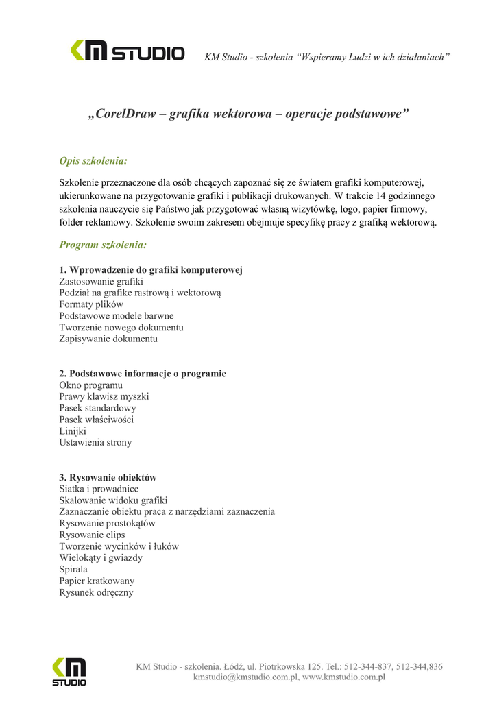 „CorelDraw – grafika wektorowa – operacje podstawowe” Opis szkolenia: Szkolenie przeznaczone dla osób chcących zapoznać się ze światem grafiki komputerowej, ukierunkowane na przygotowanie grafiki i publikacji drukowanych. W trakcie 14 godzinnego szkolenia nauczycie się Państwo jak przygotować własną wizytówkę, logo, papier firmowy, folder reklamowy. Szkolenie swoim zakresem obejmuje specyfikę pracy z grafiką wektorową. Program szkolenia: 1. Wprowadzenie do grafiki komputerowej Zastosowanie grafiki Podział na grafike rastrową i wektorową Formaty plików Podstawowe modele barwne Tworzenie nowego dokumentu Zapisywanie dokumentu 2. Podstawowe informacje o programie Okno programu Prawy klawisz myszki Pasek standardowy Pasek właściwości Linijki Ustawienia strony 3. Rysowanie obiektów Siatka i prowadnice Skalowanie widoku grafiki Zaznaczanie obiektu praca z narzędziami zaznaczenia Rysowanie prostokątów Rysowanie elips Tworzenie wycinków i łuków Wielokąty i gwiazdy Spirala Papier kratkowany Rysunek odręczny 4. Wypełnianie i obrys właściwości i praca z kolorem Rodzaje wypełnień: - wypełnienie jednolite - wypełnienie tonalne - wypełnienie deseniem - wypełnienie teksturą - wypełnienie PostScriptowe - wypełnienie narzędziem - wypełnienie interaktywne Rodzaje obrysu – właściwości 5. Kopiowanie i usuwanie obiektów, inne działania Duplikowanie obiektów Klonowanie obiektów Usuwanie obiektu Rozdzielanie i łączenie linii Krzywe Beziera - praca z węzłami - narzędzie - nóż - narzędzie - gumka - narzędzie – pisak 6. Praca z tekstem Tekst ozdobny i tekst akapitowy Określanie właściwości tekstu Dzielenie tesktu na łamy Oblewanie tekstem Wypełnienie tekstem 7. Zaawansowane działania w CorelDraw Wyrównanie i rozkład Łączenie obiektów Głębia, metamorfoza Praca z dokumentami wielostronicowymi 8. Przygotowanie dokumentu do druku Metodoliogia: - mini wykłady w Power Point - ćwiczenia przy komputerach (każdy uczestnik pracuje na osobnym komputerze) - mini filmiki szkoleniowe Informacje organizacyjne: Ilość godzin szkolenia: 14 Godziny szkolenia: 9:15-16:15 Miejsce szkolenia: Łódź, ul Piotrkowska 125 – KM Studio - szkolenia
