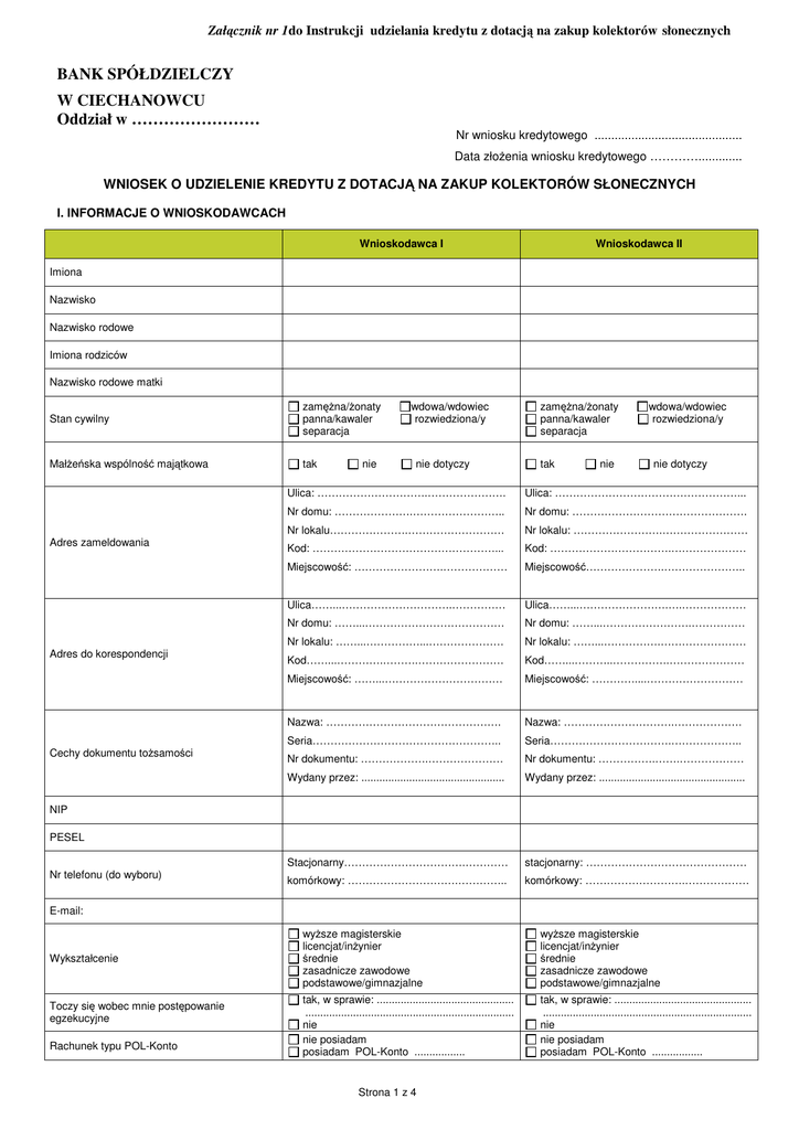 Załącznik nr 1do Instrukcji udzielania kredytu z dotacją na zakup kolektorów słonecznych BANK SPÓŁDZIELCZY W CIECHANOWCU Oddział w …………………… Nr wniosku kredytowego ............................................ Data złożenia wniosku kredytowego …………............. WNIOSEK O UDZIELENIE KREDYTU Z DOTACJĄ NA ZAKUP KOLEKTORÓW SŁONECZNYCH I. INFORMACJE O WNIOSKODAWCACH Wnioskodawca I Wnioskodawca II Imiona Nazwisko Nazwisko rodowe Imiona rodziców Nazwisko rodowe matki Stan cywilny zamężna/żonaty panna/kawaler separacja Małżeńska wspólność majątkowa tak Adres zameldowania Adres do korespondencji Cechy dokumentu tożsamości nie wdowa/wdowiec rozwiedziona/y nie dotyczy zamężna/żonaty panna/kawaler separacja tak nie wdowa/wdowiec rozwiedziona/y nie dotyczy Ulica: ………………………….…………………. Ulica: ……………………………………………... Nr domu: ………………….…………………….. Nr domu: …………………………………………. Nr lokalu………………….……………………… Nr lokalu: …………………….…………………… Kod: ……………………………………………... Kod: …………………………….………………… Miejscowość: …………………….……………… Miejscowość………………….………………….. Ulica……...………………………….…………… Ulica……...…………………….….……………… Nr domu: ……...………………………………… Nr domu: ……...…………………….…………… Nr lokalu: ……...……………...………………… Nr lokalu: ……...…………….…………………… Kod……...………….……….…………………… Kod……...………..…………….………………… Miejscowość: ……...…………………………… Miejscowość: …………....……………………… Nazwa: …………………………………………. Nazwa: ………………………….………………. Seria…………………………………………….. Seria…………………………….……………….. Nr dokumentu: ……………….………………… Nr dokumentu: …………….…….……………… Wydany przez: ................................................ Wydany przez: ................................................. Stacjonarny…………………………….………… stacjonarny: ……………………………………… komórkowy: ………………………….………….. komórkowy: ……………………….……………… NIP PESEL Nr telefonu (do wyboru) E-mail: Wykształcenie Toczy się wobec mnie postępowanie egzekucyjne Rachunek typu POL-Konto wyższe magisterskie licencjat/inżynier średnie zasadnicze zawodowe podstawowe/gimnazjalne wyższe magisterskie licencjat/inżynier średnie zasadnicze zawodowe podstawowe/gimnazjalne tak, w sprawie: .............................................. ...................................................................... nie nie posiadam posiadam POL-Konto ................. tak, w sprawie: .............................................. ...................................................................... nie nie posiadam posiadam POL-Konto ................. Strona 1 z 4 II. INFORMACJE O KREDYCIE Słownie: ……………………………..…………………….……………………………………… Kwota kredytu: …………….………………………. PLN ………………….………………………………..……………………………………………PLN Okres kredytowania: …………… miesięcy Sposób zapłaty prowizji za udzielenie kredytu wpłata gotówką przez Kredytobiorcę pobranie przez Bank ze środków na rachunku oszczędnościowo-rozliczeniowym w dniu wypłaty kwota (PLN) koszt projektu budowlano-wykonawczego rozwiązania technologicznego, dotyczącego montażu instalacji kolektorów słonecznych do ogrzewania wody użytkowej albo do ogrzewania wody użytkowej i wspomagania zasilania w energię innych odbiorników ciepła, o ile przepisy stanowią o konieczności jego przygotowania wraz z kosztorysem przedsięwzięcia, zgodnego z wymogami/ zaleceniami stawianymi przez producenta lub dostawcę kolektorów słonecznych, sporządzonego lub zatwierdzonego przez osobę posiadającą uprawnienia budowlane do projektowania w specjalności, wskazanej w art. 14 ust. 1 pkt. 4 ustawy – Prawo budowlane; Cel kredytowania koszt projektu instalacji kolektorów słonecznych do ogrzewania wody użytkowej albo do ogrzewania wody użytkowej i wspomagania zasilania w energię innych odbiorników ciepła, zawierającego w szczególności schemat przedmiotowej instalacji i opis techniczny, parametry techniczne, w tym: dane dotyczące sprawności i skuteczności (uzysku) tej instalacji wraz z kosztorysem przedsięwzięcia, sporządzonego przez osobę wskazaną w części VII niniejszego wniosku, zgodnego z wymogami/zaleceniami stawianymi przez producenta lub dostawcę kolektorów słonecznych, za wyjątkiem kosztu projektu/oferty, sporządzonego przez podmiot określony w pkt. 2 części VII niniejszego wniosku; . ............................. ............................. ............................. kolektor słoneczny, ............................. zasobnik na wodę, ............................. przewody instalacyjne, ............................. aparatura kontrolno-pomiarowa i automatyka, ............................ inne materiały i urządzenia (wskazać jakie). ............................. koszt zakupu ciepłomierza spełniającego normy PN EN 1434; koszt montażu instalacji kolektorów słonecznych; TAK .......................... ............................. koszt nabycia nowych instalacji kolektorów słonecznych, w tym: Podatek VAT stanowi koszt przedsięwzięcia i 