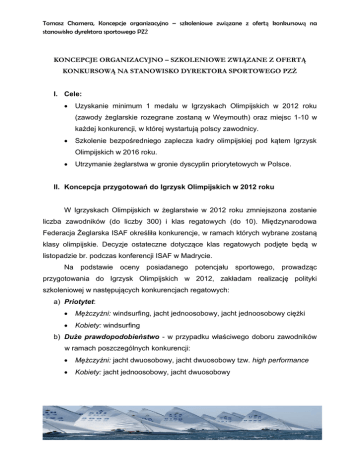 Tomasz Chamera, Koncepcje organizacyjno – szkoleniowe związane z ofertą konkursową na stanowisko dyrektora sportowego PZŻ KONCEPCJE ORGANIZACYJNO – SZKOLENIOWE ZWIĄZANE Z OFERTĄ KONKURSOWĄ NA STANOWISKO DYREKTORA SPORTOWEGO PZŻ I. Cele: Uzyskanie minimum 1 medalu w Igrzyskach Olimpijskich w 2012 roku (zawody żeglarskie rozegrane zostaną w Weymouth) oraz miejsc 1-10 w każdej konkurencji, w której wystartują polscy zawodnicy. Szkolenie bezpośredniego zaplecza kadry olimpijskiej pod kątem Igrzysk Olimpijskich w 2016 roku. Utrzymanie żeglarstwa w gronie dyscyplin priorytetowych w Polsce. II. Koncepcja przygotowań do Igrzysk Olimpijskich w 2012 roku W Igrzyskach Olimpijskich w żeglarstwie w 2012 roku zmniejszona zostanie liczba zawodników (do liczby 300) i klas regatowych (do 10). Międzynarodowa Federacja Żeglarska ISAF określiła konkurencje, w ramach których wybrane zostaną klasy olimpijskie. Decyzje ostateczne dotyczące klas regatowych podjęte będą w listopadzie br. podczas konferencji ISAF w Madrycie. Na podstawie oceny posiadanego potencjału sportowego, prowadząc przygotowania do Igrzysk Olimpijskich w 2012, zakładam realizację polityki szkoleniowej w następujących konkurencjach regatowych: a) Priotytet: Mężczyźni: windsurfing, jacht jednoosobowy, jacht jednoosobowy ciężki Kobiety: windsurfing b) Duże prawdopodobieństwo - w przypadku właściwego doboru zawodników w ramach poszczególnych konkurencji: Mężczyźni: jacht dwuosobowy, jacht dwuosobowy tzw. high performance Kobiety: jacht jednoosobowy, jacht dwuosobowy Tomasz Chamera, Koncepcje organizacyjno – szkoleniowe związane z ofertą konkursową na stanowisko dyrektora sportowego PZŻ c) Przygotowania w konkurencjach jacht balastowy mężczyzn i kobiecy jacht balastowy w formule meczowej rozważyć należy po dokonaniu analizy potencjału sportowego zawodników. Dla potrzeb realizacji celów strategicznych należy kontynuować aktualną politykę szkoleniową, dokonując niezbędnych modyfikacji wynikających z wniosków merytorycznych prezentowanych po Igrzyskach w 2008 roku. Programy szkoleniowe zawodników objętych przygotowaniami muszą uwzględniać poniższe założenia: Kontynuacja rozpoczętych działań, rozszerzanie wytyczonych kierunków, które w pełni odpowiadają realizowanym w najbardziej zaawansowanych systemach treningowych na świecie, jak australijski, czy brytyjski. Program przygotowań olimpijskich pod kątem Igrzysk w Londynie musi od początku przyjąć strukturę czteroletnią, z głównym naciskiem na Regaty Przedolimpijskie (Test Events). Indywidualizacja programów dla liderów powinna stanowić ich wzbogacenie, a nie całkowitą odmienność (wyjątkiem może być klasa RS:X, gdzie mamy dwóch zawodników klasy światowej). Współpraca z zawodnikami zagranicznymi, a nie obok nich. Plany treningowe opracowywać wspólnie z innymi ekipami (tworzyć grupy treningowe). W realizacji programów szkoleniowych należy dokładnie zaplanować współpracę ze trenerami wspomagającymi trening specjalistyczny i prowadzić szkolenie w ścisłej współpracy z tymi osobami. Cykliczne szkolenia teoretyczne dla trenerów i zawodników z zakresu poszczególnych aspektów rzeczowej struktury treningu, zwłaszcza przygotowania motorycznego, taktyki, przepisów regatowych, kontroli i trymu sprzętu. Liczba dni szkoleniowych warunkowana będzie poziomem sportowym zawodnika oraz jego przynależnością do poszczególnych grup szkoleniowych, z Tomasz Chamera, Koncepcje organizacyjno – szkoleniowe związane z ofertą konkursową na stanowisko dyrektora sportowego PZŻ możliwością dokonywania zmian w przynależności do poszczególnych grup w okresach kwartalnych (jeśli zaistnieje taka konieczność). Działania powyższe kontynuowane będą w ciągu całego cyklu olimpijskiego, mając na względzie indywidualizację przygotowań liderów w ostatnich dwóch makrocyklach. Przygotowania olimpijskie należy realizować w oparciu o 4 roczne makrocykle, których zakończenie stanowi podstawę do kontroli etapowej. Założenia makrocykli przedstawione są poniżej. Pierwszy makrocykl Programem przygotowań, po dokonaniu analizy potencjału sportowego, należy próbować objąć wszystkie konkurencje, w których prowadzone były przygotowania do poprzednich IOl. W szkoleniu, jako wyjściowe należy ponadto przyjąć następujące założenia: a) w danej konkurencji uzyskano wynik nie gorszy niż 60% stawki startujących lub oceniono zawodników, jako perspektywicznych; b) w danej konkurencji istnieje zaplecze w ilości umożliwiającej rywalizację i przygotowania na arenie krajowej (minimum 3 zawodników/załogi). Grupy szkoleniowe utworzą zawodnicy objęci przygotowaniami olimpijskimi w poprzednim cyklu oraz zawodnicy kadry narodowej, którzy spełnili kryteria wynikowe, pozwalające oczekiwać wartościowych wyników sportowych, w ocenie dyrektora sportowego i trenerów głównych. Ponadto na tym etapie do grup szkoleniowych kwalifikować należy zawodników, którzy wykazują duży potencjał sportowy, określony wynikami poprzednich sezonów i klas regatowych, w których startowali. Szkolenie realizowane będzie przez trenerów głównych lub współpracujących w z nimi asystentów. Celem zawodników objętych przygotowaniami będą satysfakcjonujące (odpowiadające indywidualnie wyznaczonym zadaniom) rezultaty w głównych imprezach międzynarodowych oraz realizacja wyznaczonych indywidualnych celów etapowych. Tomasz Chamera, Koncepcje organizacyjno – szkoleniowe związane z ofertą konkursową na stanowisko dyrektora sportowego PZŻ W tym okresie należy zatwierdzić i opublikować zasady kwalifikacji zawodników Polskiego Związku Żeglarskiego do Igrzysk Olimpijskich w 2012 roku. Drugi makrocykl Cykl szkoleniowy zostanie rozpoczęty po weryfikacji kadr olimpijskich na podstawie wyników uzyskanych podczas minionego sezonu żeglarskiego. Zakładam pozostawienie grup