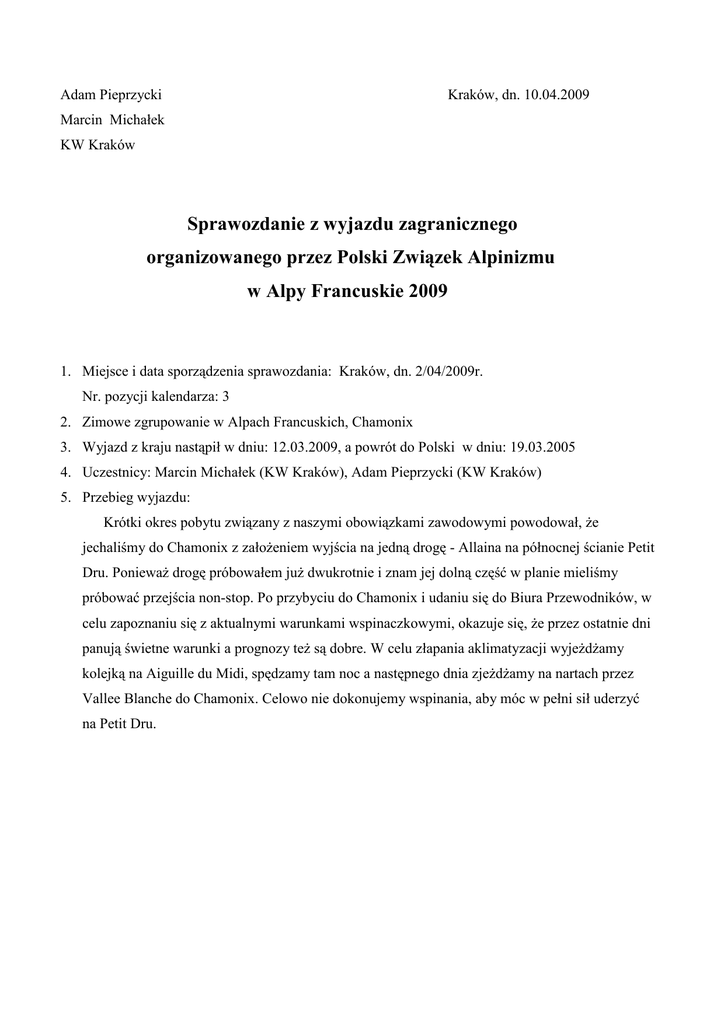 Adam Pieprzycki Kraków, dn. 10.04.2009 Marcin Michałek KW Kraków Sprawozdanie z wyjazdu zagranicznego organizowanego przez Polski Związek Alpinizmu w Alpy Francuskie 2009 1. Miejsce i data sporządzenia sprawozdania: Kraków, dn. 2/04/2009r. Nr. pozycji kalendarza: 3 2. Zimowe zgrupowanie w Alpach Francuskich, Chamonix 3. Wyjazd z kraju nastąpił w dniu: 12.03.2009, a powrót do Polski w dniu: 19.03.2005 4. Uczestnicy: Marcin Michałek (KW Kraków), Adam Pieprzycki (KW Kraków) 5. Przebieg wyjazdu: Krótki okres pobytu związany z naszymi obowiązkami zawodowymi powodował, Ŝe jechaliśmy do Chamonix z załoŜeniem wyjścia na jedną drogę - Allaina na północnej ścianie Petit Dru. PoniewaŜ drogę próbowałem juŜ dwukrotnie i znam jej dolną część w planie mieliśmy próbować przejścia non-stop. Po przybyciu do Chamonix i udaniu się do Biura Przewodników, w celu zapoznaniu się z aktualnymi warunkami wspinaczkowymi, okazuje się, Ŝe przez ostatnie dni panują świetne warunki a prognozy teŜ są dobre. W celu złapania aklimatyzacji wyjeŜdŜamy kolejką na Aiguille du Midi, spędzamy tam noc a następnego dnia zjeŜdŜamy na nartach przez Vallee Blanche do Chamonix. Celowo nie dokonujemy wspinania, aby móc w pełni sił uderzyć na Petit Dru. biwak na Aig du Midi, fot. A. Pieprzyki Plan przejścia drogi zakładał wyjazd kolejką na Grands Montets po południu, zjazd na nartach po ścianę a następnie mieliśmy od razu zacząć się wspinać tak by do następnego wieczora (a moŜe wcześniej) skończyć drogę i zjechać ścianą do nart, którymi dół do Chamonix. Wszystko było pięknie dopóki spakowani i mocno spręŜeni zjawiamy się w Argentiere. Lampa, ściana sucha, prognozy wyśmienite i … zastajemy kolejkę zepsutą. Obsługa twierdzi, Ŝe dziś i najpewniej jutro nic z tego – nasz misterny plan lgnie w gruzach, bo to są jedyne dwa dni, w które moŜemy napierać. Po dłuŜszej chwili decydujemy się wracać do Chamonix, gdzie udajemy się do Biura Przewodników w celu znalezienia celu zastępczego. Postanawiamy przejść w szybkim wypadzie tysiącmetrowy Eugoster Couluar Direct na północnej ścianie Midi. Drogę przechodziły, klika dni przed nami, dwa zespoły Słoweńskie, więc po cichu liczymy na przetorowaną ścieŜkę pod ścianę. Rano wsiadamy do pierwszej kolejki na Plan, przekazujemy depozyt z sprzętem biwakowym znajomemu Kanadyjczykowi, który wywozi nam na Midi a my udajemy się pod ścianę. Niestety wiatr zawiewa wszystkie ślady i głęboko zapadając się w śniegu mozolnie torujemy, tak, Ŝe dopiero przed 12 w południe wbijamy się w ścianę. Dolna część ściany to śnieŜny kuluar poprzedzielany małymi progami, który okazał się mocno uciąŜliwy przez duŜą ilość przepadającego śniegu bardzo utrudniającego przemieszczanie się do góry. Gdy wreszcie docieramy pod właściwe spiętrzenie jesteśmy juŜ mocno zmęczeni i okazuje się, Ŝe zostaje nam zaledwie półtorej godziny dnia. Wciągi wspinaczkowe to juŜ bardzo ładne wspinanie w czarnym i twardym lodzie, miejscami zanikającym, dzięki czemu moŜna było dać odpocząć łydkom i pozaczepiać dziabki o skałę. Kluczowe spiętrzenie to 5 długich i w sumie dość wymagających wyciągów - szkoda, Ŝe tylko pięć. Na polach lodowych pod szczytem dość długo szukamy dogodnego wyjścia na grańkę z ścieŜką doprowadzającą do budynku stacji. Dodatkowo jak na złość pada mi czołówka i muszę się poruszać bez światła. W końcu po północy docieramy do lodowej groty i odnajdując depozyt spędzamy wygodny biwak w budynku kolejki, rano zjeŜamy w dół i jeszcze tego dnia rozpoczynamy podróŜ do kraju Dokonane przejścia: 1. Aiguilles du Midi – północna ściana: Eugster Couloir Direct IV 5 1000m, 17/03/2009, Adam Pieprzycki, Marcin Michałek Marcin Michałek