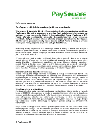 Informacja prasowa PaySquare oficjalnie zastępuje firmę montrada Warszawa, 2 kwietnia 2014 – Z początkiem kwietnia wystartowała firma PaySquare SE, która powstała w wyniku fuzji działającej dotychczas na polskim rynku montrada GmbH i holenderskiej firmy PaySquare BV. Firma oferuje rozliczenia płatności bezgotówkowych oraz wynajem terminali. Dotychczasowi klienci płynnie przeszli pod skrzydła PaySquare SE. Głównym punktem oferty nadal będzie pakiet Firma z Kartą, a wraz z rozwojem firmy pojawią się nowe usługi dodatkowe. Podstawą oferty PaySquare SE pozostaje Firma z Kartą – pakiet dla małych i średnich przedsiębiorców, a także właścicieli punktów handlowo-usługowych i gastronomicznych. Pakiet obejmuje zarówno wynajem nowoczesnego terminala, jak i rozliczenia płatności. „Z naszych statystyk wynika, że klienci dokonujący płatności kartą, są w stanie wydać więcej. Wiemy też, że brak możliwości płacenia kartą często wiąże się z utratą klientów i stopniowym spadkiem obrotów. Dlatego właśnie oferujemy pakiet Firma z Kartą, który jest w pełni dostosowany do polskich warunków rynkowych i umożliwia przedsiębiorcom akceptowanie różnego typu płatności” – mówi Jarosław Archacki, dyrektor sprzedaży w firmie PaySquare SE. Szeroki wachlarz dodatkowych usług Klienci PaySquare mogą również korzystać z usług dodatkowych takich jak akceptacja płatności zbliżeniowych za pomocą kart płatniczych oraz smartfonów wyposażonych w kartę do płatności zbliżeniowych. Kolejną usługą, która w ostatnim czasie coraz bardziej zyskuje na popularności jest cash back, czyli wypłata gotówki przy dokonywaniu płatności za towary i usługi poprzez terminal płatniczy. Dla klientów to dodatkowa zachęta do robienia zakupów w sklepie oferującym taką usługę – podczas transakcji mogą bowiem wypłacić gotówkę. Wspólna oferta z mBankiem PaySquare będzie nadal rozwijał współpracę z mBankiem. Klienci banku w ramach konta mBIZNES, stworzonego z myślą o przedsiębiorcach, otrzymają bezpłatną obsługę gotówkową w placówkach mBanku, darmowe przelewy z konta firmowego oraz atrakcyjną stawkę na dzierżawę terminala, w tym nowoczesnych, bezprzewodowych terminali gwarantujących najwyższy standard obsługi. Dzięki tej współpracy klienci otrzymują kompletny pakiet usług na atrakcyjnych warunkach. Fuzja spółek działających w ramach grupy Equens miała na celu stworzenie firmy o europejskim zasięgu i na europejskim poziomie. Co ważne, PaySquare SE nadal mocno będzie skupiał się na jasnych i prostych warunkach umów oraz wysokiej jakości obsłudze klienta. Główna siedziba firmy znajduje się w Utrechcie, w Holandii, a jej lokalne biura we Frankfurcie i w Warszawie. O PaySquare SE Dzięki PaySquare przedsiębiorcy mogą przyjmować i rozliczać płatności niemal wszystkimi kartami debetowymi i kredytowymi. Pay Square obsługuje rocznie ponad 262 miliony transakcji bezgotówkowych realizowanych przez ponad 120 000 konsumentów w Europie. Firma zajmuje się również dostawą i serwisem terminali do przyjmowania płatności oraz obsługą bankomatów. PaySquare łączy w sobie międzynarodowe doświadczenie w obsłudze płatności z lokalnym podejściem, dzięki przynależności do grupy Equens SE, jednego z największych dostawców usług systemów płatniczych w Europie. Siedziba główna PaySquare znajduje się w Utrechcie, w Holandii, a jej lokalne biura w Warszawie i w niemieckim Frankfurcie. Więcej informacji o firmie znajduje się na stronie www.paysquare.eu Kontakt dla mediów: Joanna Berger, LEWIS PR tel. 22 661 53 61 e-mail: [email protected]