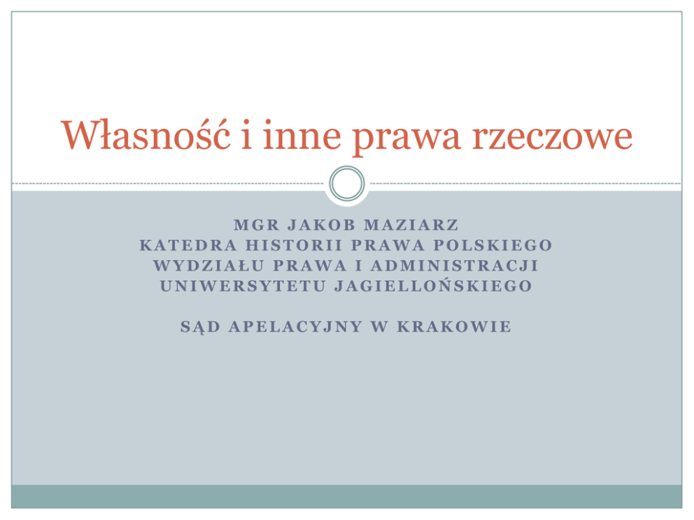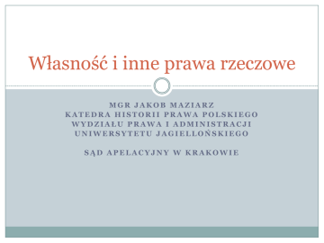 Własność i inne prawa rzeczowe MGR JAKOB MAZIARZ KATEDRA HISTORII PRAWA POLSKIEGO WYDZIAŁU PRAWA I ADMINISTRACJI UNIWERSYTETU JAGIELLOŃSKIEGO SĄD APELACYJNY W KRAKOWIE Plan zajęć 1. 2. 3. 4. 5. 6. Prawo własności i inne prawa rzeczowe. Różnice między własnością, użytkowaniem wieczystym a ograniczonymi prawami rzeczowymi (użytkowaniem, służebnością, spółdzielczym własnościowym prawem do mieszkania). Wymagania w zakresie formy przy obrocie nieruchomościami. Prawo rodzinne – alimenty. Krąg osób uprawnionych i zobowiązanych do alimentów. Obliczanie wysokości świadczeń alimentacyjnych. Alimenty dla „wiecznych studentów", rodziców i byłych małżonków. Prawo spadkowe. Możliwość odrzucenia spadku. Dziedziczenie wprost i z dobrodziejstwem inwentarza. Testament – forma i treść. Różnica między spadkobraniem a zapisem. Zachowek. Wydziedziczenie i uznanie za niegodnego dziedziczenia. Różnica między przekazaniem majątku za życia (darowizną) a po śmierci (spadkobraniem). Możliwość i warunki odwołania darowizny. Prawo zobowiązań. Sprzedaż na odległość i poza lokalem przedsiębiorstwa. Uprawnienia konsumentów związane z prawem odstąpienia od umowy sprzedaży i od umowy kredytowej. Niedozwolone klauzule stosowane w umowach z konsumentami. Postępowanie sądowe. Jak zachować się w sądzie, jak wygląda rozprawa i posiedzenie. Dlaczego procesy sądowe trwają tak długo? Prawa rzeczowe I. własność, II. użytkowanie wieczyste, III. ograniczone prawa rzeczowe: a) b) c) d) e) użytkowanie, służebność, spółdzielcze własnościowe prawo do lokalu, hipoteka, zastaw. Co nie jest prawem rzeczowym? 1. 2. 3. 4. 5. posiadanie, spółdzielcze lokatorskie prawo do lokalu, prawo do grobu, przewłaszczenie na zabezpieczenie, prawo najmu i prawo dzierżawy. Własność I. Co to jest rzecz? II. Na czym polega własność? art. 140 k.c.: w granicach określonych przez ustawy i zasady współżycia społecznego właściciel może, z wyłączeniem innych osób, korzystać z rzeczy zgodnie ze społecznogospodarczym przeznaczeniem swego prawa, w szczególności może pobierać pożytki i inne dochody z rzeczy. W tych samych granicach może rozporządzać rzeczą. III. Czy właściciel może zrobić z rzeczą? Własność = ius possidendi, disponendi, utendi – fruendi et abutendi. Jak daleko sięga własność? W jaki sposób można udowodnić swoją własność (ruchomości i nieruchomości)? 2. Jakie elementy rzeczy obejmuje własność? 3. „Górna” i „dolna” granica prawa własności nieruchomości? 4. Co nie może być przedmiotem własności? 1. woda w rzece, tlen w butli, powietrze, woda w butelce, nerka ludzka, niewyjęte z ziemi złoża mineralne, fałszywe pieniądze, piętro budynku, zwierze (pies? wieloryb?) Użytkowanie wieczyste Podobieństwa z prawem własności: I. uprawnienie do korzystania z nieruchomości z wyłączeniem innych osób, II. uprawnienie do rozporządzania swoim prawem, III. granice treści prawa własności i użytkowania wieczystego wyznaczają ustawy i zasady współżycia społecznego. Różnice między użytkowaniem wieczystym a prawem własności: I. granice prawa użytkowania wieczystego określa również umowa o oddaniu terenu w użytkowanie wieczyste, II. konieczność uiszczania opłaty, III. czasowy charakter. Spółdzielcze własnościowe prawo do lokalu Spółdzielcze własnościowe prawo do lokalu a prawo do własności nieruchomości lokalowej. Podobieństwa: 1) prawo do użytkowania lokalu, 2) prawo do rozporządzania swoim prawem. Kto jest właścicielem mieszania w którym przysługuje spółdzielcze własnościowe prawo do lokalu? Różnice konieczność uzyskania zgody spółdzielni na pewne działania – np. zmianę charakteru lokalu. Użytkowanie Różnica między użytkowaniem a prawem własności? 1. niezbywalne, 2. ustanowione na rzecz osoby fizycznej wygasa najpóźniej wraz ze śmiercią, 3. użytkowanie wygasa wskutek niewykonywania przez 10 lat. Służebność 3 rodzaje służebności: osobista, gruntowa, przesyłu. Dzieli się je na czynne (np. służebność przejazdu) i bierne (np. zakaz wznoszenia budynku ponad pewną wysokość).