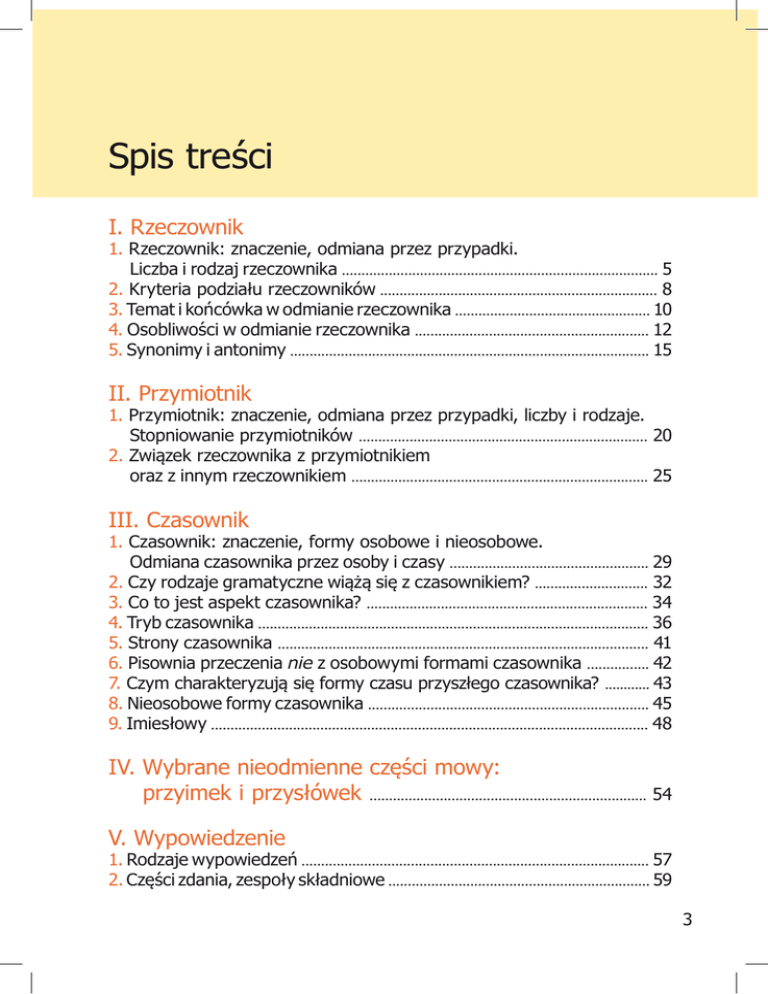 Spis treści I. Rzeczownik 1. Rzeczownik: znaczenie, odmiana przez przypadki. Liczba i rodzaj rzeczownika ................................................................................. 5 2. Kryteria podziału rzeczowników....................................................................... 8 3. Temat i końcówka w odmianie rzeczownika .................................................. 10 4. Osobliwości w odmianie rzeczownika ............................................................ 12 5. Synonimy i antonimy ............................................................................................ 15 II. Przymiotnik 1. Przymiotnik: znaczenie, odmiana przez przypadki, liczby i rodzaje. Stopniowanie przymiotników .......................................................................... 20 2. Związek rzeczownika z przymiotnikiem oraz z innym rzeczownikiem ............................................................................ 25 III. Czasownik 1. Czasownik: znaczenie, formy osobowe i nieosobowe. Odmiana czasownika przez osoby i czasy ................................................... 29 2. Czy rodzaje gramatyczne wiążą się z czasownikiem? ............................. 32 3. Co to jest aspekt czasownika? ........................................................................ 34 4. Tryb czasownika .................................................................................................... 36 5. Strony czasownika ............................................................................................... 41 6. Pisownia przeczenia nie z osobowymi formami czasownika ................ 42 7. Czym charakteryzują się formy czasu przyszłego czasownika? ............43 8. Nieosobowe formy czasownika ........................................................................ 45 9. Imiesłowy ................................................................................................................ 48 IV. Wybrane nieodmienne części mowy: przyimek i przysłówek ....................................................................... 54 V. Wypowiedzenie 1. Rodzaje wypowiedzeń ......................................................................................... 57 2. Części zdania, zespoły składniowe ................................................................... 59 3 3. Związki składniowe ................................................................................................. 61 4. Orzeczenie ............................................................................................................... 65 5. Podmiot .................................................................................................................... 70 6. Dopełnienie ............................................................................................................. 72 7. Okolicznik ................................................................................................................. 73 8. Przydawka ............................................................................................................... 75 9. Analiza składniowa zdań pojedynczych ........................................................ 77 10. Wyrazy poza związkami zdania ..................................................................... 81 VI. Związki frazeologiczne .......................................................................... 87 VII. Stylizacja biblijna .................................................................................... 94 VIII. Archaizacja ................................................................................................ 99 I 4
