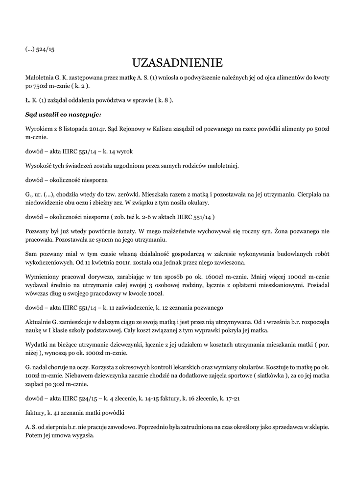 (...) 524/15 UZASADNIENIE Małoletnia G. K. zastępowana przez matkę A. S. (1) wniosła o podwyższenie należnych jej od ojca alimentów do kwoty po 750zł m-cznie ( k. 2 ). Ł. K. (1) zażądał oddalenia powództwa w sprawie ( k. 8 ). Sąd ustalił co następuje: Wyrokiem z 8 listopada 2014r. Sąd Rejonowy w Kaliszu zasądził od pozwanego na rzecz powódki alimenty po 500zł m-cznie. dowód – akta IIIRC 551/14 – k. 14 wyrok Wysokość tych świadczeń została uzgodniona przez samych rodziców małoletniej. dowód – okoliczność niesporna G., ur. (...), chodziła wtedy do tzw. zerówki. Mieszkała razem z matką i pozostawała na jej utrzymaniu. Cierpiała na niedowidzenie obu oczu i zbieżny zez. W związku z tym nosiła okulary. dowód – okoliczności niesporne ( zob. też k. 2-6 w aktach IIIRC 551/14 ) Pozwany był już wtedy powtórnie żonaty. W mego małżeństwie wychowywał się roczny syn. Żona pozwanego nie pracowała. Pozostawała ze synem na jego utrzymaniu. Sam pozwany miał w tym czasie własną działalność gospodarczą w zakresie wykonywania budowlanych robót wykończeniowych. Od 11 kwietnia 2011r. została ona jednak przez niego zawieszona. Wymieniony pracował dorywczo, zarabiając w ten sposób po ok. 1600zł m-cznie. Mniej więcej 1000zł m-cznie wydawał średnio na utrzymanie całej swojej 3 osobowej rodziny, łącznie z opłatami mieszkaniowymi. Posiadał wówczas dług u swojego pracodawcy w kwocie 100zł. dowód – akta IIIRC 551/14 – k. 11 zaświadczenie, k. 12 zeznania pozwanego Aktualnie G. zamieszkuje w dalszym ciągu ze swoją matką i jest przez nią utrzymywana. Od 1 września b.r. rozpoczęła naukę w I klasie szkoły podstawowej. Cały koszt związanej z tym wyprawki pokryła jej matka. Wydatki na bieżące utrzymanie dziewczynki, łącznie z jej udziałem w kosztach utrzymania mieszkania matki ( por. niżej ), wynoszą po ok. 1000zł m-cznie. G. nadal choruje na oczy. Korzysta z okresowych kontroli lekarskich oraz wymiany okularów. Kosztuje to matkę po ok. 100zł m-cznie. Niebawem dziewczynka zacznie chodzić na dodatkowe zajęcia sportowe ( siatkówka ), za co jej matka zapłaci po 30zł m-cznie. dowód – akta IIIRC 524/15 – k. 4 zlecenie, k. 14-15 faktury, k. 16 zlecenie, k. 17-21 faktury, k. 41 zeznania matki powódki A. S. od sierpnia b.r. nie pracuje zawodowo. Poprzednio była zatrudniona na czas określony jako sprzedawca w sklepie. Potem jej umowa wygasła. Matka małoletniej przeszła niedawno operację kręgosłupa. W styczniu 2016r. czeka ją kolejny zabieg tego typu, po którym przez 3-4 miesiące będzie korzystała z rehabilitacji. Potem chce podjąć na nowo pracę zarobkową. Aktualnie żyje ona w konkubinacie, w którym nie ma wspólnych dzieci. Jej partner nie posiada też własnego potomstwa. Zarabia on po ok. 6000zł m-cznie, z czego utrzymuje siebie i matkę G.. W razie potrzeby pomaga też finansowo w pokrywaniu potrzeb małoletniej powódki. A. S. i jej konkubent nie mają jakichkolwiek długów. Cała rodzina mieszka w nieruchomości stanowiącej spadek po rodzicach A. S.. Obecnie toczy się co do niej w Sądzie postępowanie spadkowe. Pozostali spadkobiercy mają zrzec się w nim swoich udziałów ( bez należnych im spłat ) na rzecz matki powódki. Na bieżące koszty utrzymania w/w nieruchomości składają się należności za: energię elektryczną – 225zł m-cznie, gaz z butli 58zł m-cznie, wodę 150zł m-cznie, wywóz śmieci 28zł m-cznie oraz podatek od nieruchomości 160zł na rok. dowód – k. 41-42 zeznania matki powódki Ł. K., z zawodu murarz, pozostaje dalej w nowym związku małżeńskim, z którego 3 miesiące temu narodził się mu kolejny syn. Decydując się na to dziecko pozwany miał pełną świadomość istnienia swojego obowiązku alimentacyjnego wobec G. oraz konieczności jego okresowej waloryzacji. W i połowie b.r. pozwany przez 2,5 miesiąca pracował dorywczo w Holandii przy kładzeniu glazury. Jak podaje zarabiał tam średnio po ok. 2150zł netto miesięcznie. Równocześnie z dniem 7 lipca b.r. wyrejestrował ostatecznie swoją działalność gospodarczą. Od czasu powrotu z Holandii pracuje on dorywczo w swoim zawodzie. Uzyskuje w ten sposób takie same dochody netto jak z w/w pracy w Holandii. Mieszka razem z obecną żoną i dwójką dzieci w domu jednorodzinnym teściów w G., pow. (...). Jego teść prowadzi działalność gospodarczą w zakresie produkcji domków z drewna. Teściowa zaś jest zatrudniona w Biurze Świadczeń Rodzinnych w S.. Pozwany nie zna wysokości ich miesięcznych dochodów. Całe koszty utrzymania wspomnianej nieruchomości pokrywają teściowie pozwanego. On sam kupuje tylko co tydzień jakieś artykuły żywnościowe do wspólnej kuchni, którą jego rodzina prowadzi z teściami. K. spłaca kredyt gotówkowy z ratą po 210zł m-cznie. Jego żona nie posiada żadnych zadłużeń. dowód – k. 29-31 przelewy, k. 37 pismo, k. 42 zeznania pozwanego Sąd uznał za wiarygodne wszystkie zaliczone w poczet dowodów dokumenty. Zostały one sporządzone przez uprawnione do ich wystawienia podmioty, w zakresie przypisanych im kompetencji. Żadna ze stron nie kontestowała w jakikolwiek sposób treści tych dokumentów. W taki sam sposób potraktowano zeznania obu stron ( z zastrzeżeniem jak poniżej ). Zeznania te były stanowcze, konsekwentne. W odpowiednich fragmentach znajdowały potwierdzenie w treści zaliczonych w poczet dowodów wiarygodnych dokumentów. Nie budziły zatem uzasadnionych wątpliwości Sądu co do swej zgodności z prawdą, tym bardziej, że żadna ze stron nie zgłaszała jakichkolwiek zastrzeżeń co do ich treści. Sąd nie dał jedynie wiary twierdzeniu pozwanego, że na utrzymanie swojej 4 osobowej rodziny wydaje on aktualnie po ok. 1800zł m-cznie ( k. 42 ). Twierdzenie to nie zostało poparte przez pozwanego żadnymi dowodami. Ponadto zeznając rok temu przed Sądem w poprzedniej sprawie alimentacyjnej pozwany oś