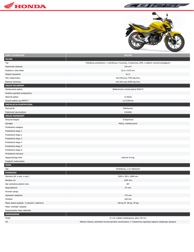 DANE TECHNICZNE CB125F Silnik Typ Chłodzony powietrzem, 1-cylindrowy, 4-suwowy, 2-zaworowy, OHC z wałkiem wyrównoważającym Pojemność skokowa 125 cm³ Średnica x skok tłoka 52,4 x 57,8 mm Stopień sprężania 9,2:1 Moc maksymalna 10,6 KM przy 7750 obr,/min, Moment obrotowy 10,2 Nm przy 6250 obr,/min, Układ paliwowy Dawkowanie paliwa Elektroniczny wtrysk paliwa PGM-FI Średnica gardzieli przepustnicy Zbiornik paliwa Zużycie paliwa wg WMTC** 13 litrów 1,9 l/100 km Instalacja elektryczna Rozrusznik Pojemność akumulatora Elektryczny 12V/6AH Układ napędowy Skrzynia biegów Sprzęgło 5-stopniowa Mokre, wielotarczowe Przełożenie wstępne Przełożenie biegu 1 Przełożenie biegu 2 Przełożenie biegu 3 Przełożenie biegu 4 Przełożenie biegu 5 Przełożenie biegu 6 Przełożenie końcowe Napęd tylnego koła łańcuch O-ring Prędkość maksymalna Rama Typ Grzbietowa, z rur stalowych Podwozie Wymiary (dł. x szer. x wys.) Rozstaw osi Kąt nachylenia główki ramy Wyprzedzenie 2035 x 765 x 1080 mm 1295 mm 26° 97 mm Promień skrętu Wysokość siedzenia 775 mm Prześwit 160 mm Masa własna pojazdu (z płynami i paliwem) 128 kg (P: 58 kg; 70 kg) Masa “suchego” pojazdu Dopuszczalna masa całkowita Zawieszenie Przód Tył 31 mm widelec teleskopowy, skok 120 mm Wahacz stalowy, podwójne konwencjonalne amortyzatory z 5-stopniową regulacją napięcia wstępnego sprężyny DANE TECHNICZNE CB125F Hamulce Przód Tył 240 mm pojedynczy tarczowy, 2-tłoczkowy zacisk 130 mm, bębnowy Opony Przód 80/100 – 18M/C 47P Tył 90/90 – 18M/C 51P ** Uwaga: podane wielkości zostały zmierzone przez Hondę w standardowych warunkach badawczych opisanych w WMTC (World Motorcycle Test Cycle). Pomiary wykonywano na hamowni podwoziowej na pojeździe w wersji standardowej, z kierowcą, bez wyposażenia dodatkowego. Rzeczywiste zużycie paliwa może odbiegać od podanego powyżej zależnie od stylu jazdy, stanu technicznego motocykla, warunków pogodowych i drogowych, ciśnienia powietrza w oponach, zainstalowanego wyposażenia, przewożonego bagażu, wagi kierowcy i pasażera itp. Podane wielkości są prowizoryczne,a producent zastrzega prawo do ich zmiany bez powiadomienia. Dokładnych informacji udzieli lokalny Dealer lub Dystrybutor pojazdów Hondy. Producent zastrzega sobie prawo do zmiany specyfikacji wyposażeniowej łącznie z kolorami bez wcześniejszego powiadomienia w każdym dogodnym dla siebie momencie. Zmiany mogą być zarówno znaczące, jak i mniej znaczne, przy czym producent dołoży wszelkich starań, aby szczegóły zawarte w niniejszej specyfikacji były zgodne z rzeczywistością. Niniejsza publikacja nie stanowi oferty handlowej. Sprzedaż wszystkich produktów odbywa się za pośrednictwem Dystrybutora lub Dealera w oparciu o standardowe warunki sprzedaży i gwarancji, których kopie dostępne są na życzenie u Dystrybutora lub Dealera.