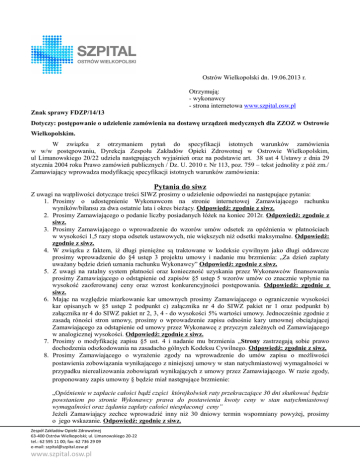 Ostrów Wielkopolski dn. 19.06.2013 r. Otrzymują: - wykonawcy - strona internetowa www.szpital.osw.pl Znak sprawy FDZP/14/13 Dotyczy: postępowanie o udzielenie zamówienia na dostawę urządzeń medycznych dla ZZOZ w Ostrowie Wielkopolskim. W związku z otrzymaniem pytań do specyfikacji istotnych warunków zamówienia w w/w postępowaniu, Dyrekcja Zespołu Zakładów Opieki Zdrowotnej w Ostrowie Wielkopolskim, ul Limanowskiego 20/22 udziela następujących wyjaśnień oraz na podstawie art. 38 ust 4 Ustawy z dnia 29 stycznia 2004 roku Prawo zamówień publicznych / Dz. U. 2010 r. Nr 113, poz. 759 – tekst jednolity z póź zm./ Zamawiający wprowadza modyfikację specyfikacji istotnych warunków zamówienia: Pytania do siwz Z uwagi na wątpliwości dotyczące treści SIWZ prosimy o udzielenie odpowiedzi na następujące pytania: 1. Prosimy o udostępnienie Wykonawcom na stronie internetowej Zamawiającego rachunku wyników/bilansu za dwa ostatnie lata i okres bieżący. Odpowiedź: zgodnie z siwz. 2. Prosimy Zamawiającego o podanie liczby posiadanych łóżek na koniec 2012r. Odpowiedź: zgodnie z siwz. 3. Prosimy Zamawiającego o wprowadzenie do wzorów umów odsetek za opóźnienia w płatnościach w wysokości 1,5 razy stopa odsetek ustawowych, nie większych niż odsetki maksymalne. Odpowiedź: zgodnie z siwz. 4. W związku z faktem, iż długi pieniężne są traktowane w kodeksie cywilnym jako długi oddawcze prosimy wprowadzenie do §4 ustęp 3 projektu umowy i nadanie mu brzmienia: „Za dzień zapłaty uważany będzie dzień uznania rachunku Wykonawcy” Odpowiedź: zgodnie z siwz. 5. Z uwagi na ratalny system płatności oraz konieczność uzyskania przez Wykonawców finansowania prosimy Zamawiającego o odstąpienie od zapisów §5 ustęp 5 wzorów umów co znacznie wpłynie na wysokość zaoferowanej ceny oraz wzrost konkurencyjności postępowania. Odpowiedź: zgodnie z siwz. 6. Mając na względzie miarkowanie kar umownych prosimy Zamawiającego o ograniczenie wysokości kar opisanych w §5 ustęp 2 podpunkt c) załącznika nr 4 do SIWZ pakiet nr 1 oraz podpunkt b) załącznika nr 4 do SIWZ pakiet nr 2, 3, 4 - do wysokości 5% wartości umowy. Jednocześnie zgodnie z zasadą róności stron umowy, prosimy o wprowadzenie zapisu odnośnie kary umownej obciążającej Zamawiającego za odstąpienie od umowy przez Wykonawcę z przyczyn zależnych od Zamawiającego w analogicznej wysokości. Odpowiedź: zgodnie z siwz. 7. Prosimy o modyfikację zapisu §5 ust. 4 i nadanie mu brzmienia „Strony zastrzegają sobie prawo dochodzenia odszkodowania na zasadacho gólnych Kodeksu Cywilnego. Odpowiedź: zgodnie z siwz. 8. Prosimy Zamawiającego o wyrażenie zgody na wprowadzenie do umów zapisu o możliwości postawienia zobowiązania wynikającego z niniejszej umowy w stan natychmiastowej wymagalności w przypadku nierealizowania zobowiązań wynikających z umowy przez Zamawiającego. W razie zgody, proponowany zapis umowny § będzie miał następujące brzmienie: „Opóźnienie w zapłacie całości bądź części którejkolwiek raty przekraczające 30 dni skutkować będzie powstaniem po stronie Wykonawcy prawa do postawienia kwoty ceny w stan natychmiastowej wymagalności oraz żądania zapłaty całości niespłaconej ceny” Jeżeli Zamawiający zechce wprowadzić inny niż 30 dniowy termin wspomniany powyżej, prosimy o jego wskazanie. Odpowiedź: zgodnie z siwz. Zespół Zakładów Opieki Zdrowotnej 63-400 Ostrów Wielkopolski; ul. Limanowskiego 20-22 tel.: 62 595 11 00; fax: 62 736 29 09 e-mail: [email protected] www.szpital.osw.pl 9. W związku z brakiem w przedłożonym do SIWZ projektach umów jakichkolwiek zabezpieczeń dla terminowej spłaty zobowiązań wynikających z realizacji przedmiotowego postępowania (weksel In blanco wraz z deklaracją wekslową, zastaw rejestrowy), prosimy o wyrażenie zgody na wprowadzenie do umowy odpowiednich zapisów: a) Dotyczących zastawu rejestrowego: Na zabezpieczenie spłaty wierzytelności Zamawiający ustanowi na rzecz Wykonawcy zastaw rejestrowy na _____________________________, czego dowodem będzie prawomocne postanowienie Sądu Rejonowego w _______________ Krajowego Rejestru Zastawów. Brak ustanowienia zastawu rejestrowego uprawnia Wykonawcę do wypowiedzenia umowy. Odpowiedź: zgodnie z siwz. b) Dotyczących weksla in blanco: Na zabezpieczenie spłaty wierzytelności Zamawiający wystawia i przekazuje w dniu zawarcia umowy do rąk Wykonawcy weksel własny in blanco oraz zobowiązuje się do jego zapłaty zgodnie z deklaracją wekslową stanowiącą załącznik do niniejszej umowy i przepisami prawa wekslowego Odpowiedź: zgodnie z siwz. Prosimy o wyrażenie zgody na ustanowienie zastawu rejestrowego na rzecz podmiotu finansującego co przyczyni się do obniżenia ceny oferty oraz podniesienia konkurencyjności postępowania. Odpowiedź: zgodnie z siwz. 10.Czy Zamawiający wyrazi zgodę, by sądem właściwym do rozstrzygania sporów wynikających z umów był sąd właściwy dla siedziby Wykonawcy? Odpowiedź: zgodnie z siwz. Pakiet nr 3 - kardiomonitory Pytanie 1 ad. pkt. 1 Czy Zamawiający dopuści do przetargu kardiomonitor modułowy o przekątnej 14” i rozdzielczości 1280x800 pixeli? Odpowiedź: Zgodnie z siwz. Pytanie 2 ad. pkt. 2 Czy Zamawiający dopuści do przetargu kardiomonitor modułowy o wadze łącznej do 9 kg? Odpowiedź: Zgodnie z siwz. Pytanie 3 ad. pkt. 4 Czy Zamawiający dopuści do przetargu kardiomonitor kompaktowy sterowany przy pomocy pokrętła oraz przycisków funkcyjnych? Odpowiedź: Nie, zgodnie z siwz. Pytanie 4 ad. pkt. 16 Czy Zamawiający dopuści do przetargu kardiomonitor bez możliwości tworzenia raportów 12 odprowadzeniowego EKG? Odpowiedź: Zgodnie z siwz. Pytanie 5 ad. pkt. 20 Czy Zamawiający dopuści do przetargu kardiomonitor modułowy ze wzmocnieniem regulowanych w następujący sposób: x0,25; x1; x2; x4 ? Odpowiedź: Zgodnie z siwz. Pytanie 6 ad. pkt. 20 Czy Zamawiający 