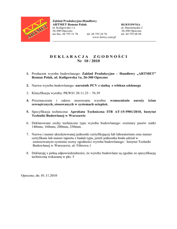 Zakład Produkcyjno-Handlowy ARTMET Roman Polak ul. Kuligowska 1 a 26-300 Opoczno tel./fax. 44 755 31 78 tel. 44 755 24 76 www.listwy.com.pl HURTOWNIA ul. Staromiejska 2 26-300 Opoczno tel. 44 755 68 94 DEKLARACJA ZGODNOŚCI Nr 10 / 2010 1. Producent wyrobu budowlanego: Zakład Produkcyjno – Handlowy „ARTMET” Roman Polak, ul. Kuligowska 1a, 26-300 Opoczno 2. Nazwa wyrobu budowlanego: naroŜnik PCV z siatką z włókna szklanego 3. Klasyfikacja wyrobu: PKWiU 28.11.23 – 76.39 4. Przeznaczenie i zakres stosowania wyrobu: wzmocnienie zewnętrznych, stosowanych w systemach ociepleń. naroŜy ścian 5. Specyfikacja techniczna: Aprobata Techniczna ITB AT-15-5901/2010, Instytut Techniki Budowlanej w Warszawie 6. Deklarowane cechy techniczne typu wyrobu budowlanego: rozmiary pasów siatki 140mm, 160mm, 200mm, 250mm. 7. Nazwa i numer akredytowanej jednostki certyfikującej lub laboratorium oraz numer certyfikatu lub numer raportu z badań typu, jeŜeli jednostka brała udział w zastosowanym systemie oceny zgodności wyrobu budowlanego: Instytut Techniki Budowlanej w Warszawie, ul. Filtrowa 1 8. Deklaruję z pełną odpowiedzialności, Ŝe wyroby budowlane są zgodne ze specyfikacją techniczną wskazaną w pkt. 5 Opoczno, dn. 01.11.2010