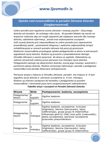 www.ljosmodir.is Opieka nad noworodkiem w poradni Zdrowia Dziecka (Ungbarnavernd) Celem porodni jest regularna ocena zdrowia i rozwoju psycho – fizycznego dziecka od narodzin do szóstego roku życia. W poradni kładzie się nacisk na wsparcie rodziców aby oni mogli zapewnić jak najlepsze warunki dla rozwoju dziecka, udzielanie informacji, porad oraz wykonywanie szczepień. Jeśli rozwój dziecka jest nieprawidłowy to celem poradni jest zapewnienie prawidłowej opieki , postawienie diagnozy i wybranie odpowiedniej terapii rehabilitacyjnej w ramach poradni zdrowia lub poza jej granicami. Rodzicom noworodków przysługuje opieka pielęgniarska w domu w pierwszych tygodniach życia dziecka. Rodzice są proszeni o powiadomienie danego Ośrodka Zdrowia o swoim powrocie do domu ze szpitala. Odwiedziny są zależne od potrzeb rodziny przez pierwsze trzy miesiące życia dziecka. Pielęgniarka zajmuje się obejrzeniem dziecka, oceną jego rozwoju, ważeniem i pomiarem głowy dziecka. Rodzice otrzymuja informacje i porady o pielęgnacji noworodka oraz porady dotyczace samopoczucia. Pierwsza wizyta u lekarza w Ośrodku Zdrowia-‐ poradni ma miejsce w 6-‐tym tygodniu życia dziecka a pierwsze szczepienie w 3-‐cim miesiącu. Rodzice są również zachęcani do kontaktu z pielęgniarka w poradni noworodków i niemowlat poza tymi zorganizowanymi odwiedzinami. Tabelka wizyt i szczepień w Poradni Zdrowia Dziecka Wizyta Wiek Postepowanie: badania, szczepienia Pielęgniarka/ 6 lekarz tygodni Ogólne badanie. 9 tygodni Ogólne badanie. Pielęgniarka Ogólne badanie, szczepienia: krztusiec (kíghósta), błonica (barnaveiki), tężec (stífkrampa), grypa grupy B (Haemofilus Pielęgniarka/ 3 influenzae gerð b) (Hib) oraz polio (mænusótt); lekarz miesiące jedna szczepionka, pierwsze szczepienie przeciwko pneumokokom. Pielęgniarka Ogólne badanie, szczepienia: krztusiec 5 (kíghósta), błonica (barnaveiki), tężec miesięcy (stífkrampa), grypa grupy B (Haemofilus 1 www.ljosmodir.is influenzae gerð b) (Hib) oraz polio (mænusótt); jedna szczepionka, drugie szczepienie przeciwko pneumokokom. Ogólne badanie, szczepienie przeciwko Pielęgniarka/ 6 Meningókokkum C. lekarz miesięcy Pielęgniarka Ogólne badanie, szczepienie przeciwko 8 Meningókokkum C. miesięcy Pielęgniarka/ 10 Ogólne badanie. lekarz miesięcy Pielęgniarka Ogólne badanie, szczepienia: krztusiec (kíghósta), błonica (barnaveiki), tężec (stífkrampa), grypa grupy B (Haemofilus 12 influenzae gerð b) (Hib) oraz polio (mænusótt); miesięcy jedna szczepionka, 3cie szczepienie przeciwko pneumokokom. Ogólne badanie, szczepienie przeciwko odrze, śwince i różyczce (mislingum, hettusótt og Pielęgniarka/ 18 lekarz miesięcy rauðum hundum) jedna szczepionka. Pielęgniarka/ Ogólne badanie; badanie rozwoju dziecka za 2 ½ roku lekarz pomoca testu PEDS oraz BRIGANCE. Dentysta 3 lata Profilaktyczne badanie dentystyczne. Bezpłatne badanie dentystyczne wykonane przez dentyste zatrudnionego przez (Sjúkratryggingar Íslands) Państwową firmę ubezpieczeniową. Ważne żeby to badanie było przeprowadzone przed ukończeniem czwartego roku życia dziecka. www.heilsugæsla.is – Ung-‐ og smábarnavernd 2