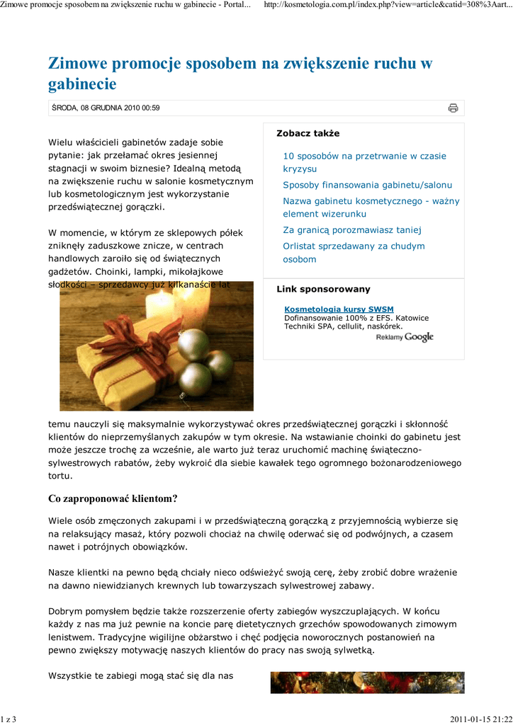 Zimowe promocje sposobem na zwiększenie ruchu w gabinecie - Portal... 1z3 http://kosmetologia.com.pl/index.php?view=article&catid=308%3Aart... Zimowe promocje sposobem na zwiększenie ruchu w gabinecie ŚRODA, 08 GRUDNIA 2010 00:59 Zobacz także Wielu właścicieli gabinetów zadaje sobie pytanie: jak przełamać okres jesiennej 10 sposobów na przetrwanie w czasie stagnacji w swoim biznesie? Idealną metodą kryzysu na zwiększenie ruchu w salonie kosmetycznym Sposoby finansowania gabinetu/salonu lub kosmetologicznym jest wykorzystanie przedświątecznej gorączki. Nazwa gabinetu kosmetycznego - ważny element wizerunku W momencie, w którym ze sklepowych półek Za granicą porozmawiasz taniej zniknęły zaduszkowe znicze, w centrach Orlistat sprzedawany za chudym handlowych zaroiło się od świątecznych osobom gadżetów. Choinki, lampki, mikołajkowe słodkości – sprzedawcy już kilkanaście lat Link sponsorowany Kosmetologia kursy SWSM Dofinansowanie 100% z EFS. Katowice Techniki SPA, cellulit, naskórek. www.nowoczesnakosmetologia.pl temu nauczyli się maksymalnie wykorzystywać okres przedświątecznej gorączki i skłonność klientów do nieprzemyślanych zakupów w tym okresie. Na wstawianie choinki do gabinetu jest może jeszcze trochę za wcześnie, ale warto już teraz uruchomić machinę świątecznosylwestrowych rabatów, żeby wykroić dla siebie kawałek tego ogromnego bożonarodzeniowego tortu. Co zaproponować klientom? Wiele osób zmęczonych zakupami i w przedświąteczną gorączką z przyjemnością wybierze się na relaksujący masaż, który pozwoli chociaż na chwilę oderwać się od podwójnych, a czasem nawet i potrójnych obowiązków. Nasze klientki na pewno będą chciały nieco odświeżyć swoją cerę, żeby zrobić dobre wrażenie na dawno niewidzianych krewnych lub towarzyszach sylwestrowej zabawy. Dobrym pomysłem będzie także rozszerzenie oferty zabiegów wyszczuplających. W końcu każdy z nas ma już pewnie na koncie parę dietetycznych grzechów spowodowanych zimowym lenistwem. Tradycyjne wigilijne obżarstwo i chęć podjęcia noworocznych postanowień na pewno zwiększy motywację naszych klientów do pracy nas swoją sylwetką. Wszystkie te zabiegi mogą stać się dla nas 2011-01-15 21:22 Zimowe promocje sposobem na zwiększenie ruchu w gabinecie - Portal... 2z3 http://kosmetologia.com.pl/index.php?view=article&catid=308%3Aart... ogromną szansą na zwiększenie ruchu w gabinecie. Właściwa promocja skierowana do odpowiedniej grupy docelowej pomoże nam zainteresować stałych klientów innymi zabiegami, a także przyciągnąć do gabinetu nowe osoby. Możemy zastosować różne rodzaje rabatów, np.: seria 5 lub10 pełnopłatnych zabiegów + 6/11-sty gratis przy wykupieniu 5 zabiegów, 30 procent rabatu na inny zabieg darmowy zabieg w przypadku przyprowadzenia nowego klienta na zabieg w określonych ramach cenowych drobny gratisowy zabieg dla każdego klienta, który zapisze się do nas w określonym przedziale czasowym Idealny zabieg „gratisowy” Pamiętajmy, że nasza promocyjna oferta musi być tak skonstruowana, aby okazała się opłacalna. Idealny gratisowy zabieg powinien posiadać następujące cechy: mało nas kosztuje robi duże wrażenie zajmuje niewiele czasu (możemy go „wcisnąć” w wolne miejsca pomiędzy zapisanymi klientami) Nie zapominajmy o stałych klientkach Jeśli mamy w okolicy dużą konkurencję powinniśmy zatroszczyć się o nasze stałe klientki i pokazać im, że doceniamy ich przywiązanie. Nastawienie akcji promocyjnych wyłącznie na pozyskiwanie nowych klientów może zniechęcić osoby, które regularnie nas odwiedzają. Dobrym sposobem na docenienie przywiązania i lojalności w stosunku do naszego gabinetu może być stworzenie kart stałego klienta i nagradzanie dodatkowymi zabiegami osób, które przyprowadzają do nas swoich znajomych. Jak dotrzeć do klienta? Możemy roznosić ulotki, przekazywać wiadomości pocztą pantoflową, ale najskuteczniejsze (przynajmniej w przypadku stałych klientek) jest rozsyłanie informacji o akcjach promocyjnych drogą mailową. Jeśli nie mamy wystarczającej bazy adresów e-mail, możemy rozesłać wiadomość smsem. Pamiętajmy jednak, że nasz przekaz w tym przypadku musi być odpowiednio skonstruowany. Klient powinien przeczytać te kilka zdań i nabrać chęci na skorzystanie z naszych usług. Dla gabinetów, które nie posiadają możliwości rozsyłania newsletterów, czy smsowych powiadomień najlepszą formą promocji będzie przyciąganie nowych osób z polecenia. Jeśli nasza klientka dostanie rabat za przyprowadzenie przyjaciółki i przy okazji obie skorzystają ze 2011-01-15 21:22 Zimowe promocje sposobem na zwiększenie ruchu w gabinecie - Portal... 3z3 http://kosmetologia.com.pl/index.php?view=article&catid=308%3Aart... świątecznej promocji – sukces gwarantowany. Warto wspomnieć, że w naszych ofertach powinniśmy znaleźć miejsce na klauzulę, że określone promocje nie łączą się ze sobą, albo przynajmniej tak konstruować ofertę marketingową, żeby nie stracić zbyt wiele na nadmiernie rozbudowanej gamie rabatów. Kiedy rozpocząć akcje promocyjne? Teraz! Okres przedświąteczny charakteryzuje się tym, że zazwyczaj nikt na nic nie ma czasu. Organizacja świąt, zakupy, prezenty, szukanie ofert sylwestrowych... Jeśli chcemy, aby nasz potencjalny klient zdążył zapoznać się z tym, co mu proponujemy, podjąć decyzję o przyjściu do gabinetu i znaleźć dogodny dla siebie i dla nas termin – musimy zacząć już teraz. Jest to najlepsza metoda na wyprzedzenie konkurencji. Pamiętajmy, że promocje są skuteczne tyko wtedy, kiedy ich czas jest ściśle ograniczony. Rabaty mają na celu przyciągnięcie do nas nowych klientów i zaprezentowanie zabiegów tym, którzy pewnie głównie z powodów finansowych nie zdecydowali się jak dotąd z nich skorzystać. Jeśli będziemy w nieskończoność przeciągać promocje