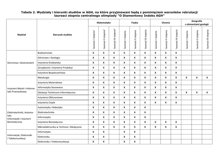 Tabela 2. Wydziały i kierunki studiów w AGH, na które przyjmowani będą z pominięciem warunków rekrutacji laureaci stopnia centralnego olimpiady "O Diamentowy Indeks AGH" laureaci II stopnia laureaci III stopnia laureaci I stopnia laureaci II stopnia laureaci III stopnia X X X X X X Górnictwo i Geologia X X X X X X X X X Inżynieria Środowiska X X X X X X X X X Zarządzanie i Inżynieria Produkcji X X X X X X X X X Inżynieria Bezpieczeństwa X X X X X X X X X Metalurgia X X X X X X X X X Inżynieria Materiałowa X X X X X X X X X X X X X X X X X X X X X X X X X X X Inżynieria Obliczeniowa X X X X X X X X X Inżynieria Ciepła X X X X X X X X X Automatyka i Robotyka X X X X X X Elektrotechnika X X X X X X Informatyka X X X X X X Inżynieria Biomedyczna X X X X X X X X X Mikroelektronika w Technice i Medycynie X X X X X X X X X Informatyki, Elektroniki i Telekomunikacji Informatyka X X X X Elektronika X X X X Elektronika i Telekomunikacja X X X X laureaci III stopnia laureaci I stopnia X laureaci II stopnia laureaci III stopnia3 X laureaci I stopnia laureaci II stopnia2 X Kierunek studiów Inżynierii Metali i Informa- Informatyka Stosowana tyki Przemysłowej Edukacja Techniczno Informatyczna Elektrotechniki, Automatyki, Informatyki i Inżynierii Biomedycznej Geografia z elementami geologii Chemia Budownictwo Wydział Górnictwa i Geoinżynierii Fizyka laureaci I stopnia1 Matematyka X X X X X X laureaci I stopnia1 laureaci II stopnia2 laureaci I stopnia laureaci II stopnia laureaci III stopnia laureaci I stopnia laureaci II stopnia laureaci III stopnia laureaci I stopnia laureaci II stopnia laureaci III stopnia Geologii, Geofizyki i Ochrony Środowiska Geodezji Górniczej i Inżynierii Środowiska Inżynierii Materiałowej i Ceramiki Odlewnictwa Geografia z elementami geologii Chemia Elektronika i Telekomunikacja (w j. angielskim) X X X X Teleinformatyka X X X X Mechanika i Budowa Maszyn X X X X X X X X X Automatyka i Robotyka X X X X X X X X X Mechatronika X X X X X X X X X Inżynieria Akustyczna X X X X X X X X X Inżynieria Mechaniczna i Materiałowa X X X X X X X X X Ekologiczne Źródła Energii X X X X X X X X X X X X Geofizyka X X X X X X X X X X X X Górnictwo i Geologia X X X X X X X X X X X X Informatyka Stosowana X X X X X X X X X X X X Inżynieria Środowiska X X X X X X X X X X X X Ochrona Środowiska X X X X X X X X X X X X Turystyka i Rekreacja X X X X X X X X X X X X Geodezja i Kartografia X X X X X X X X X Inżynieria Środowiska X X X X X X X X X X X X Technologia Chemiczna X X X X X X X X X Inżynieria Materiałowa X X X X X X X X X Ceramika X X X X X X X X X Chemia Budowlana X X X X X X X X X Metalurgia X X X X X X X X X X X X Wydział Inżynierii Mechanicznej i Robotyki Fizyka laureaci III stopnia3 Matematyka Kierunek studiów laureaci II stopnia2 laureaci III stopnia3 laureaci I stopnia laureaci II stopnia laureaci III stopnia laureaci I stopnia laureaci II stopnia laureaci III stopnia laureaci I stopnia laureaci II stopnia laureaci III stopnia Wiertnictwa, Nafty i Gazu Zarządzania Energetyki i Paliw Fizyki i Informatyki Stosowanej Matematyki Stosowanej Humanistyczny 1 X X X X X X X X X X X X Inżynieria Procesów Odlewniczych X X X X X X X X X X X X Metalurgia X X X X X X X X X Inżynieria Materiałowa X X X X X X X X X Zarządzanie i Inżynieria Produkcji X X X X X X X X X Górnictwo i Geologia X X X X X X X X X Inżynieria Naftowa i Gazownicza X X X X X X X X X Zarządzanie X X X X X X X X X Zarządzanie i Inżynieria Produkcji X X X X X X X X X Informatyka i Ekonometria X X X X X X X X X Technologia Chemiczna X X X X X X X X X X X X Energetyka X X X X X X X X X X X X Fizyka Techniczna X X X X X X Fizyka Medyczna X X X X X X X X X Informatyka Stosowana X X X X X X Matematyka X X X Kierunek studiów Socjologia - Kulturoznawstwo - Laureaci I stopnia to osoby, które zajęły miejsce w pierwszej dziesiątce finalistów Laureaci II stopnia to osoby, które zajęły miejsce w drugiej dziesiątce finalistów 3 Laureaci III stopnia to finaliści, którzy uzyskali co najmniej 70% możliwych do zdobycia punktów, a nie zostali finalistami I lub II stopnia. 2 Geografia z elementami geologii Chemia Wirtotechnologia Wydział Metali Nieżelaznych Fizyka laureaci I stopnia1 Matematyka