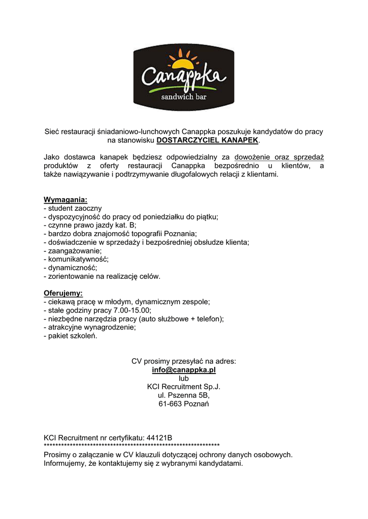 Sieć restauracji śniadaniowo-lunchowych Canappka poszukuje kandydatów do pracy na stanowisku DOSTARCZYCIEL KANAPEK. Jako dostawca kanapek będziesz odpowiedzialny za dowożenie oraz sprzedaż produktów z oferty restauracji Canappka bezpośrednio u klientów, a także nawiązywanie i podtrzymywanie długofalowych relacji z klientami. Wymagania: - student zaoczny - dyspozycyjność do pracy od poniedziałku do piątku; - czynne prawo jazdy kat. B; - bardzo dobra znajomość topografii Poznania; - doświadczenie w sprzedaży i bezpośredniej obsłudze klienta; - zaangażowanie; - komunikatywność; - dynamiczność; - zorientowanie na realizację celów. Oferujemy: - ciekawą pracę w młodym, dynamicznym zespole; - stałe godziny pracy 7.00-15.00; - niezbędne narzędzia pracy (auto służbowe + telefon); - atrakcyjne wynagrodzenie; - pakiet szkoleń. CV prosimy przesyłać na adres: [email protected] lub KCI Recruitment Sp.J. ul. Pszenna 5B, 61-663 Poznań KCI Recruitment nr certyfikatu: 44121B ************************************************************* Prosimy o załączanie w CV klauzuli dotyczącej ochrony danych osobowych. Informujemy, że kontaktujemy się z wybranymi kandydatami.