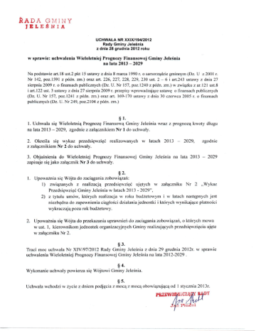 &ADA GMINY JELEŚNIA UCHWAŁA NR XXIX/194/2012 Rady Gminy Jeleśnia z dnia 28 grudnia 2012 roku w sprawie: uchwalenia Wieloletniej Prognozy Finansowej Gminy Jeleśnia na lata 2013-2029 Na podstawie art. 18 ust.2 pkt 15 ustawy z dnia 8 marca 1990 r. o samorządzie gminnym (Dz. U z 2001 r. Nr 142, poz.1591 z późn. zm.) oraz art. 226, 227, 228, 229, 230 ust. 2 - 6 i art.243 ustawy z dnia 27 sierpnia 2009 r. o finansach publicznych (Dz. U . Nr 157, poz.1240 z późn. zm.) w związku z ar. 121 ust.8 i art. 122 ust. 3 ustawy z dnia 27 sierpnia 2009 r. przepisy wprowadzające ustawę o finansach publicznych (Dz. U. Nr 157, poz. 1241 z późn. zm.) oraz art. 169-170 ustawy z dnia 30 czerwca 2005 r. o finansach publicznych (Dz. U. Nr 249, poz.2104 z późn. zm.) 1. Uchwala się Wieloletnią Prognozę Finansową Gminy Jeleśnia wraz z prognozą kwoty długu na lata 2013 - 2029, zgodnie z załącznikiem Nr 1 do uchwały. 2. Określa się wykaz przedsięwzięć z załącznikiem Nr 2 do uchwały. realizowanych w latach 2013 - 2029, zgodnie 3. Objaśnienia do Wieloletniej Prognozy Finansowej Gminy Jeleśnia na lata 2013 - 2029 zapisuje się jako załącznik Nr 3 do uchwały. §2. 1. Upoważnia się Wójta do zaciągania zobowiązań: 1) związanych z realizacją przedsięwzięć ujętych w załączniku Nr 2 „Wykaz Przedsięwzięć Gminy Jeleśnia w latach 2013 - 2029", 2) z tytułu umów, których realizacja w roku budżetowym i w latach następnych jest niezbędna do zapewnienia ciągłości działania jednostki i których wynikające płatności wykraczają poza rok budżetowy. 2. Upoważnia się Wójta do przekazania uprawnień do zaciągania zobowiązań, o których mowa w ust. 1, kierownikom jednostek organizacyjnych Gminy realizujących przedsięwzięcia ujęte w załączniku Nr 2. §3. Traci moc uchwała N r XlV/97/2012 Rady Gminy Jeleśnia z dnia 29 grudnia 2012r. w sprawie uchwalenia Wieloletniej Prognozy Finansowej Gminy Jeleśnia na lata 2012-2029 . § 4 . Wykonanie uchwały powierza się Wójtowa Gminy Jeleśnia. § 5 . Uchwała wchodzi w życie z dniem podjęcia z mocą z mocą obowiązującą od 1 stycznia 2013r. PRZEWOPICZĄW SADY W . HADA GMINY JELEŚNIA Wieloletnia Prognoza Finansowa Gminy Jeleśnia na lata 2013-2029 Załącznik Nr 1 do uchwały Nr XXIX/194/2012 Rady Gminy Jeleśnia z dnia 28 grudnia 2012r. z tego: z tego: w tym: w tym: w tym: W y d a t k i bicZącc (bez odsetek i Wyszczególnienie kredytów i D o c h o d y ogoleni dochody dochody b i e ż ą c e środki z U E * majątkowe ze s p r z e d a ż y majątku p o ż y c z e k oraz środki z U E * wye m i to wa ny c h papierów na projekty gwarancje i prowizji od: poręczenia na wynagrodzenia i składki od n i c h naliczane związane z z tytułu podlegające funkcjonowanie gwarancji i wyłączeniu z m organów JST poręczeń limitów spłaty wartościowych) wydatki bieżące objęte limitem art. 226 ust. 4 ufp realizowane przy udziale środków, o k t ó r y c h mowa zobowiązań z w art. 5 ust. 1 art. 243 pkt 2 ufp/169sufp Lp. Formuła 2013 2014 2015 1 (la) + ( l la lal lb lc 2 ld 2a 2b 2c 2d 2c 2f b) 38 726 164.03 35 645 790,03 33 944 720.00 18 275 568.00 3 621 632.00 1 155 828,00 1 155 828,00 1 716 250,84 1 652 200,00 42 376 140.00 42 .376 140.00 496 372,00 3 080 374.00 31 473 271.00 18 000 000.00 3 625 000,00 1 120 131,00 1 120 131,00 1 153 554.84 1 120 131,00 40 731 683,00 40 731 683,00 33 543 323.00 17 900 000.00 3 627 000,00 1 084 433,00 1 084 433,00 1 132 530,24 1 084 433,00 34 554 954,00 17 875 000.00 3 670 000.00 1 048 736,00 1 048 736,00 1 048 736,00 1 048 736,00 35 293 902.00 17 850 000.00 3 673 000,00 1 013 038.00 1 013 038,00 1 013 038,00 1 013 038,00 36 202 456,00 17 850 000.00 3 674 000,00 977 341,00 977 341,00 977 341,00 977 341,00 37 269 274,00 ] " S25 001.i.oi 3 676 000,00 941 643.00 941 643.00 941 643,00 941 643,00 37 941 688,87 17 800 000,00 3 678 000,00 905 946,00 905 946,00 905 946,00 905 946,00 39 955 769.00 17 810 000.00 3 680 000,00 870 245,00 870 245,00 870 245,00 870 245,00 41 164 357,00 17 850 000,00 3 683 000.00 890 132,00 890 132,00 890 132.00 890 132,00 41 609 870,00 17 880 000,00 3 685 000,00 851 718,00 851 718,00 851 718,00 851 718,00 42 120 753,00 17 880 000.00 3 688 000.00 588 193.00 588 193.00 588 193.00 588 193.00 42 534 012,00 17 890 000.00 3 690 000.00 42 621 806,00 18 0 0 0 000,00 3 693 000.00 42 859 908,00 18 050 000,00 3 696 000,00 43 096 484,00 18 050 000,00 oyy ooo.on 43 151 570,00 18 060 000.00 3 700 000,00 100 000,00 2 980 374.(K) 2016 42 488 318,00 42 488 318.00 2017 42 710 308.00 42 710 308.00 2018 43 360 311.00 43 360 31 1.00 44 968 893,00 2019 44 968 893,00 45 1 15 448,00 2020 45 115 448.00 2021 44 205 728.00 44 205 728,00 2022 45 635 620.00 45 635 620,00 2023 46 091 976.00 46 091 976,00 2024 46 552 896,00 46 552 896.00 2025 47 018 425.00 47 018 425,00 2026 47 921 806.00 47 921 806.00 2027 48 159 908.00 48 159 908.00 2028 49 196 484.00 49 196 484.00 49 224 027.IM 2029 49 224 027,00 * środki, o których mowa w art.. 5 ust. 1 pkt 2 ustawy o finansach publicznych Strona 1 w tym: z tego: w tym: Nadwyżka w tym: w tym:: h u d ż £ t o w a z. lal u b i e g ł y c h kwota plus wolne Inne środki, o Wyszczególnienie Różnica (1- których mowa 2) w art. 217 u s t . l pkt 6 przychody nie na pokrycie związane z deficytu zaciągnięciem Środki d o na pokrycie dyspozycji deficytu (3+4+5) Spłata i obsługa dhigu długu ufp, rozchody z wyłączeń z tytułu spłaty rat art. 243 ust. 3 kapitałowych pkt 1 ufp oraz oraz w y k u p u art. 169 ust. 3 papierów sufp wartościowych przypadająca angażowane w Formuła (D-(2) 4 d ł u g u np. na o b s ł u g ę odsetki i udzielane długu dyskonto pożyczki) 7b 7bl 8 Środki do dyspozycji (6-7-8) budżetowy bieżącego 3 (bez spłaty wydatki b i e ż ą c e na dany rok b u d ż e c i e roku Lp. Inne rozchody 4a 5 5a IKK) 6 7 (3+4+5) (7a) + (7b) 7a 7al 9 (6)-(7)-(8) 2013 4 781 444.03 5 381 444.03 3 195 656,00 2 227 493.00 968 163.00 968 1