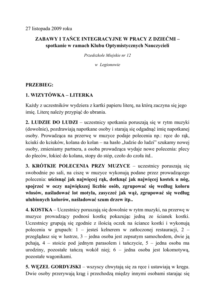 27 listopada 2009 roku ZABAWY I TAŃCE INTEGRACYJNE W PRACY Z DZIEĆMI – spotkanie w ramach Klubu Optymistycznych Nauczycieli Przedszkole Miejskie nr 12 w Legionowie PRZEBIEG: 1. WIZYTÓWKA – LITERKA KaŜdy z uczestników wydziera z kartki papieru literę, na którą zaczyna się jego imię. Literę naleŜy przypiąć do ubrania. 2. LUDZIE DO LUDZI – uczestnicy spotkania poruszają się w rytm muzyki (dowolnie), pozdrawiają napotkane osoby i starają się odgadnąć imię napotkanej osoby. Prowadząca na przerwę w muzyce podaje polecenia np.: ręce do rąk, kciuki do kciuków, kolana do kolan – na hasło „ludzie do ludzi” szukamy nowej osoby, zmieniamy partnera, a osoba prowadząca wydaje nowe polecenia: plecy do pleców, łokieć do kolana, stopy do stóp, czoło do czoła itd.. 3. KRÓTKIE POLECENIA PRZY MUZYCE – uczestnicy poruszają się swobodnie po sali, na ciszę w muzyce wykonują podane przez prowadzącego polecenia: uścisnąć jak najwięcej rąk, dotknąć jak najwięcej kostek u nóg, spojrzeć w oczy największej liczbie osób, zgrupować się według koloru włosów, naśladować lot motyla, zasyczeć jak wąŜ, zgrupować się według ulubionych kolorów, naśladować szum drzew itp.. 4. KOSTKA – Uczestnicy poruszają się dowolnie w rytm muzyki, na przerwę w muzyce prowadzący podnosi kostkę pokazując jedną ze ścianek kostki. Uczestnicy grupują się zgodnie z ilością oczek na ściance kostki i wykonują polecenia w grupach: 1 – jesteś kelnerem w zatłoczonej restauracji, 2 – przeglądasz się w lustrze, 3 – jedna osoba jest zepsutym samochodem, dwie ją pchają, 4 – stoicie pod jednym parasolem i tańczycie, 5 – jedna osoba ma urodziny, pozostałe tańczą wokół niej; 6 – jedna osoba jest lokomotywą, pozostałe wagonikami. 5. WĘZEŁ GORDYJSKI – wszyscy chwytają się za ręce i ustawiają w kręgu. Dwie osoby przerywają krąg i przechodzą między innymi osobami starając się jak najbardziej zaplątać osoby w kręgu, tworząc duŜy supeł. Następnie osoby, które przerwały krąg chwytają się ponownie za ręce. Zadaniem uczestników jest rozplątanie węzła bez puszczania rąk partnerów, tak, by powrócić do pierwotnego ustawienia – kręgu. 6. TEEFILAT – taniec tysiąca opowieści (Sabat czarownic – ustawienie w kole bez trzymania – czarownice lecą na Łysą górę, trzymają w dłoniach miotłę, w połowie drogi spotykają koleŜanki, chwytają się za ręce i lecą dalej razem – wchodzą na górę – 4 – kroki do środka koła – wymachy rąk – na szczycie wieje wiatr, następnie wychodzimy z koła 4 krokami – czarownice schodzą z góry, Ŝegnają się – obrót dookoła siebie). 7. PIZZICATO 8. HUNGARIEN DANCE 9. CARNEVALIO – ustawienie w węŜe 4,5 osobowe lub po kole. Taniec składa się z dwóch części: - marsz z wytupywaniem nogami rytmu (1,2 – 1,2,3 – ćwierćnuta, ćwierćnuta, dwie ósemki i ćwierćnuta ); - zmieniamy kierunek – podskoki z nogi na nogę (moŜna wykorzystać apaszki) 10. TRZĘSIENIE ZIEMI – tworzymy 3 osobowe kółeczka, 2 osoby tworzą zamek – osoba w środku kółka „księŜniczka”. Prowadzący wydaje polecenia: Zamek – księŜniczka stoi nieruchomo, dwie osoby tworzące zamek zmieniają księŜniczkę; KsięŜniczka – zamki stoją nieruchomo, księŜniczki zmieniają zamki; Trzęsienie ziemi – wszyscy zmieniają role, prowadzący włącza się do zabawy. Osoba, która pozostała poza trójką, dalej wydaje polecenia. 11. CZAROWNICE – wszyscy uczestnicy zabawy to grzeczne dzieci. Jedna osoba, posiadająca jakiś atrybut to czarownica, która zaczarowuje dzieci poprzez dotknięcie dziecka swoim atrybutem. Zaczarowana osoba ni moŜe się ruszać – stoi nieruchomo. Odczarować ją mogą inne osoby poprzez dotknięcie lub przejście między nogami. 12. ZAJĄCZEK I MYSLIWY – uczestnicy zabawy stoją lub siedzą w kręgu. Wybieramy dwie osoby: jedna to zajączek, druga myśliwy. Zajączek i myśliwy mają zawiązane oczy i chodzą wewnątrz koła – pozostali uczestnicy to las. Myśliwy chce złapać zajączka i próbuje go zlokalizować. Jeśli klaśnie raz, zajączek odpowiada mu dwoma klaśnięciami. Myśliwy ma trzy takie szanse. DODATKOWE TAŃCE CIASTO CZARY – MARY KASZTANKI ? INFORMACJA ZWROTNA Organizację spotkania oceniam na (zaznacz cyfrę na osi) 1 2 3 4 5 3 4 5 Atrakcyjność zabaw ……….. 1 2 WaŜne było dla mnie …………………………………………………………… …………………………………………………………………………………… Data ………………….