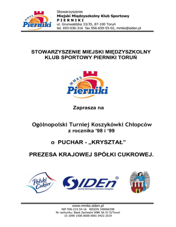 Stowarzyszenie Miejski Międzyszkolny Klub Sportowy PIERNIKI ul. Grunwaldzka 33/35, 87-100 Toruń tel. 693-036-316 fax 056-659-55-02, [email protected] STOWARZYSZENIE MIEJSKI MIĘDZYSZKOLNY KLUB SPORTOWY PIERNIKI TORUŃ Zaprasza na Ogólnopolski Turniej Koszykówki Chłopców z rocznika ’98 i ‘99 o PUCHAR - „KRYSZTAŁ” PREZESA KRAJOWEJ SPÓŁKI CUKROWEJ. www.mmks.siden.pl NIP 956-215-54-16 REGON 340066398 Nr rachunku: Bank Zachodni WBK SA IV O/Toruń 15 1090 1506 0000 0001 0423 2519 Stowarzyszenie Miejski Międzyszkolny Klub Sportowy PIERNIKI ul. Grunwaldzka 33/35, 87-100 Toruń tel. 693-036-316 fax 056-659-55-02, [email protected] 1. Termin: 24 - 26 Luty 2012 2. Organizator: Stowarzyszenie Miejski Międzyszkolny Klub Sportowy PIERNIKI Toruń 3. Miejsce: Turniej odbędzie się w Toruniu na dwóch halach sportowych. Każda kategoria wiekowa gra swoje mecze w jednej hali. - rocznik ’98 – hala sportowa ZSPS I VIII LO - rocznik ’99 – hala sportowa Zespołu Szkół Samochodowych 4. System rozgrywek: - Planowany udział 6 drużyn w każdej kategorii wiekowej (organizator zastrzega sobie prawo doboru drużyn), - Turniej rozgrywany będzie systemem każdy z każdym w każdej kategorii wiekowej, - Czas gry: 4 x 10 minut czystej gry [5 minutowa dogrywka], - Sędziowie uprawnieni. 5. Zakwaterowanie: - Internat Zespołu Szkół Przemysłu Spożywczego i VIII LO w Toruniu w pokojach dwu, trzy i czteroosobowych na tapczanach (swoje śpiwory). 6. Wyżywienie: - Piątek (obiad, kolacja) - Sobota (śniadanie, obiad, kolacja) - Niedziela (śniadanie, obiad) 7. Koszt: - 160 złotych za osobę. 8. Wpisowe - 200 złotych za drużynę – jako dowód wpłaty wystawiamy „KP” (Klub, który wystawi drużyny w obu kategoriach wiekowych 350 zł) www.mmks.siden.pl NIP 956-215-54-16 REGON 340066398 Nr rachunku: Bank Zachodni WBK SA IV O/Toruń 15 1090 1506 0000 0001 0423 2519 Stowarzyszenie Miejski Międzyszkolny Klub Sportowy PIERNIKI ul. Grunwaldzka 33/35, 87-100 Toruń tel. 693-036-316 fax 056-659-55-02, [email protected] 9. Dodatkowe informacje: - dla trzech pierwszych drużyn w każdej kategorii wiekowej ufundowane zostaną puchary, - nagrody dla najlepszej piątki w każdej kategorii wiekowej, - nagroda dla MVP turnieju w każdej kategorii wiekowej, - dyplomy dla każdego zespołu, - terminarz gier zostanie ustalony po potwierdzeniu udziału przez wszystkie drużyny. Klub pobiera kaucję w wysokości 300pln jako zabezpieczenie przed powstałymi szkodami – wpłata w pierwszym dniu turnieju, zwrot po zakończeniu turnieju. Termin zgłoszeń drużyn do turnieju upływa z dniem 8 Luty 2012 roku, Wpłatę wpisowego należy dokonać na konto Klubu do 13 lutego 2012 roku. 15 1090 1506 0000 0001 0423 2519 BZ WBK 4O/Toruń z dopiskiem - turniej. Osoba kontaktowa: Kierownik Klubu Michał Sula Telefon kontaktowy: 693-036-316 E-mail: [email protected] www.mmks.siden.pl NIP 956-215-54-16 REGON 340066398 Nr rachunku: Bank Zachodni WBK SA IV O/Toruń 15 1090 1506 0000 0001 0423 2519