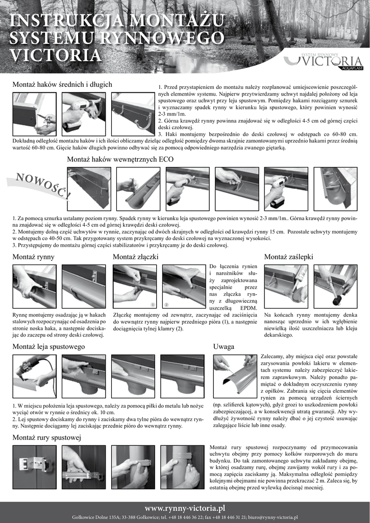 INSTRUKCJA MONTAŻU SYSTEMU RYNNOWEGO VICTORIA Montaż haków średnich i długich 1. Przed przystapieniem do montażu należy rozplanować umiejscowienie poszczególnych elementów systemu. Najpierw przytwierdzamy uchwyt najdalej położony od leja spustowego oraz uchwyt przy leju spustowym. Pomiędzy hakami rozciągamy sznurek i wyznaczamy spadek rynny w kierunku leja spustowego, który powinien wynosić 2-3 mm/1m. 2. Górna krawędź rynny powinna znajdować się w odległości 4-5 cm od górnej części deski czołowej. 3. Haki montujemy bezpośrednio do deski czołowej w odstępach co 60-80 cm. Dokładną odległość montażu haków i ich ilości obliczamy dzieląc odległość pomiędzy dwoma skrajnie zamontowanymi uprzednio hakami przez średnią wartość 60-80 cm. Gięcie haków długich powinno odbywać się za pomocą odpowiedniego narzędzia zwanego giętarką. Montaż haków wewnętrznych ECO N OW OŚ Ć! 1. Za pomocą sznurka ustalamy poziom rynny. Spadek rynny w kierunku leja spustowego powinien wynosić 2-3 mm/1m.. Górna krawędź rynny powinna znajdować się w odległości 4-5 cm od górnej krawędzi deski czołowej. 2. Montujemy dolną część uchwytów w rynnie, zaczynając od dwóch skrajnych w odległości od krawędzi rynny 15 cm. Pozostałe uchwyty montujemy w odstępach co 40-50 cm. Tak przygotowany system przykręcamy do deski czołowej na wyznaczonej wysokości. 3. Przystępujemy do montażu górnej części stabilizatorów i przykręcamy je do deski czołowej. Montaż rynny Montaż złączki Rynnę montujemy osadzając ją w hakach stalowych rozpoczynając od osadzenia po stronie noska haka, a następnie dociskając do zaczepu od strony deski czołowej. Montaż zaślepki Do łączenia rynien i narożników służy zaprojektowana specjalnie przez nas złączka rynny z długowieczną uszczelką EPDM. Złączkę montujemy od zewnątrz, zaczynając od zaciśnięcia do wewnątrz rynny najpierw przedniego pióra (1), a następnie dociągnięcia tylnej klamry (2). Na końcach rynny montujemy denka nanosząc uprzednio w ich wgłębienie niewielką ilość uszczelniacza lub kleju dekarskiego. Montaż leja spustowego Uwaga 1. W miejscu położenia leja spustowego, należy za pomocą piłki do metalu lub nożyc wyciąć otwór w rynnie o średnicy ok. 10 cm. 2. Lej spustowy dociskamy do rynny i zaciskamy dwa tylne pióra do wewnątrz rynny. Następnie dociągamy lej zaciskając przednie pióro do wewnątrz rynny. Zalecamy, aby miejsca cięć oraz powstałe zarysowania powłoki lakieru w elementach systemu należy zabezpieczyć lakierem zaprawkowym. Należy ponadto pamiętać o dokładnym oczyszczeniu rynny z opiłków. Zabrania się cięcia elementów rynien za pomocą urządzeń ściernych (np. szlifierek kątowych), gdyż grozi to uszkodzeniem powłoki zabezpieczającej, a w konsekwencji utratą gwarancji. Aby wydłużyć żywotność rynny należy dbać o jej czystość usuwając zalegające liście lub inne osady. Montaż rury spustowej Montaż rury spustowej rozpoczynamy od przymocowania uchwytu obejmy przy pomocy kołków rozporowych do muru budynku. Do tak zamontowanego uchwytu zakładamy obejmę, w której osadzamy rurę, obejmę zawijamy wokól rury i za pomocą zapięcia zaciskamy ją. Maksymalna odległość pomiędzy kolejnymi obejmami nie powinna przekraczać 2 m. Zaleca się, by ostatnią obejmę przed wylewką docisnąć mocniej. www.rynny-victoria.pl Gołkowice Dolne 135A; 33-388 Gołkowice; tel. +48 18 446 36 22; fax +48 18 446 31 21; [email protected]