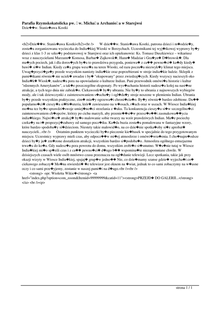 Parafia Rzymskokatolicka pw. �w. Micha�a Archanio�a w Starejwsi Dzie��w. Stanis�awa Kostki <h2>Dzie��w. Stanis�awa Kostki</h2><br /> W dzie��w. Stanis�awa Kostki, patrona dzieci i m�odzie�y, zosta�a zorganizowana wycieczka do India�kiej Wioski w Borzychach. Uczestnikami tej wyj�tkowej wyprawy by�y dzieci z klas 1-3 ze szko�y podstawowej w Starejwsi oraz ich opiekunowie: Ks. Tomasz Duszkiewicz – wikariusz wraz z nauczycielami Marzann� Komosa, Barbar� Zajkowsk�, Hann� Madziar i Gra�yn� D�browsk�. Dla ma�ych pociech, jak i dla doros�ych by�a to prawdziwa przygoda, poniewa� z ca�� pewno�ci� ka�dy kiedy� bawi� si�w Indian. Kiedy ca�a grupa wesz�a na teren Wioski, od razu poczu�a niezwyk�y klimat tego miejsca. Uwag�przyci�ga�y przede wszystkim namioty india�kie oraz poprzebierani w stroje india�kie ludzie. Sklepik z pami�tkami równie� nie uciek� uwadze i by� "okupowany" przez zwiedzaj�cych. Kiedy wszyscy nacieszyli oko India�k� Wiosk�, nadesz�a pora na opowiadanie o kulturze Indian. Pani przewodnik omówi�a historie i kultur "rdzennych Amerykanów", a tak�e poszczególne eksponaty. Po wys�uchaniu historii nadesz�a kolej na nast�ne atrakcje, a tych tego dnia nie zabrak�o. Ciekawostk� by�y ubrania. Nie by�y to ubrania z najnowszych wybiegów mody, ale i tak dziewczynki z zainteresowaniem s�ucha�y i ogl�da�y stroje noszone w plemieniu Indian. Ubrania by�y przede wszystkim praktyczne, zim� mia�y ogrzewa�i chroni�cia�o. By�y równie� bardzo zdobione. Du�� popularno�ci� cieszy�a si�bi�uteria, któr� zawieszano na w�osach, r�ach oraz w uszach. W Wiosce India�kiej mo�na tez by�o sprawdzi�swoje umiej�no�ci strzelania z �uku. Ta konkurencja cieszy�a si�w szczególno�ci zainteresowaniem ch�opców, którzy po cichu marzyli, aby przenie��si�w przesz�o��i zasmakowa��ycia india�kiego. Najwi�sz� atrakcj� by�o malowanie sobie twarzy na wzór prawdziwych Indian. Ma�e pociechy czeka�y na t� propozycj�zabawy od samego pocz�tku. Ka�da buzia zosta�a pomalowana w fantazyjne wzory, które bardzo spodoba�y si�dzieciom. Niestety takie malowid�o, na co dzie�nie spotka�oby si�z aprobat� nauczycieli...<br /> Ostatnim punktem wycieczki by�o pieczenie kie�basek w specjalnie do tego przygotowanym miejscu. Uczestnicy wyprawy mieli czas, aby odpocz��w mi�ej atmosferze i omówi�wra�enia. I cho�najm�odsze dzieci by�y ju� zm�zone dostatkiem atrakcji, wszystkim bardzo si�podoba�o. Atmosfera ogólnego entuzjazmu trwa�a do ko�a. Gdy nadesz�a pora powrotu do domu, wszystkim zrobi�o si�smutno. W�a�nie tutaj w Wiosce India�kiej mi�o sp�zili czas i z ca�� pewno�ci� d�ugo b�� wspomina�te niezapomniane chwile. W dzisiejszych czasach wiele osób mnóstwo czasu przeznacza na ogl�danie telewizji. Lecz spotkania, takie jak przy okazji wizyty w Wiosce India�kiej, spajaj� grup�w jedno�� Nie, co dzie�mamy szanse gdzie� wyjecha�i co� ciekawego zobaczy� Mo�na stwierdzi� �e telewizor jest oknem na �wiat, jednak to co sami zobaczymy na w�asne oczy i co sami prze�yjemy, zostanie w naszej pami�i na d�ugo.<br /><br /> <strong> opr. Wioletta Wikie�</strong> <a href="index.php?option=com_zoom&Itemid=99999999&catid=11"><strong>PRZEJD� DO GALERII...</strong> </a> <br /><p> strona 1 / 1