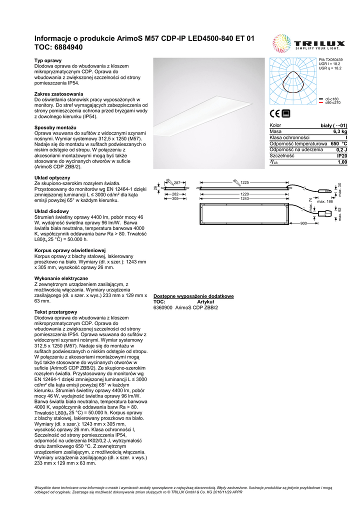 Informacje o produkcie ArimoS M57 CDP-IP LED4500-840 ET 01 TOC: 6884940 Typ oprawy Diodowa oprawa do wbudowania z kloszem mikropryzmatycznym CDP. Oprawa do wbudowania z zwiększonej szczelności od strony pomieszczenia IP54. Plik TX050439 UGR l = 18.2 UGR q = 18.2 Zakres zastosowania Do oświetlania stanowisk pracy wyposażonych w monitory. Do stref wymagających zabezpieczenia od strony pomieszczenia ochrona przed bryzgami wody z dowolnego kierunku (IP54). c0-c180 c90-c270 Kolor biały ( ···01) Masa 6,3 kg Klasa ochronności I Odporność temperaturowa 650 °C Odporność na uderzenia 0,2 J Szczelność IP20 η LB 1,00 1225 max. 30 287 26 282 305 Układ diodowy Strumień świetlny oprawy 4400 lm, pobór mocy 46 W, wydajność świetlna oprawy 96 lm/W. Barwa światła biała neutralna, temperatura barwowa 4000 K, współczynnik oddawania barw Ra > 80. Trwałość L80(tq 25 °C) = 50.000 h. 1220 1243 max. 74 Układ optyczny Ze skupiono-szerokim rozsyłem światła. Przystosowany do monitorów wg EN 12464-1 dzięki zmniejszonej luminancji L ≤ 3000 cd/m² dla kąta emisji powyżej 65° w każdym kierunku. max. 186 900 Korpus oprawy oświetleniowej Korpus oprawy z blachy stalowej, lakierowany proszkowo na biało. Wymiary (dł. x szer.): 1243 mm x 305 mm, wysokość oprawy 26 mm. Wykonanie elektryczne Z zewnętrznym urządzeniem zasilającym, z możliwością włączania. Wymiary urządzenia zasilającego (dł. x szer. x wys.) 233 mm x 129 mm x 63 mm. Tekst przetargowy Diodowa oprawa do wbudowania z kloszem mikropryzmatycznym CDP. Oprawa do wbudowania z zwiększonej szczelności od strony pomieszczenia IP54. Oprawa wsuwana do sufitów z widocznymi szynami nośnymi. Wymiar systemowy 312,5 x 1250 (M57). Nadaje się do montażu w sufitach podwieszanych o niskim odstępie od stropu. W połączeniu z akcesoriami montażowymi mogą być także stosowane do wycinanych otworów w suficie (ArimoS CDP ZBB/2). Ze skupiono-szerokim rozsyłem światła. Przystosowany do monitorów wg EN 12464-1 dzięki zmniejszonej luminancji L ≤ 3000 cd/m² dla kąta emisji powyżej 65° w każdym kierunku. Strumień świetlny oprawy 4400 lm, pobór mocy 46 W, wydajność świetlna oprawy 96 lm/W. Barwa światła biała neutralna, temperatura barwowa 4000 K, współczynnik oddawania barw Ra > 80. Trwałość L80(tq 25 °C) = 50.000 h. Korpus oprawy z blachy stalowej, lakierowany proszkowo na biało. Wymiary (dł. x szer.): 1243 mm x 305 mm, wysokość oprawy 26 mm. Klasa ochronności I, Szczelność od strony pomieszczenia IP54, odporność na uderzenia IK02/0,2 J, wytrzymałość drutu żarnikowego 650 °C. Z zewnętrznym urządzeniem zasilającym, z możliwością włączania. Wymiary urządzenia zasilającego (dł. x szer. x wys.) 233 mm x 129 mm x 63 mm. Dostępne wyposażenie dodatkowe TOC: Artykuł 6360900 ArimoS CDP ZBB/2 Wszystkie dane techniczne oraz informacje o masie i wymiarach zostały sporządzone z najwyższą starannością. Błędy zastrzeżone. Ilustracje produktów są jedynie przykładowe i mogą odbiegać od oryginału. Zastrzega się możliwość dokonywania zmian służących ro © TRILUX GmbH & Co. KG 2016/11/29 APPR max. 92 Sposoby montażu Oprawa wsuwana do sufitów z widocznymi szynami nośnymi. Wymiar systemowy 312,5 x 1250 (M57). Nadaje się do montażu w sufitach podwieszanych o niskim odstępie od stropu. W połączeniu z akcesoriami montażowymi mogą być także stosowane do wycinanych otworów w suficie (ArimoS CDP ZBB/2).