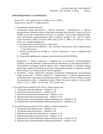 ZAŁĄCZNIK NR 2 DO UMOWY NR DZP - 362- 47/2016 Z DNIA .2016 R. OPIS PRZEDMIOTU ZAMÓWIENIA Kody CPV: 64.11.00.00-0, 64.11.20.00-4, 64.11.30.00-1 Nazewnictwo wg CPV: Usługi pocztowe 1. Przedmiotem zamówienia jest: świadczenie usług pocztowych w obrocie krajowym i zagranicznym, w zakresie przyjmowania, przemieszczania i doręczania przesyłek pocztowych o wadze od 0 g do 20 000 g oraz ich ewentualnych zwrotów na potrzeby Uniwersytetu Warszawskiego. Przez powszechne usługi pocztowe należy rozumieć, zgodnie z art. 3 pkt 25 ustawy Prawo Pocztowe z dnia 12 czerwca 2003 roku (tj. Dz. U. 2008 r., Nr 189, poz. 1159 z późn. zm.), usługi polegające na: a) przyjmowaniu, przemieszczaniu i doręczaniu: - przesyłek listowych do 2000 g, w tym przesyłek poleconych i listów zagranicznych w tym poleconych, - paczek pocztowych do l0 000 g w obrocie krajowym, w tym z zadeklarowaną wartością, b) doręczaniu nadesłanych z zagranicy paczek pocztowych do 20 000 g, - świadczone w obrocie krajowym i zagranicznym na terytorium Rzeczypospolitej Polskiej, w sposób jednolity w porównywalnych warunkach i po przystępnych cenach, z zachowaniem wymaganej prawem jakości oraz z zapewnieniem co najmniej jednego opróżniania nadawczej skrzynki pocztowej i doręczania przesyłek co najmniej w każdy dzień roboczy i nie mniej niż przez 5 dni w tygodniu. 2. Przedmiot i zakres zamówienia obejmuje świadczenie następujących powszechnych usług pocztowych w obrocie krajowym i zagranicznym, w zakresie przyjmowania, przemieszczania i doręczania przesyłek pocztowych o wadze od 0 do 20 000 g, oraz ich ewentualnych zwrotów, w rozumieniu ustawy Prawo Pocztowe z dnia 12 czerwca 2003 roku (t. j. Dz. U. 2008 r., Nr 189, póz. 1159 z późn. zm.): A. Przesyłki listowe ponad 0 g do 350 g w obrocie krajowym: 1. Nierejestrowana ekonomiczna – Gabaryt A i B 2. Nierejestrowana priorytetowa – Gabaryt A i B 3. Rejestrowana polecona-ekonomiczna – Gabaryt A i B 4. Rejestrowana polecona-priorytetowa – Gabaryt A i B 5. Rejestrowana z potwierdzeniem odbioru-ekonomiczna – Gabaryt A i B 6. Rejestrowana z potwierdzeniem odbioru-priorytetowa – Gabaryt A i B B. Przesyłki listowe ponad od 350 do 1000 g w obrocie krajowym: 1. Nierejestrowana ekonomiczna – Gabaryt A i B 2. Nierejestrowana priorytetowa – Gabaryt A i B 3. Rejestrowana polecona-ekonomiczna – Gabaryt A i B 4. Rejestrowana polecona-priorytetowa – Gabaryt A i B 5. Rejestrowana z potwierdzeniem odbioru-ekonomiczna – Gabaryt A i B 6. Rejestrowana z potwierdzeniem odbioru-priorytetowa – Gabaryt A i B C. Przesyłki listowe ponad od 1000 g do 2000 g w obrocie krajowym: 1. Nierejestrowana ekonomiczna – Gabaryt A i B 2. Nierejestrowana priorytetowa – Gabaryt A i B 3. Rejestrowana polecona-ekonomiczna – Gabaryt A i B 4. Rejestrowana polecona-priorytetowa – Gabaryt A i B 5. Rejestrowana z potwierdzeniem odbioru-ekonomiczna – Gabaryt A i B 6. Rejestrowana z potwierdzeniem odbioru-priorytetowa – Gabaryt A i B D. Paczki rejestrowane nie będące paczkami najszybszej kategorii w obrocie krajowym (ekonomiczne): 1. do 1 kg – Gabaryt A i B 2. ponad 1 kg do 2 kg – Gabaryt A i B 3. ponad 2 kg do 5 kg – Gabaryt A i B 4. ponad 5 kg do 10 kg – Gabaryt A i B E. Paczki rejestrowane najszybszej kategorii w obrocie krajowym (priorytetowe): 1. do 1 kg – Gabaryt A i B 2. ponad 1 kg do 2 kg – Gabaryt A i B 3. ponad 2 kg do 5 kg – Gabaryt A i B 4. ponad 5 kg do 10 kg – Gabaryt A i B F. Paczki rejestrowane nie będące paczkami najszybszej kategorii w obrocie zagranicznym obszar Europy (ekonomiczne): 1. do 1 kg 2. ponad 1 kg do 2 kg 3. ponad 2 kg do 5 kg 4. ponad 5 kg do 10 kg 5. ponad 10 kg do 15 kg 6. ponad 15 kg do 20 kg G. Paczki rejestrowane najszybszej kategorii w obrocie zagranicznym obszar Europy (priorytetowe): 1. do 1 kg 2. ponad 1 kg do 2 kg 3. ponad 2 kg do 5 kg 4. ponad 5 kg do 10 kg 5. ponad 10 kg do 15 kg 6. ponad 15 kg do 20 kg H. Zwroty nieodebranych przesyłek poleconych: 1. Ekonomiczna o wadze od 0 do 350 g, 2. Ekonomiczna o wadze ponad 350 g do 1000 g, 3. Ekonomiczna o wadze ponad 1000 g do 2000 g, 4. Priorytetowa o wadze od 0 do 350 g, 5. Priorytetowa o wadze ponad 350 g do 1000 g, 6. Priorytetowa o wadze ponad 1000 g do 2000 g. I. Zwroty nieodebranych przesyłek – z potwierdzeniem odbioru: 1. Ekonomiczna o wadze od 0 do 350 g, 2. Ekonomiczna o wadze ponad 350 g do 1000 g, 3. Ekonomiczna o wadze ponad 1000 g do 2000 g, 4. Priorytetowa o wadze od 0 do 350 g, 5. Priorytetowa o wadze ponad 350 g do 1000 g, 6. Priorytetowa o wadze ponad 1000 g do 2000 g. J. Przesyłki listowe od 0 do 50 g w obrocie zagranicznym obszar Europy: 1. Nierejestrowana ekonomiczna, 2. Nierejestrowana priorytetowa, 3. Rejestrowana polecona priorytetowa, 4. Rejestrowana z potwierdzeniem odbioru – priorytetowa. K. Przesyłki listowe od 50 do 100 g w obrocie zagranicznym obszar Europy: 1. Nierejestrowana ekonomiczna, 2. Nierejestrowana priorytetowa, 3. Rejestrowana polecona priorytetowa, 4. Rejestrowana z potwierdzeniem odbioru – priorytetowa. L. Przesyłki listowe od 100 do 350 g w obrocie zagranicznym obszar Europy: 1. Nierejestrowana ekonomiczna, 2. Nierejestrowana priorytetowa, 3. Rejestrowana polecona priorytetowa, 4. Rejestrowana z potwierdzeniem odbioru – priorytetowa. M. Przesyłki listowe od 350 do 500 g w obrocie zagranicznym obszar Europy: 1. Nierejestrowana ekonomiczna, 2. Nierejestrowana priorytetowa, 3. Rejestrowana polecona priorytetowa, 4. Rejestrowana z potwierdzeniem odbioru – priorytetowa. N. Przesyłki listowe od 500 do 1000 g w obrocie zagranicznym obszar Europy: 1. Nierejestrowana ekonomiczna, 2. Nierejestrowana priorytetowa, 3. Rejestrowana polecona priorytetowa, 4. Rejestrowana z potwierdzeniem odbioru – priorytetowa. O. Przesyłki listowe od 1000 do 2000 g w obrocie zagranicznym obszar Europy: 1. Nierejestrowana ekonomiczna, 2. Nierejestrowana priorytetowa, 3. Rejestrowana polecona priorytetowa, 4. Rejestrowana z potwie