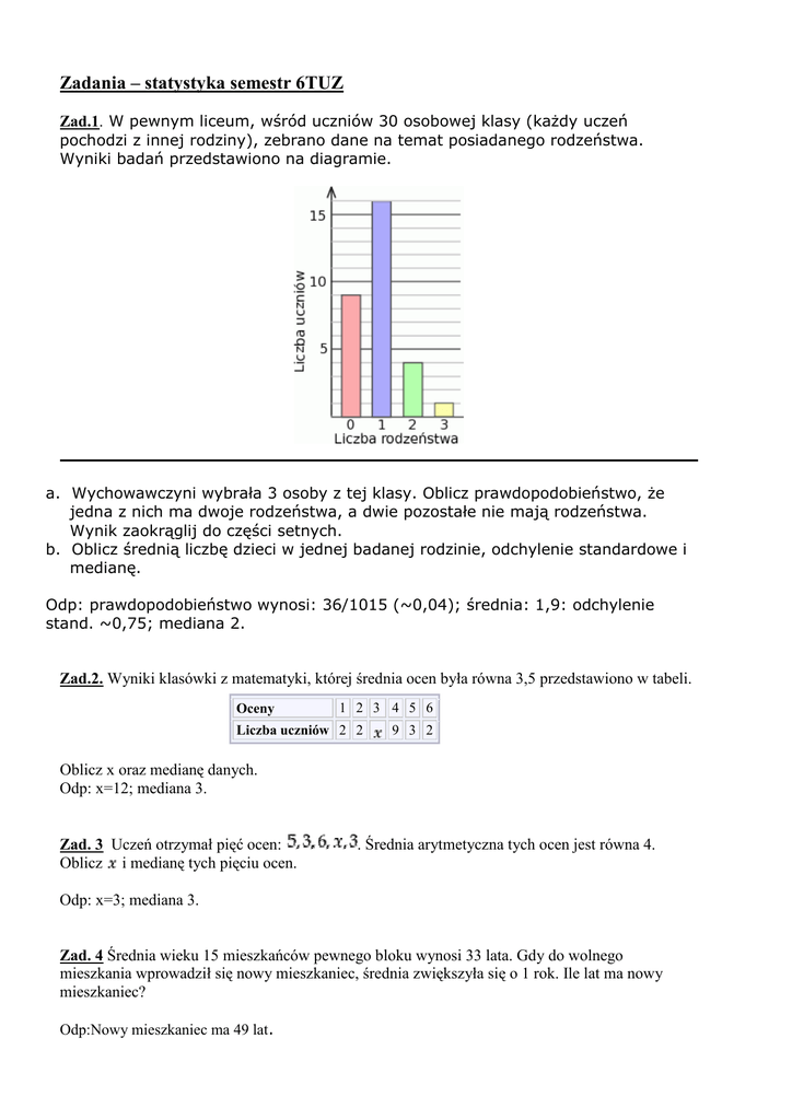 Zadania – statystyka semestr 6TUZ Zad.1. W pewnym liceum, wśród uczniów 30 osobowej klasy (kaŜdy uczeń pochodzi z innej rodziny), zebrano dane na temat posiadanego rodzeństwa. Wyniki badań przedstawiono na diagramie. a. Wychowawczyni wybrała 3 osoby z tej klasy. Oblicz prawdopodobieństwo, Ŝe jedna z nich ma dwoje rodzeństwa, a dwie pozostałe nie mają rodzeństwa. Wynik zaokrąglij do części setnych. b. Oblicz średnią liczbę dzieci w jednej badanej rodzinie, odchylenie standardowe i medianę. Odp: prawdopodobieństwo wynosi: 36/1015 (~0,04); średnia: 1,9: odchylenie stand. ~0,75; mediana 2. Zad.2. Wyniki klasówki z matematyki, której średnia ocen była równa 3,5 przedstawiono w tabeli. Oceny 1 2 3 4 5 6 Liczba uczniów 2 2 9 3 2 Oblicz x oraz medianę danych. Odp: x=12; mediana 3. Zad. 3 Uczeń otrzymał pięć ocen: Oblicz i medianę tych pięciu ocen. . Średnia arytmetyczna tych ocen jest równa 4. Odp: x=3; mediana 3. Zad. 4 Średnia wieku 15 mieszkańców pewnego bloku wynosi 33 lata. Gdy do wolnego mieszkania wprowadził się nowy mieszkaniec, średnia zwiększyła się o 1 rok. Ile lat ma nowy mieszkaniec? Odp:Nowy mieszkaniec ma 49 lat. Zad5. Na diagramie poniŜej przedstawiono procentowy podział miesięcznych zarobków w pewnej firmie. a. Podaj medianę tych zarobków b. Wyznacz średnią kwotę miesięcznych zarobków w tej firmie. c. Oblicz prawdopodobieństwo, Ŝe losowo wybrany pracownik tej firmy zarabia miesięcznie więcej niŜ 3000 zł. Odp: mediana 2300zł, średnia 2815zł, prawdopodobieństwo 0,23. Zad. 6. Mediana trzech liczb jest równa 4, a ich średnia arytmetyczna jest równa 5. Oblicz sumę największej i najmniejszej z tych liczb. Odp: 11. Zad. 7. Przeprowadzono badania, dotyczące liczby osób jadących w samochodach osobowych w godzinach rannych, w kierunku centrum pewnego miasta. Wyniki badań przedstawione są na digramie kołowym. a. Oblicz średnią liczbę osób jadących w samochodzie osobowym w godzinach rannych w kierunku centrum. b. Oblicz prawdopodobieństwo, Ŝe w losowo wybranym samochodzie osobowym, w godzinach rannych, w kierunku centrum, były więcej niŜ 3 osoby. c. Wiedząc, Ŝe samochodów osobowych, w których były 4 osoby, zaobserwowano o 350 więcej, niŜ samochodów w których było 5 osób, oblicz, ile wszystkich samochodów obserwowano w trakcie badań. Odp: a) 2,46; b) 0,23 c) 5000. Zad. 8. ZwaŜono 150 losowo wybranych kostek masła produkowanego przez pewien zakład mleczarski. Wyniki badań przedstawiono w tabeli. Masa kostki masła [dag] Liczba kostek masła 16 1 18 15 19 24 20 68 21 26 22 16 Na podstawie danych przedstawionych w tabeli oblicz średnią arytmetyczną oraz odchylenie standardowe masy kostki masła. Odp: średnia: 20dkg; odchylenie stand. Zad.9. Uczniowie napisali pracę kontrolną. 30% uczniów otrzymało piątkę, 40% otrzymało czwórkę, 8 uczniów otrzymało trójkę, a pozostali ocenę dopuszczającą. Średnia ocen wynosiła 3,9. Ilu uczniów otrzymało piątkę? Odp: 12 uczniów. Zad.10. W pewnej szkole przeprowadzono ten sam sprawdzian z matematyki w trzech klasach 1a, 1b i 1c. Na poniŜszym diagramie przedstawiono wyniki tego sprawdzianu z wyszczególnieniem liczby osób, które uzyskały poszczególne oceny. a. b. c. Ilu uczniów pisało sprawdzian w poszczególnych klasach? Która z ocen była wystawiana najczęściej? W której klasie średnia ocen ze sprawdzianu była najwyŜsza? Odp: a) 31; 32; 31 b) 5 c) 1b. Zad.11. Tabela przedstawia wyniki części teoretycznej egzaminu na prawo jazdy. Zdający uzyskał wynik pozytywny, jeŜeli popełnił co najwyŜej dwa błędy. 0 1 2 3 4 5 6 7 8 Liczba błędów Liczba zdających 8 5 8 5 2 1 0 0 1 a. Oblicz średnią arytmetyczną liczby błędów popełnionych przez zdających ten egzamin. Wynik podaj w zaokrągleniu do całości. b. Oblicz prawdopodobieństwo, Ŝe wśród dwóch losowo wybranych zdających tylko jeden uzyskał wynik pozytywny. Wynik zapisz w postaci ułamka zwykłego nieskracalnego. Odp: a) 2 b) 63/145. Zad.12. Pewna maszyna wykonuje śruby o średnicy 14 mm. Dokonano kontroli jakości wykonywanych śrub i jej wyniki zebrano w tabeli. Średnica w mm 13,8 13,9 14 14,1 14,2 Liczba śrub 8 17 48 13 14 Opierając się na podanych danych. a. Oblicz średnią średnicę śruby. b. Oblicz prawdopodobieństwo wyprodukowania śruby o średnicy z . przedziału c. Oblicz odchylenie standardowe średnicy śruby. Wynik podaj z dokładnością do 0,01. Odp: a) 14,008mm b) 0,78 c) Zad.13. W pewnym zakładzie pracy obliczono ile dni urlopu wykorzystali pracownicy w lutym. Wynik przedstawiono w następującym diagramie słupkowym a. Jaka była średnia liczba dni urlopu przypadających na jednego pracownika? b. Ilu pracowników liczy zakład pracy, jeśli 119 pracowników miało mniejszą liczbę dni urlopu niŜ wynosi średnia przypadająca na jednego pracownika? Odp: a) 1,6 b) 170. Zad.14. W tabeli zestawiono oceny z matematyki uczniów klasy 3A na koniec semestru. Ocena 1 2 3 4 5 6 Liczba ocen 0 4 9 13 Średnia arytmetyczna tych ocen jest równa 3,6. Oblicz liczbę matematyki wystawionych na koniec semestru w tej klasie. 1 ocen bardzo dobrych (5) z Odp:3. Zad.15. Oblicz medianę następujących danych: 13,2; 15; 12,225; 14; 16,8; 42,7; 22,1; 31,4; 20,6; 18,4. Odp: 17,6 Zad.16. Podaj: śednią arytmetyczną, medianę, dominantę, wariancję dla danych zebranych w tabeli: Odp: średnia = 1; dominanta D1=0 i D2=1; wariancja =22/18 (1,222…); odchylenie standardowe = 1,11 Zad.17. Pan Jan sprzedaje cztery rodzaje parasoli, kaŜdy rodzaj w innej cenie. 40% sprzedawanych przez niego parasoli kosztuje 26zł, 30% parasoli kosztuje 30zł. Najtańszych parasoli w cenie 20 zł Pan Jan ma 5 sztuk. Pozostałe, najdroŜsze parasole kosztują po 45zł. Oblicz ile parasoli ma do sprzedania Pan Jan, jeśli średnia cena sprzedawanych przez niego parasoli wynosi 31,65zł. Wyznacz medianę i dominantę. Odp: 100 parasoli, mediana = 30, dominanta = 2