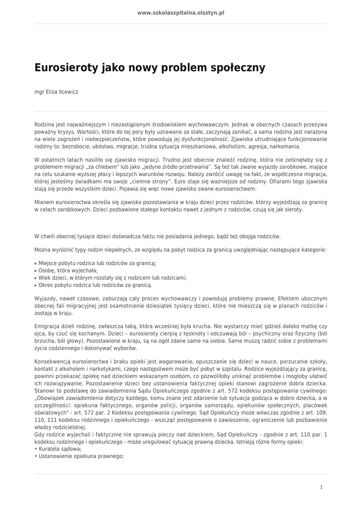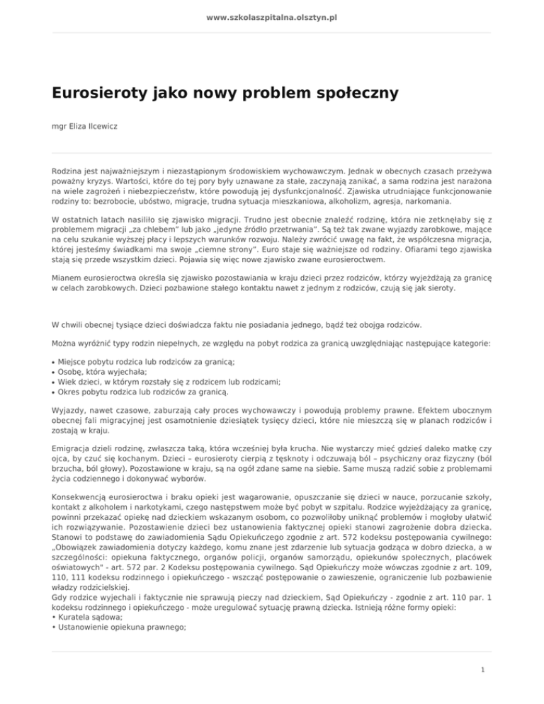 www.szkolaszpitalna.olsztyn.pl Eurosieroty jako nowy problem społeczny mgr Eliza Ilcewicz Rodzina jest najważniejszym i niezastąpionym środowiskiem wychowawczym. Jednak w obecnych czasach przeżywa poważny kryzys. Wartości, które do tej pory były uznawane za stałe, zaczynają zanikać, a sama rodzina jest narażona na wiele zagrożeń i niebezpieczeństw, które powodują jej dysfunkcjonalność. Zjawiska utrudniające funkcjonowanie rodziny to: bezrobocie, ubóstwo, migracje, trudna sytuacja mieszkaniowa, alkoholizm, agresja, narkomania. W ostatnich latach nasiliło się zjawisko migracji. Trudno jest obecnie znaleźć rodzinę, która nie zetknęłaby się z problemem migracji „za chlebem” lub jako „jedyne źródło przetrwania”. Są też tak zwane wyjazdy zarobkowe, mające na celu szukanie wyższej płacy i lepszych warunków rozwoju. Należy zwrócić uwagę na fakt, że współczesna migracja, której jesteśmy świadkami ma swoje „ciemne strony”. Euro staje się ważniejsze od rodziny. Ofiarami tego zjawiska stają się przede wszystkim dzieci. Pojawia się więc nowe zjawisko zwane eurosieroctwem. Mianem eurosieroctwa określa się zjawisko pozostawiania w kraju dzieci przez rodziców, którzy wyjeżdżają za granicę w celach zarobkowych. Dzieci pozbawione stałego kontaktu nawet z jednym z rodziców, czują się jak sieroty. W chwili obecnej tysiące dzieci doświadcza faktu nie posiadania jednego, bądź też obojga rodziców. Można wyróżnić typy rodzin niepełnych, ze względu na pobyt rodzica za granicą uwzględniając następujące kategorie: ● ● ● ● Miejsce pobytu rodzica lub rodziców za granicą; Osobę, która wyjechała; Wiek dzieci, w którym rozstały się z rodzicem lub rodzicami; Okres pobytu rodzica lub rodziców za granicą. Wyjazdy, nawet czasowe, zaburzają cały proces wychowawczy i powodują problemy prawne. Efektem ubocznym obecnej fali migracyjnej jest osamotnienie dziesiątek tysięcy dzieci, które nie mieszczą się w planach rodziców i zostają w kraju. Emigracja dzieli rodzinę, zwłaszcza taką, która wcześniej była krucha. Nie wystarczy mieć gdzieś daleko matkę czy ojca, by czuć się kochanym. Dzieci – eurosieroty cierpią z tęsknoty i odczuwają ból – psychiczny oraz fizyczny (ból brzucha, ból głowy). Pozostawione w kraju, są na ogół zdane same na siebie. Same muszą radzić sobie z problemami życia codziennego i dokonywać wyborów. Konsekwencją eurosieroctwa i braku opieki jest wagarowanie, opuszczanie się dzieci w nauce, porzucanie szkoły, kontakt z alkoholem i narkotykami, czego następstwem może być pobyt w szpitalu. Rodzice wyjeżdżający za granicę, powinni przekazać opiekę nad dzieckiem wskazanym osobom, co pozwoliłoby uniknąć problemów i mogłoby ułatwić ich rozwiązywanie. Pozostawienie dzieci bez ustanowienia faktycznej opieki stanowi zagrożenie dobra dziecka. Stanowi to podstawę do zawiadomienia Sądu Opiekuńczego zgodnie z art. 572 kodeksu postępowania cywilnego: „Obowiązek zawiadomienia dotyczy każdego, komu znane jest zdarzenie lub sytuacja godząca w dobro dziecka, a w szczególności: opiekuna faktycznego, organów policji, organów samorządu, opiekunów społecznych, placówek oświatowych" - art. 572 par. 2 Kodeksu postępowania cywilnego. Sąd Opiekuńczy może wówczas zgodnie z art. 109, 110, 111 kodeksu rodzinnego i opiekuńczego - wszcząć postępowanie o zawieszenie, ograniczenie lub pozbawienie władzy rodzicielskiej. Gdy rodzice wyjechali i faktycznie nie sprawują pieczy nad dzieckiem, Sąd Opiekuńczy - zgodnie z art. 110 par. 1 kodeksu rodzinnego i opiekuńczego - może uregulować sytuację prawną dziecka. Istnieją różne formy opieki: • Kuratela sądowa; • Ustanowienie opiekuna prawnego; 1 www.szkolaszpitalna.olsztyn.pl • Adopcja; • Placówka opiekuńczo - wychowawcza; • Rodzina zastępcza. Bardzo ważną kwestią związaną z eurosierotami jest więc ich status prawny. Nowym zjawiskiem zaznaczającym się w naszym kraju od kilku lat, jest kwestia pozostawiania dzieci bez uregulowania ich statusu opiekuńczego przez rodziców wyjeżdżających za granicę. Zjawisko to zaczęto już nazywać generowaniem eurosierot. Osamotnione dzieci, pozostawione w kraju mają problemy emocjonalne, co skutkuje sytuacjami traumatycznymi. Przed podjęciem decyzji o wyjeździe za granicę zawsze należy pamiętać, że dobro, zdrowie i bezpieczeństwo dziecka, to najważniejsze wartości nie podlegające negocjacji. 2