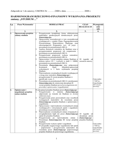 Załącznik nr 1 do umowy; UMOWA Nr ………/2008 z dnia ……….. ………… 2008 r. HARMONOGRAM RZECZOWO-FINANSOWY WYKONANIA PROJEKTU zmiany „STUDIUM ...” Lp. /Faza Wykonania/ RODZAJ PRAC 1. 1. Opracowanie projektu zmiany studium 2. 1. 2. 3. 4. 5. 6. 7. 8. 2. Opiniowanie i uzgadnianie projektu zmian studium CZAS Wynagrodz REALIZACJI enie [zł] 3. 4. Przygotowanie kompletnej formy elektronicznej materiałów geodezyjnych dostarczonych przez Zamawiającego. Opracowanie uwarunkowań w tym uwarunkowań wynikających z ustaleń Planu Zagospodarowania Przestrzennego Województwa Śląskiego oraz obowiązujących Programów (art. 48 pizp) – prezentacja na posiedzeniach GKUA Analiza złoŜonych wniosków do Studium wraz z przygotowaniem propozycji ich rozpatrzenia prezentacja na posiedzeniach GKUA Przygotowanie propozycji wykazu wnioskówprezentacja na posiedzeniach GKUA Opracowanie I wersji projektu zmiany Studium w 30 tygodni od kolorze (płyta CD + wydruki) w skali 1: 10000- zawarcia umowy prezentacja na posiedzeniach GKUA Prezentacja Zamawiającemu oraz połączonym Komisjom Rady Miejskiej-opracowań wykonanych w I fazie wykonania projektu Studium. Wprowadzenie ewentualnych korekt wynikających z uwag oraz wniosków Zamawiającego i przygotowanie II wersji projektu Studium w sposób jak w poz. 5. Cena netto: Prezentacja na posiedzeniach GKUA i przekazanie + VAT tj.: Zamawiającemu do ostatecznej akceptacji II Cena brutto: (30 % kwoty wersji projektu Studium (przed przystąpieniem do umownej) procedury opiniowania i uzgadniania). Po akceptacji projektu Studium przez Zamawiającego: 1. Przygotowanie w imieniu Zamawiającego odpowiedzi na wnioski do Studium (w formie elektronicznej). 2. Przygotowania pism przewodnich oraz wszelkich wymaganych materiałów do rozesłania przez Zamawiającego projektu Studium o opiniowanie i uzgadnianie. 3. Opracowanie i wprowadzenie ewentualnych zmian wynikających z otrzymanych opinii i uzgodnieńprezentacja na posiedzeniach GKUA. 4. Wprowadzenie ewentualnych zmian związanych z uwzględnieniem bądź nie przez Zamawiającego opinii do projektu Studium. 5. Przygotowanie po wprowadzeniu zmian i Prezentacja Zamawiającemu III wersji projektu Studium. 6. Przygotowanie wykazu opinii i uzgodnień. 7. W przypadku negatywnego uzgodnienia lub opinii – poprawienie i przygotowanie materiałów do rozesłania przez Zamawiającego poprawionego projektu Studium do ponownego uzgodnienia. 1 10 tygodni od akceptacji przez Zamawiającego projektu Studium Cena netto: + VAT tj.: Cena brutto: (30 % kwoty umownej) 3. 4. WyłoŜenie projektu zmiany studium do publicznego wglądu 1. Przygotowanie ogłoszenia i obwieszenia o terminie wyłoŜenia projektu Studium. 2. Przekazanie Zamawiającemu projektu Studium celem wyłoŜenia do publicznego wglądu. 3. WyłoŜenie projektu Studium – obecność przynajmniej jednej osoby z zespołu projektującego Studium podczas całego okresu wyłoŜenia do publicznego wglądu (w godzinach uzgodnionych z Zamawiającym). 4. Dyskusja publiczna - udział przynajmniej dwóch projektantów Studium w dyskusji nad przyjętymi rozwiązaniami i ustaleniami. 5. Uczestnictwo na posiedzeniach GKUA oraz Komisji Rady Miejskiej dot. rozstrzygnięcia uwag złoŜonych do projektu Studium. 6. Wprowadzenie ewentualnych zmian do projektu Studium uwzględnionych przez Zamawiającego. 7. Prezentacja projektu Studium na posiedzeniach GKUA i Komisjach Rady Miejskiej po wprowadzeniu ww. uwag. 8. Przekazanie projektu Studium do uchwalenia wraz z listą nieuwzględnionych uwag. 9. Wprowadzenie ewentualnych zmian w projekcie Studium w wyniku stwierdzenia przez Radę Miejską takiej konieczności lub w wyniku uwzględnienia przez Radę Miejską uwag nieuwzględnionych przez Zamawiającego. 10. Przekazanie projektu Studium do uchwalenia z uwzględnieniem uwag jak w poz. 9. 12 tygodni od otrzymania ostatniego uzgodnienia Cena netto: + VAT tj.: Cena brutto: (30 % kwoty umownej) Przygotowanie i przekazanie ZamawiającemuAd.1 Pięć dni od dokumentacji planistycznej niezbędnej do oceny dnia uchwalenia przez Wojewodę uchwalonego Studium z Studium Ad.2Dwa tygodnie przepisami prawnymi. 2. Uwzględnienie ewentualnych uwag wniesionych od przez Wojewodę w wyniku oceny zgodności z przedstawienia prawem wykonanego Studium uwag 3. Ostateczne przekazanie przedmiotu zamówienia w Zamawiającemu Cena netto: formie i ilości określonej w umowie. Ad.3 Niezwłocznie + VAT tj.: po stwierdzeniu Cena brutto: przez Wojewodę (10 % kwoty umownej) zgodności z prawem wykonanego Studium Cena netto: ............................................. + VAT tj.: ................................................... Cena brutto: .................................................................................................................... Czynności po uchwaleniu 1. projektu zmiany Studium ŁĄCZNIE Uwaga: Zamawiający przewiduje w fazie opracowania projektu Studium do 30 spotkań z udziałem przedstawicieli Wykonawcy, w fazie opiniowania i uzgadniania do 5 spotkań, w fazie wyłoŜenia projektu do publicznego wglądu oraz przekazania do uchwalenia do 20 spotkań. Terminy spotkań oraz posiedzeń na GKUA oraz Komisji Rady Miejskiej zostaną ustalone przez Zamawiającego z wybranym Wykonawcą w trybie roboczym. 2