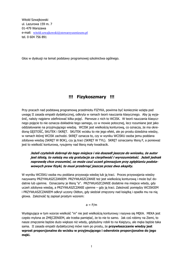 Witold Szwajkowski ul. Lazurowa 159 m. 7 01-479 Warszawa e-mail: [email protected] tel. 0 604 756 891 Głos w dyskusji na temat podstawy programowej szkolnictwa ogólnego. !!! Fizykoszmary !!! Przy pracach nad podstawą programową przedmiotu FIZYKA, powinna być koniecznie wzięta pod uwagę II zasada empatii dydaktycznej, odkryta w ramach teorii nauczania klasycznego. Aby ją wyjaśnić, należy najpierw zdefiniować kilka pojęć. Pierwsze z nich to WCISK. W teorii nauczania klasycznego pojęcie to nie oznacza dokładnie tego samego, co w mowie potocznej, lecz rozumiane jest jako oddziaływanie na przyjmującego wiedzę. WCISK jest wielkością konturową, co oznacza, że ma określoną GĘSTOŚĆ, SKUTEK i SKRĘT. SKUTEK wcisku to nie jego efekt, ale po prostu dziedzina wiedzy, w ramach której WCISK zachodzi. SKRĘT oznacza to, czy w wyniku WCISKU osoba jemu poddana zdobywa wiedzę (SKRĘT W BOK), czy ją traci (SKRĘT W TYŁ). SKRĘT oznaczamy literą F, a ponieważ jest to wielkość konturowa, rysujemy nad literą mały kwadracik. Jeżeli czytelnik dobrnął do tego miejsca i nie doszedł jeszcze do wniosku, że autor jest idiotą, to należą mu się gratulacje za cierpliwość i wyrozumiałość. Jeżeli jednak naprawdę chce zrozumieć, co może czuć uczeń gimnazjum przy zgłębianiu podstawowych praw fizyki, to musi przebrnąć jeszcze przez dwa akapity. W wyniku WCISKU osoba mu poddana przyswaja wiedzę lub ją traci. Proces przyswajania wiedzy nazywamy PRZYWŁASZCZANIEM. PRZYWŁASZCZANIE też jest wielkością konturową i może być dodatnie lub ujemne. Oznaczamy je literą "a". PRZYWŁASZCZANIE dodatnie ma miejsce wtedy, gdy uczeń zdobywa wiedzę, a PRZYWŁASZCZANIE ujemne – gdy ją traci. Zależność pomiędzy WCISKIEM i PRZYWŁASZCZANIEM odkrył uczony Oldton, gdy siedział zmęczony nad książką i opadła mu na nią głowa. Zależność tę zapisał prostym wzorem: a = F/m Występująca w tym wzorze wielkość "m" nie jest wielkością konturową i nazywa się MĘKA. MEKA jest często mylona ze ZMĘCZENIEM, ale trzeba pamiętać, że to nie to samo. Jak coś robimy na Ziemi, to nasze zmęczenie będzie dużo większe niż wtedy, gdybyśmy robili to na Księżycu, ale męka będzie taka sama. II zasada empatii dydaktycznej mówi nam po prostu, że przywłaszczanie wiedzy jest wprost proporcjonalne do wcisku w przyjmującego i odwrotnie proporcjonalne do jego męki. 1 Teraz możemy już przejść do FIZYKI. Najpierw uczeń zostaje zapoznany z pojęciem SIŁY. Przeciętny uczeń zna to słowo z języka potocznego, ale jego znaczenie nie pokrywa się ze znaczeniem fizycznym pojęcia SIŁA. "Jak nie będziesz Kaziu jadł, to nie będziesz miał siły!". Uczeń musi więc rozszerzyć dobrze znane mu i ugruntowane znaczenie tego słowa na nowe, trudne pojęcie. To nie wszystko. Natychmiast dowiaduje się, że SIŁA w rozumieniu fizyki to wielkość WEKTOROWA. WEKTOR jest dla większości uczniów nowym, nieznanym i na dodatek zupełnie abstrakcyjnym pojęciem. Nie bez znaczenia jest też sam dźwięk tego słowa, które brzmi prawie tak samo groźnie jak "logarytm". Ale to nie jest jeszcze największy problem. Uczeń dowiaduje się, że SIŁA ma WARTOŚĆ, KIERUNEK i ZWROT. WARTOŚĆ siły, której przecież nie widać, zaznacza się na rysunku długością strzałki, reprezentującej wektor. Właśnie, dlaczego długością, a nie np. grubością lub szerokością grota strzałki? Tego się przeważnie nie wyjaśnia. Teraz przyjrzyjmy się pojęciu KIERUNEK. Przed rozpoczęciem nauki fizyki uczeń używał słowa KIERUNEK w znaczeniu "idę w przeciwnym kierunku", "kierunek w prawo", "właściwy kierunek", itp. Są to więc znaczenia zupełnie inne niż KIERUNEK w znaczeniu fizycznym, który oznacza linię prostą, wzdłuż której działa siła. Teraz ma szybko przyzwyczaić się do tego, że to, na co mówił KIERUNEK musi nazywać słowem ZWROT, a więc jeszcze innym, ugruntowanym i znanym sobie wcześniej słowem, którego używał w zupełnie innych znaczeniach. Np. "zwrot akcji", "zwrot językowy", "zwrot butelek", "w tył zwrot". Kolejnym pojęciem, które uczeń musi szybko przyswoić jest PRZYSPIESZENIE. Warto zastanowić się, co do tej pory przeciętny uczeń rozumiał jako PRZYSPIESZENIE? Można się domyślać, że raczej nie stałe ZWIĘKSZANIE prędkości, tylko chwilowe, jednorazowe ZWIĘKSZENIE prędkości. "Kazik szedł wolno, ale jak się zorientował, że może się spóźnić, to przyspieszył". Przyspieszenie jest tym, co Kazik zrobił, a nie procesem. A więc również w przypadku pojęcia PRZYSPIESZENIA uczeń musi przestawić się na inne znaczenie słowa, które już wcześniej znał. Dochodzi do tego fakt, że PRZYSPIESZENIE jest pojęciem trudnym do wyjaśnienia z natury, ponieważ samo zjawisko przyspieszenia jest trudne do zaobserwowania dla przeciętnego człowieka, bez użycia dokładnych przyrządów pomiarowych i poznania metody pomiaru. Załóżmy jednak, że uczniowie zdołają przyswoić sobie zarówno pojęcie SIŁY, poprzez rysowanie strzałek i opartych na nich równoległoboków, jak i PRZYSPIESZENIA, poprzez analizę wykresów ilustrujących zależność prędkości od czasu w ruchu jednostajnie przyspieszonym. Zostaje jeszcze wyjaśnienie związku, jaki występuje pomiędzy tymi dwiema wielkościami. Tak się składa, że zrozumienie tego związku zajęło ludzkości kilka tysięcy lat, a pozwolił na to dopiero geniusz Izaaka Newtona. Tymczasem uczniom podaje się wzór wyglądający na bardzo prosty: a = F/m i oczekuje się, że tak po prostu go zrozumieją. Podstawową trudnością w zrozumieniu tak zapisanej zależności jest pojęcie MASY. Również w przypadku tego pojęcia uczeń musi oderwać się od wszelkich innych znaczeń tego słowa, które znał i których używał do tej pory, takich jak "masa czekoladowa", "chłodna masa powietrza", "masa ludzi", "ciemna masa", "Masa i Baranina", a także - co jest chyba najtr