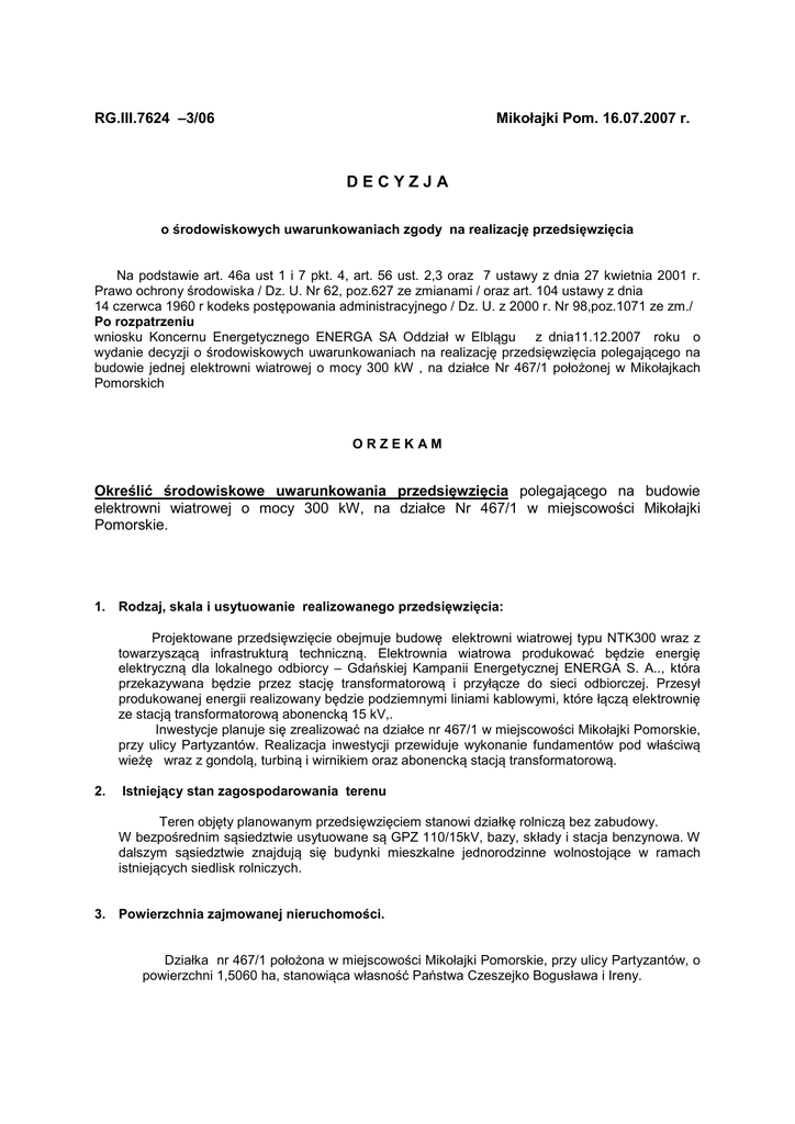 RG.III.7624 –3/06 Mikołajki Pom. 16.07.2007 r. DECYZJA o środowiskowych uwarunkowaniach zgody na realizację przedsięwzięcia Na podstawie art. 46a ust 1 i 7 pkt. 4, art. 56 ust. 2,3 oraz 7 ustawy z dnia 27 kwietnia 2001 r. Prawo ochrony środowiska / Dz. U. Nr 62, poz.627 ze zmianami / oraz art. 104 ustawy z dnia 14 czerwca 1960 r kodeks postępowania administracyjnego / Dz. U. z 2000 r. Nr 98,poz.1071 ze zm./ Po rozpatrzeniu wniosku Koncernu Energetycznego ENERGA SA Oddział w Elblągu z dnia11.12.2007 roku o wydanie decyzji o środowiskowych uwarunkowaniach na realizację przedsięwzięcia polegającego na budowie jednej elektrowni wiatrowej o mocy 300 kW , na działce Nr 467/1 położonej w Mikołajkach Pomorskich ORZEKAM Określić środowiskowe uwarunkowania przedsięwzięcia polegającego na budowie elektrowni wiatrowej o mocy 300 kW, na działce Nr 467/1 w miejscowości Mikołajki Pomorskie. 1. Rodzaj, skala i usytuowanie realizowanego przedsięwzięcia: Projektowane przedsięwzięcie obejmuje budowę elektrowni wiatrowej typu NTK300 wraz z towarzyszącą infrastrukturą techniczną. Elektrownia wiatrowa produkować będzie energię elektryczną dla lokalnego odbiorcy – Gdańskiej Kampanii Energetycznej ENERGA S. A.., która przekazywana będzie przez stację transformatorową i przyłącze do sieci odbiorczej. Przesył produkowanej energii realizowany będzie podziemnymi liniami kablowymi, które łączą elektrownię ze stacją transformatorową abonencką 15 kV,. Inwestycje planuje się zrealizować na działce nr 467/1 w miejscowości Mikołajki Pomorskie, przy ulicy Partyzantów. Realizacja inwestycji przewiduje wykonanie fundamentów pod właściwą wieżę wraz z gondolą, turbiną i wirnikiem oraz abonencką stacją transformatorową. 2. Istniejący stan zagospodarowania terenu Teren objęty planowanym przedsięwzięciem stanowi działkę rolniczą bez zabudowy. W bezpośrednim sąsiedztwie usytuowane są GPZ 110/15kV, bazy, składy i stacja benzynowa. W dalszym sąsiedztwie znajdują się budynki mieszkalne jednorodzinne wolnostojące w ramach istniejących siedlisk rolniczych. 3. Powierzchnia zajmowanej nieruchomości. Działka nr 467/1 położona w miejscowości Mikołajki Pomorskie, przy ulicy Partyzantów, o powierzchni 1,5060 ha, stanowiąca własność Państwa Czeszejko Bogusława i Ireny. 4. Rodzaj technologii. Instalacja wiatrowa typu NTK 300, o mocy znamionowej 300 kW. Wysokość wieży od piasty wirnika silnika wiatrowego, o średnicy 28 m, wynosi 31 m. Wieża wyposażona jest w schody wewnętrzne. Moc znamionową instalacja wiatrowa osiąga przy prędkościach wiatru od 13 do 25 m/s. Jest wyposażona w generator asynchroniczny z przełącznikiem liczby par biegunów, kontrolowanym i sterowanym przez komputer. Komputer kontroluje i monitoruje także wszystkie operacje dokonywane automatycznie: zatrzymanie instalacji przy spadku przedmości wiatru poniżej 4,5 m/s, wyłącznie instalacji przy prędkości wiatru powyżej 25 m/s, monitorowanie stanu oleju i jego temperatury, ciśnienia hamulca hydraulicznego. Na konstrukcję elektrowni wiatrowej typu NTK300 składają się trzy zasadnicze elementy: • Stalowa wieża posadowiona na żelbetonowym fundamencie. • Gondola, gdzie umieszczona jest maszynownia elektrowni z przekładnią, generatorem i sterownią • Wirnik zbudowany z trzech łopat wykonanych z tworzywa sztucznego. Podstawowe parametry elektrowni: • Wysokość całkowita: ok. 45,0 m • Wysokość wieży: 31,0 m • Średnica wirnika: 28,0 m • Moc nominalna 300 Kw • Moc maksymalna 360 kW • Prędkość obrotowa: 39,3 obr./min • Włączeniowa prędkość wiatru 4,5 m/s • Wyłączeniowa prędkość wiatru 25 m/s • Moc akustyczna ~ 110 dB(A) • Prędkość wytrzymałościowa siłowni 53 m/s 5. Ewentualne warianty przedsięwzięcia: W przypadku przedmiotowej inwestycji – budowa dwóch elektrowni wiatrowych wraz z infrastrukturą techniczną – wyróżnić możemy następujące etapy: realizacji eksploatacji i likwidacji. I Etap realizacji i eksploatacji przedsięwzięcia należy podjąć następujące działania: • powstające w trakcie budowy i eksploatacji odpady należy segregować i gromadzić w przeznaczonych do tego celu pojemnikach i sukcesywnie wywozić z terenu budowy, • odpady pochodzące z niwelacji terenu wykorzystywać w granicach realizowanej inwestycji; • hałaśliwe prace budowlane prowadzić tylko w porze dziennej; • prowadzić okresowe obserwacje ornitologiczne, na ich podstawie sporządzać roczne raporty o padniętych wskutek zderzeń z obiektem siłowni wiatrowej ptakach i nietoperzach. w/w raport należy przedstawiać w Starostwie Powiatowym w Sztumie w terminie do końca kwartału za poprzedni rok kalendarzowy. 6. Rozwiązania chroniące środowisko W projekcie budowlanym należy uwzględnić następujące wymagania dotyczące ochrony środowiska: • elektrownia wiatrowa – posadowiona na konstrukcji rurowej; • kolor turbiny wiatrowej – biały lub szaro – biały, niekontrastujący z otoczeniem; • pokrycie konstrukcji siłowni wiatrowej – farba pochłaniająca światło; • zakazuje się umieszczania reklam na konstrukcji elektrowni za wyjątkiem standardowych oznaczeń producenta umieszczonych na gondoli 7. Rodzaj i przewidywane ilości wprowadzonych do środowiska substancji. Przedsięwzięcie wymaga sporządzenia analizy porealizacyjnej w zakresie klimatu akustycznego. W celu określenia rzeczywistych skutków akustycznych związanych z pracą elektrowni wiatrowej należy wykonać, w terminie do 30 dni po uzyskaniu pozwolenia na użytkowanie obiektu w Starostwie Powiatowym w Sztumie, pomiary akustyczne środowiska wyrażone ”równoważnym poziomem dźwięku A” w porze dziennej i nocnej weryfikujące wyniki teoretyczne. • Promieniowanie w postaci pola elektromagnetycznego. Częstotliwość 50 Hz • Oddziaływanie w zakresie wód powierzchniowych, wód podziemnych i gleb Źródłem
