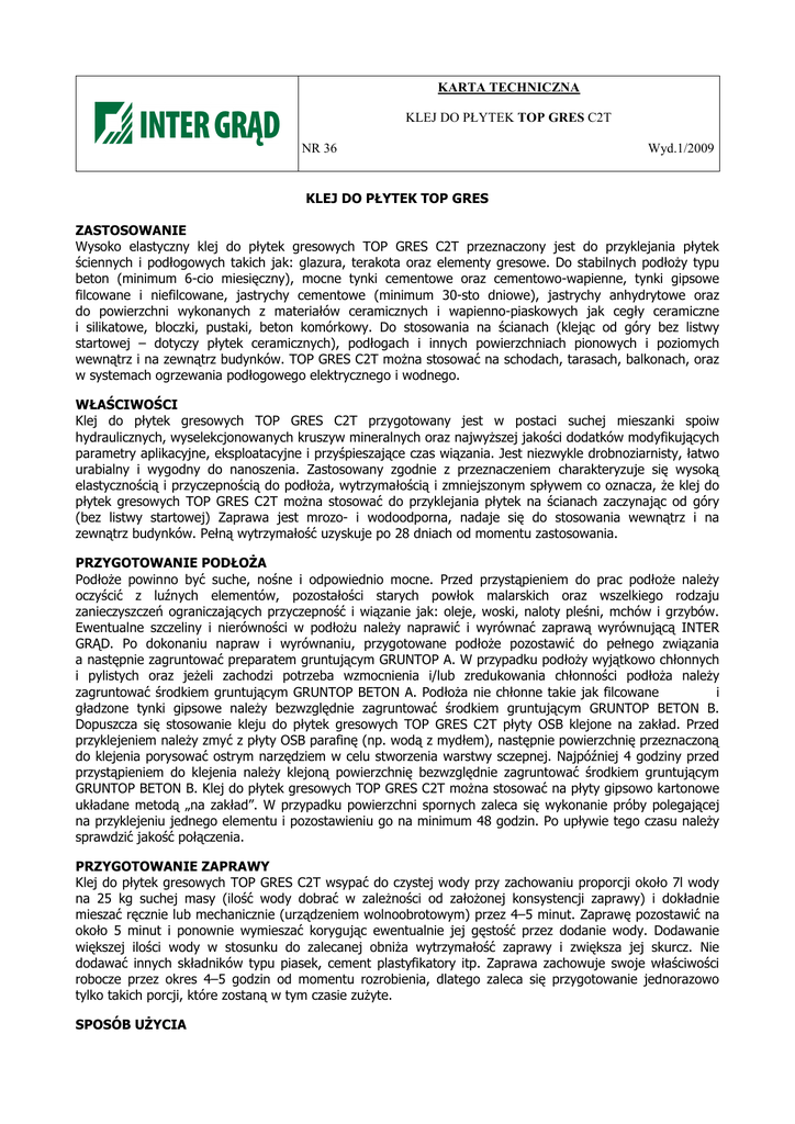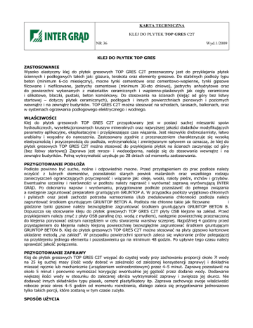 KARTA TECHNICZNA KLEJ DO PŁYTEK TOP GRES C2T NR 36 Wyd.1/2009 KLEJ DO PŁYTEK TOP GRES ZASTOSOWANIE Wysoko elastyczny klej do płytek gresowych TOP GRES C2T przeznaczony jest do przyklejania płytek ściennych i podłogowych takich jak: glazura, terakota oraz elementy gresowe. Do stabilnych podłoŜy typu beton (minimum 6-cio miesięczny), mocne tynki cementowe oraz cementowo-wapienne, tynki gipsowe filcowane i niefilcowane, jastrychy cementowe (minimum 30-sto dniowe), jastrychy anhydrytowe oraz do powierzchni wykonanych z materiałów ceramicznych i wapienno-piaskowych jak cegły ceramiczne i silikatowe, bloczki, pustaki, beton komórkowy. Do stosowania na ścianach (klejąc od góry bez listwy startowej – dotyczy płytek ceramicznych), podłogach i innych powierzchniach pionowych i poziomych wewnątrz i na zewnątrz budynków. TOP GRES C2T moŜna stosować na schodach, tarasach, balkonach, oraz w systemach ogrzewania podłogowego elektrycznego i wodnego. WŁAŚCIWOŚCI Klej do płytek gresowych TOP GRES C2T przygotowany jest w postaci suchej mieszanki spoiw hydraulicznych, wyselekcjonowanych kruszyw mineralnych oraz najwyŜszej jakości dodatków modyfikujących parametry aplikacyjne, eksploatacyjne i przyśpieszające czas wiązania. Jest niezwykle drobnoziarnisty, łatwo urabialny i wygodny do nanoszenia. Zastosowany zgodnie z przeznaczeniem charakteryzuje się wysoką elastycznością i przyczepnością do podłoŜa, wytrzymałością i zmniejszonym spływem co oznacza, Ŝe klej do płytek gresowych TOP GRES C2T moŜna stosować do przyklejania płytek na ścianach zaczynając od góry (bez listwy startowej) Zaprawa jest mrozo- i wodoodporna, nadaje się do stosowania wewnątrz i na zewnątrz budynków. Pełną wytrzymałość uzyskuje po 28 dniach od momentu zastosowania. PRZYGOTOWANIE PODŁOśA PodłoŜe powinno być suche, nośne i odpowiednio mocne. Przed przystąpieniem do prac podłoŜe naleŜy oczyścić z luźnych elementów, pozostałości starych powłok malarskich oraz wszelkiego rodzaju zanieczyszczeń ograniczających przyczepność i wiązanie jak: oleje, woski, naloty pleśni, mchów i grzybów. Ewentualne szczeliny i nierówności w podłoŜu naleŜy naprawić i wyrównać zaprawą wyrównującą INTER GRĄD. Po dokonaniu napraw i wyrównaniu, przygotowane podłoŜe pozostawić do pełnego związania a następnie zagruntować preparatem gruntującym GRUNTOP A. W przypadku podłoŜy wyjątkowo chłonnych i pylistych oraz jeŜeli zachodzi potrzeba wzmocnienia i/lub zredukowania chłonności podłoŜa naleŜy zagruntować środkiem gruntującym GRUNTOP BETON A. PodłoŜa nie chłonne takie jak filcowane i gładzone tynki gipsowe naleŜy bezwzględnie zagruntować środkiem gruntującym GRUNTOP BETON B. Dopuszcza się stosowanie kleju do płytek gresowych TOP GRES C2T płyty OSB klejone na zakład. Przed przyklejeniem naleŜy zmyć z płyty OSB parafinę (np. wodą z mydłem), następnie powierzchnię przeznaczoną do klejenia porysować ostrym narzędziem w celu stworzenia warstwy sczepnej. Najpóźniej 4 godziny przed przystąpieniem do klejenia naleŜy klejoną powierzchnię bezwzględnie zagruntować środkiem gruntującym GRUNTOP BETON B. Klej do płytek gresowych TOP GRES C2T moŜna stosować na płyty gipsowo kartonowe układane metodą „na zakład”. W przypadku powierzchni spornych zaleca się wykonanie próby polegającej na przyklejeniu jednego elementu i pozostawieniu go na minimum 48 godzin. Po upływie tego czasu naleŜy sprawdzić jakość połączenia. PRZYGOTOWANIE ZAPRAWY Klej do płytek gresowych TOP GRES C2T wsypać do czystej wody przy zachowaniu proporcji około 7l wody na 25 kg suchej masy (ilość wody dobrać w zaleŜności od załoŜonej konsystencji zaprawy) i dokładnie mieszać ręcznie lub mechanicznie (urządzeniem wolnoobrotowym) przez 4–5 minut. Zaprawę pozostawić na około 5 minut i ponownie wymieszać korygując ewentualnie jej gęstość przez dodanie wody. Dodawanie większej ilości wody w stosunku do zalecanej obniŜa wytrzymałość zaprawy i zwiększa jej skurcz. Nie dodawać innych składników typu piasek, cement plastyfikatory itp. Zaprawa zachowuje swoje właściwości robocze przez okres 4–5 godzin od momentu rozrobienia, dlatego zaleca się przygotowanie jednorazowo tylko takich porcji, które zostaną w tym czasie zuŜyte. SPOSÓB UśYCIA Klej do płytek gresowych TOP GRES C2T naleŜy nanosić bezpośrednio po rozrobieniu na podłoŜe gładką krawędzią pacy, a następnie rozprowadzać krawędzią ząbkowaną. W przypadku klejenia na zewnątrz budynku naleŜy zastosować kontaktowa metodę klejenia nakładając klej na przygotowane podłoŜe i na przyklejaną płytkę. W przypadku płytek duŜego formatu klejonych na zewnątrz i wewnątrz zaleca się stosowanie zębatej pacy. Z uwagi na właściwości, klejem do płytek gresowych TOP GRES C2T moŜna przyklejać płytki metodą „od góry”, bez listwy startowej (płytki nie osuwają się). Grubość warstwy zaprawy nie powinna przekraczać 5 mm. Układać suche i czyste elementy delikatnie dociskając je do podłoŜa tak, aby powierzchnia styku płytki z klejem była nie mniejsza niŜ ¾ powierzchni płytki. Czas otwarty kleju wynosi powyŜej 40 minut od momentu jego nałoŜenia na podłoŜe. JeŜeli powierzchnia płytki jest większa niŜ 900 cm2 (30x30cm) zaprawę naleŜy nanosić zarówno na podłoŜe, jak i na odwrotną stronę płytki, aby uzyskać co najmniej 90% powierzchni klejenia, na podłoŜach intensywnie eksploatowanych zaprawa powinna przylegać do całej powierzchni płytki. UłoŜenie płytek moŜna korygować około 15 minut od momentu przyklejenia. Temperatura podłoŜa i otoczenia podczas prowadzonych prac powinna wynosić od +5°C do +25°C, a przez okres następnych 48 godzin nie moŜe być niŜsza niŜ +5°C. Do ruchu pieszego i wypełniania spoin posadzka moŜe być dopuszczona po upływie minimum 24 godzin od przyklejenia płytek. Pe