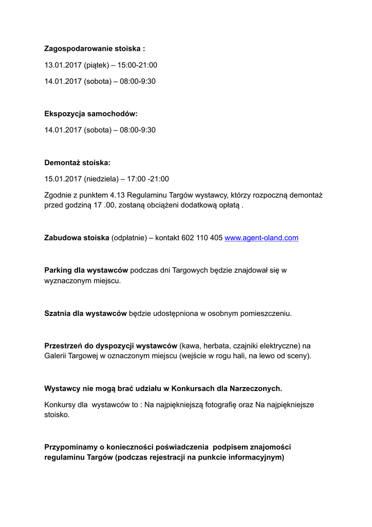Zagospodarowanie stoiska : 13.01.2017 (piątek) – 15:00-21:00 14.01.2017 (sobota) – 08:00-9:30 Ekspozycja samochodów: 14.01.2017 (sobota) – 08:00-9:30 Demontaż stoiska: 15.01.2017 (niedziela) – 17:00 -21:00 Zgodnie z punktem 4.13 Regulaminu Targów wystawcy, którzy rozpoczną demontaż przed godziną 17 .00, zostaną obciążeni dodatkową opłatą . Zabudowa stoiska (odpłatnie) – kontakt 602 110 405 www.agent-oland.com Parking dla wystawców podczas dni Targowych będzie znajdował się w wyznaczonym miejscu. Szatnia dla wystawców będzie udostępniona w osobnym pomieszczeniu. Przestrzeń do dyspozycji wystawców (kawa, herbata, czajniki elektryczne) na Galerii Targowej w oznaczonym miejscu (wejście w rogu hali, na lewo od sceny). Wystawcy nie mogą brać udziału w Konkursach dla Narzeczonych. Konkursy dla wystawców to : Na najpiękniejszą fotografię oraz Na najpiękniejsze stoisko. Przypominamy o konieczności poświadczenia podpisem znajomości regulaminu Targów (podczas rejestracji na punkcie informacyjnym)