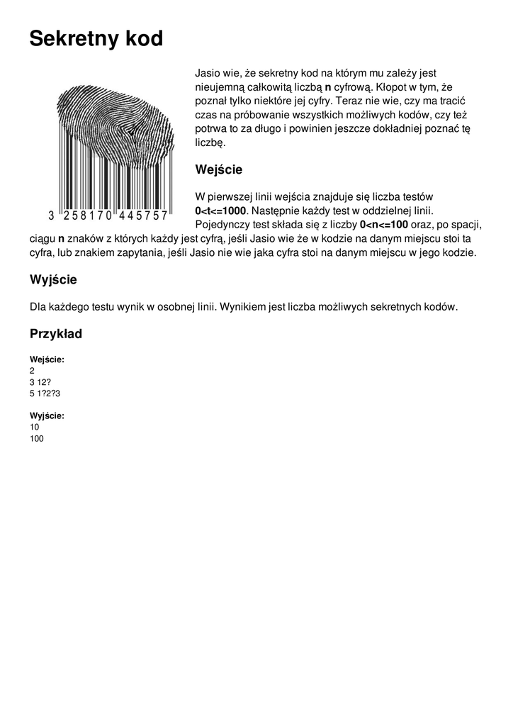 Sekretny kod Jasio wie, że sekretny kod na którym mu zależy jest nieujemną całkowitą liczbą n cyfrową. Kłopot w tym, że poznał tylko niektóre jej cyfry. Teraz nie wie, czy ma tracić czas na próbowanie wszystkich możliwych kodów, czy też potrwa to za długo i powinien jeszcze dokładniej poznać tę liczbę. Wejście W pierwszej linii wejścia znajduje się liczba testów 0<t<=1000. Następnie każdy test w oddzielnej linii. Pojedynczy test składa się z liczby 0<n<=100 oraz, po spacji, ciągu n znaków z których każdy jest cyfrą, jeśli Jasio wie że w kodzie na danym miejscu stoi ta cyfra, lub znakiem zapytania, jeśli Jasio nie wie jaka cyfra stoi na danym miejscu w jego kodzie. Wyjście Dla każdego testu wynik w osobnej linii. Wynikiem jest liczba możliwych sekretnych kodów. Przykład Wejście: 2 3 12? 5 1?2?3 Wyjście: 10 100