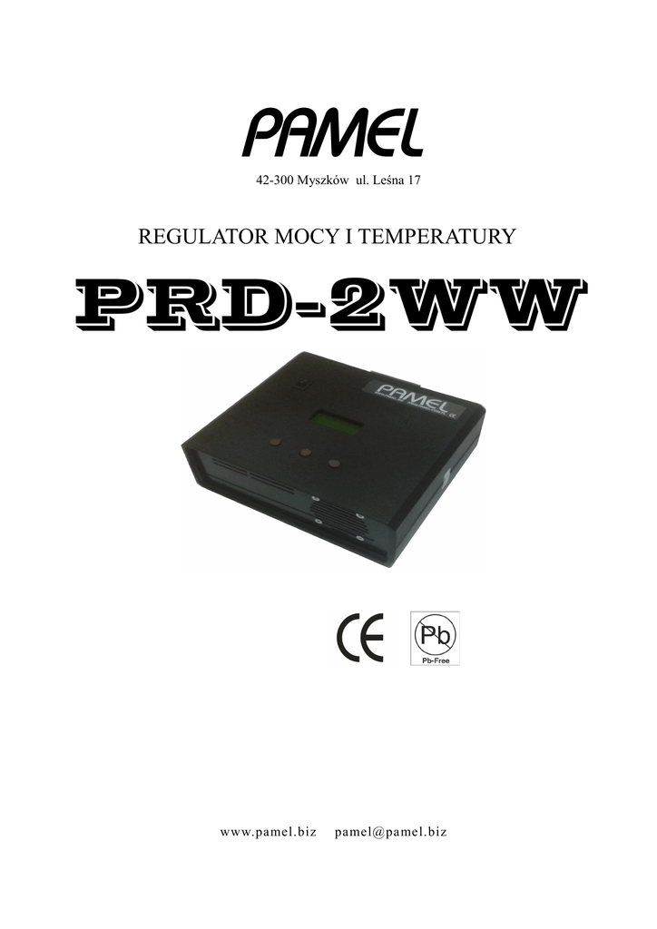 PAMEL 42-300 Myszków ul. Leśna 17 REGULATOR MOCY I TEMPERATURY PRD-2WW www.pamel.biz [email protected] Spis treści PRZEZNACZENIE ......................................................................................................................................3 ZALETY UKŁADU .....................................................................................................................................3 ZASADA DZIAŁANIA ...............................................................................................................................4 PIERWSZE URUCHOMIENIE.....................................................................................................................6 KALIBRACJA I REGULACJA WSPÓŁCZYNNIKA MOCY.....................................................................7 PARAMETRY TECHNICZNE .....................................................................................................................8 SCHEMAT PODŁĄCZENIA........................................................................................................................9 ZANIM ZADZWONISZ..............................................................................................................................10 OPIS WYPROWADZEŃ SONDY..............................................................................................................10 WARUNKI GWARANCJI...........................................................................................................................11 1 REGULATOR MOCY I TEMPERATURY PRD2WW PRZEZNACZENIE PRD2WW służy do regulacji mocy elementów grzejnych. W zależności od wersji maksymalna moc regulowana wynosi 3kW lub 5,5kW(PRD2WW+). Urządzenie nie służy do regulacji obwodów indukcyjnych oraz świetlnych. ZALETY UKŁADU Jest prosty w montażu i obsłudze, zapewnia optymalne sterowanie mocą grzałek. 2 ZASADA DZIAŁANIA W trybie MANUAL przy pomocy dwóch przycisków użytkownik może regulować moc dostarczaną do obwodu oraz temperaturę do której ma dążyć układ lub maksymalną odłączającą sterowanie grzałką. Aktualna nastawa mocy i temperatury jest wyświetlana na wyświetlaczu LCD. W przypadku zaniku napięcia układ zapamiętuje ustawioną moc i temperaturę. Nastawy reguluje się wciskając przyciski „+” „-” Przełączenie ekranów moc/temperatura/temperatura „Ta” dokonuje się krótko wciskając środkowy przycisk w czasie działania urządzenia. W trybie PID użytkownik może regulować moc dostarczaną do obwodu oraz temperaturę do której ma dążyć układ lub maksymalną odłączającą sterowanie grzałką. Moc dobierana jest automatycznie w zależności od różnicy temperatur: bieżącej i oczekiwanej. Regulując parametr WSP może regulować współczynnik mocy przypadający na różnicę temperatur. Gdy następuje niedogrzewanie należy zwiększyć współczynnik. Gdy następuje przegrzewanie zmniejszyć. Gdzie moc jest regulowana według wzoru P[%]=WSP*(T nastawiona-Taktualna). Do urządzenia można podłączyć drugą sondę. Druga sonda oprócz pomiaru drugiej temperatury umożliwia zakończenie pracy urządzenia. Jest to szczególnie przydatne np. gdy: -podczas wędzenia druga sonda umieszczona jest w mięsie i proces ma zakończyć się gdy zostanie osiągnięta temperatura np. „Ta=80” stopni -podczas destylacji druga sonda umieszczona jest w kegu i proces ma zakończyć się gdy w kegu temperatura przekroczy pewną wartość np. „Ta=90” stopni Aby wznowić pracę należy wcisnąć środkowy przycisk co spowoduje wyłączenie alarmu. Urządzenie reaguje dopiero po 30 sekundach przekroczenia temperatury „Ta” co daje czas na zmianę tej temperatury. 3 W celu zapewnienia lepszej stabilności użytkownik może wybrać sobie moc minimalną Pmin która jest dodawana do obliczonej mocy PID. Spowoduje to, że w momencie osiągnięcia temperatury żądanej grzanie pozostanie na poziomie np. 5%. Przełączenia trybów dokonuje się przez dłuższe przytrzymanie środkowego przycisku. Krótkie powoduje zmianę okien podglądu. 4 PIERWSZE URUCHOMIENIE UWAGA! Pierwsze uruchomienie proponujemy przeprowadzić na wodzie lub pustej komorze. Po stwierdzeniu prawidłowego funkcjonowania sond, wyjścia mocy można przeprowadzić uruchomienie na wsadzie. 1.Należy podłączyć urządzenie wg schematu. 2.W przypadku podłączenia dwóch sond należy rozpoznać która sonda służy do regulacji mocy (kolumna, komora), a która pełni funkcję alarmu (KEG, wędlina). Najlepiej zrobić to podgrzewając jedną z sond (np. ciepłem dłoni) , obserwując która temperatura ulega zmianie. 3.Zamocować sondy w urządzeniu. 4.Wcisnąć środkowy przycisk (dłuższe przyciśnięcie). W menu serwisowym ustawić tryb pracy (MANUAL, PID) 5.Wyjść z menu. 6.Ustawić temperaturę do której ma dążyć układ oraz temperaturę alarmu. Poniżej przykładowe nastawy. Destylacja Wędzenie T1=78stopni T1=50stopni Ta=99stopni Ta=80stopni 7.Rozpocząć proces. 8.W czasie pierwszego procesu obserwować temperatury. W przypadku niedogrzewania należy zwiększyć współczynnik WSP lub Pmin. W przypadku przegrzewania należy zmniejszyć parametry. 5 KALIBRACJA I REGULACJA WSPÓŁCZYNNIKA MOCY W celu zapewnienia dokładności procesu użytkownik może samodzielnie skalibrować sondę. Należy dłużej przytrzymać środkowy przycisk włączeniu zasilania użytkownik dokonuje kalibracji oraz regulacji współczynnika. Przyciskami „+” „-” ustawiany współczynnik mocy WSP. Nastawę zatwierdzamy przyciskiem „OK”. Dla sondy przyciskami „+” „-” ustawiany współczynnik liniowości (nachylenia prostej) „B” który powoduje wskazanie T'=B*T Nastawę zatwierdzamy przyciskiem „OK”. Pojawia się okno kalibracji temperatury z indeksem A. Następnie przyciskami „+” „-” ustawiany przesunięcie „A” które powoduje wskazanie T'=A+B*T . Nastawę zatwierdzamy przyciskiem „OK”. Zaleca się pozost