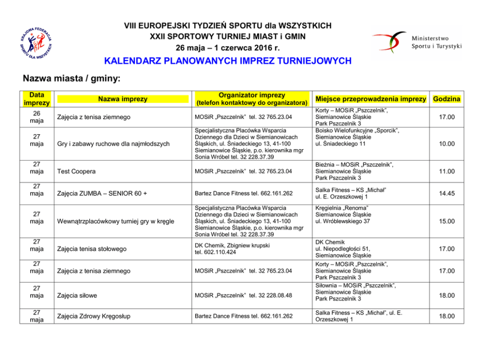VIII EUROPEJSKI TYDZIEŃ SPORTU dla WSZYSTKICH XXII SPORTOWY TURNIEJ MIAST i GMIN 26 maja – 1 czerwca 2016 r. KALENDARZ PLANOWANYCH IMPREZ TURNIEJOWYCH Nazwa miasta / gminy: Data imprezy 26 maja Nazwa imprezy Organizator imprezy (telefon kontaktowy do organizatora) Miejsce przeprowadzenia imprezy Godzina Korty – MOSiR „Pszczelnik”, Siemianowice Śląskie Park Pszczelnik 3 Boisko Wielofunkcyjne „Sporcik”, Siemianowice Śląskie ul. Śniadeckiego 11 Zajęcia z tenisa ziemnego MOSiR „Pszczelnik” tel. 32 765.23.04 27 maja Gry i zabawy ruchowe dla najmłodszych Specjalistyczna Placówka Wsparcia Dziennego dla Dzieci w Siemianowicach Śląskich, ul. Śniadeckiego 13, 41-100 Siemianowice Śląskie, p.o. kierownika mgr Sonia Wróbel tel. 32 228.37.39 27 maja Test Coopera MOSiR „Pszczelnik” tel. 32 765.23.04 Bieżnia – MOSiR „Pszczelnik”, Siemianowice Śląskie Park Pszczelnik 3 11.00 27 maja Zajęcia ZUMBA – SENIOR 60 + Bartez Dance Fitness tel. 662.161.262 Salka Fitness – KS „Michał” ul. E. Orzeszkowej 1 14.45 27 maja Wewnątrzplacówkowy turniej gry w kręgle Specjalistyczna Placówka Wsparcia Dziennego dla Dzieci w Siemianowicach Śląskich, ul. Śniadeckiego 13, 41-100 Siemianowice Śląskie, p.o. kierownika mgr Sonia Wróbel tel. 32 228.37.39 27 maja Zajęcia tenisa stołowego DK Chemik, Zbigniew krupski tel. 602.110.424 27 maja Zajęcia z tenisa ziemnego MOSiR „Pszczelnik” tel. 32 765.23.04 27 maja Zajęcia siłowe MOSiR „Pszczelnik” tel. 32 228.08.48 Zajęcia Zdrowy Kręgosłup Bartez Dance Fitness tel. 662.161.262 27 maja Kręgielnia „Renoma” Siemianowice Śląskie ul. Wróblewskiego 37 DK Chemik ul. Niepodległości 51, Siemianowice Śląskie Korty – MOSiR „Pszczelnik”, Siemianowice Śląskie Park Pszczelnik 3 Siłownia – MOSiR „Pszczelnik”, Siemianowice Śląskie Park Pszczelnik 3 Salka Fitness – KS „Michał”, ul. E. Orzeszkowej 1 17.00 10.00 15.00 17.00 17.00 18.00 18.00 27 maja Salka Fitness – KS „Michał”, ul. E. Orzeszkowej 1 Zajęcia Płaski Brzuch - Stretching Bartez Dance Fitness tel. 662.161.262 28 maja Zajęcia na trampolinie Bartez Dance Fitness tel. 662.161.262 28 maja Animacje na Rynku Miejskim Urząd Miasta Siemianowice Śląskie, Wydział Kultury i Sportu, ul. 27 Stycznia 1/3, tel. 32 765.62.93 Małgorzata Pichen 28 maja Zajęcia Step + Płaski Brzuch Bartez Dance Fitness tel. 662.161.262 28 maja Zajęcia z tenisa ziemnego 29 maja Nauka pływania 29 maja Zajęcia z tenisa ziemnego 30 maja Gimnastyka się z przedszkolakiem 30 maja Test Coopera 30 maja Rozgrywki Siatkówki uczniów gimnazjum nr 5 Zespół Szkół nr 1 tel. 32 220.14.80 Sala gimnastyczna ZS nr1 14.30 30 maja Zajęcia ruchowe dla seniorów. Turniej szóstek siatkarskich. Gimnazjum nr 2 w Siemianowicach Śląskich mała sala gimnastyczna Gimnazjum nr 2 w Siemianowicach Śląskich sala gimnastyczna DK Chemik ul. Niepodległości 51, Siemianowice Śląskie 14.40 30 maja Gimnazjum nr 2, ul. Przyjaźni 28, 41-103 Siemianowice Śląskie Justyna Pawłowska, tel. 500.852.778 Gimnazjum nr 2, ul. Przyjaźni 28, 41-103 Siemianowice Śląskie Wiesław Marcinkowski, tel. 602.491.612 DK Chemik, Zbigniew Krupski tel. 602.110.424 MOSiR „Pszczelnik” tel. 32 765.23.04 Przedszkole nr 10 tel. 32 228.65.83 MOSiR „Pszczelnik” tel. 32 765.23.04 30 maja Zajęcia taneczne dla dzieci 30 maja Nauka pływania 30 maja Zajęcia piłkarskie dla dzieci 30 maja Szkoła Pływania MEGA tel. 602.487.305 MOSiR „Pszczelnik” tel. 32 765.23.04 Sparing piłki nożnej Flow – Treningi i Szkolenia tel. 501.708.309 Siemianowicka Sp-nia Mieszkaniowa tel. 32 609.14.00 Specjalistyczna Placówka Wsparcia Dziennego dla Dzieci w Siemianowicach Śląskich, ul. Śniadeckiego 13, 41-100 Siemianowice Śląskie, tel. 32 228.37.39 p.o. kierownika mgr Sonia Wróbel Salka Fitness – KS „Michał”, ul. E. Orzeszkowej 1 Rynek Miejski 19.05 9.00 10.00 Salka Fitness – KS „Michał”, ul. E. Orzeszkowej 1 Korty – MOSiR „Pszczelnik”, Siemianowice Śląskie Park Pszczelnik 3 Basen – KS „Michał”, ul. E. Orzeszkowej 1 Korty – MOSiR „Pszczelnik”, Siemianowice Śląskie Park Pszczelnik 3 Przedszkole nr 10 w Siemianowicach Śląskich Bieżnia – MOSiR „Pszczelnik”, Siemianowice Śląskie Park Pszczelnik 3 Basen – KS „Michał”, ul. E. Orzeszkowej 1 11.00 17.00 9.00 17.00 10.30 11.00 15.30 16.00 16.00 Osiedle Węzłowiec 16.00 Boisko Wielofunkcyjne „Sporcik”, Siemianowice Śląskie ul. Śniadeckiego 11 16:30 MOSiR „Pszczelnik” tel. 32 765.23.04 30 maja Zajęcia z tenisa ziemnego 30 maja Nauka pływania 30 maja Zajęcia siłowe 30 maja 30 maja 30 maja 31 maja 31 maja 31 maja 31 maja 31 maja 31 maja 31 maja 31 maja Korty – MOSiR „Pszczelnik”, Siemianowice Śląskie Park Pszczelnik 3 17.00 Flow – Treningi i Szkolenia tel. 501.708.309 Basen – KS „Michał”, ul. E. Orzeszkowej 1 17.00 MOSiR „Pszczelnik” tel. 32 228.08.48 Siłownia – MOSiR „Pszczelnik”, Siemianowice Śląskie Park Pszczelnik 3 Salka Fitness – KS „Michał”, ul. E. Orzeszkowej 1 Salka Fitness – KS „Michał”, ul. E. Orzeszkowej 1 Salka Fitness – KS „Michał”, ul. E. Orzeszkowej 1 Zajęcia Step + Płaski Brzuch Bartez Dance Fitness tel. 662.161.262 Zajęcia BPU Bartez Dance Fitness tel. 662.161.262 Zajęcia Zumba Fitness Bartez Dance Fitness tel. 662.161.262 Turniej „Palanta” Turniej „Rzutobiegu” Turniej „Gra w pochodnię” Podchody „Wyprawa po skarb” Zespół Szkół nr 4 – Szkoła Podstawowa nr 4, tel. 32 220.13.78 Zespół Szkół nr 4 – Szkoła Podstawowa nr 4, tel. 32 220.13.78 Zespół Szkół nr 4 – Szkoła Podstawowa nr 4, tel. 32 220.13.78 Przedszkole nr 12 w Siemianowicach Śląskich, tel. 32 229.40.23 Przedszkole nr 10 tel. 32 228.65.83 Gimnastyka się z przedszkolakiem Dzień Dziecka i Sportu Program: 1. Wspólny aerobic na świeżym powietrzu. 2. Finały mistrzostw szkoły w minisiatkówce dziewcząt i chłopców klas IV-