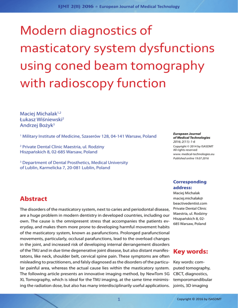EJMT 2(11) 2016 • European Journal of Medical Technology Modern diagnostics of masticatory system dysfunctions using coned beam tomography with radioscopy function Maciej Michalak1,2 Łukasz Wiśniewski2 Andrzej Bożyk3 1 Military Institute of Medicine, Szaserów 128, 04-141 Warsaw, Poland Private Dental Clinic Maestria, ul. Rodziny Hiszpańskich 8, 02-685 Warsaw, Poland 2 Department of Dental Prosthetics, Medical University of Lublin, Karmelicka 7, 20-081 Lublin, Poland European Journal of Medical Technologies 2016; 2(11): 1-6 Copyright © 2014 by ISASDMT All rights reserved www. medical-technologies.eu Published online 19.07.2016 3 Corresponding address: Maciej Michalak maciej.michalak@ beactivedentist.com The disorders of the masticatory system, next to caries and periodontal disease, Private Dental Clinic are a huge problem in modern dentistry in developed countries, including our Maestria, ul. Rodziny Hiszpańskich 8, 02own. The cause is the omnipresent stress that accompanies the patients ev685 Warsaw, Poland Abstract eryday, and makes them more prone to developing harmful movement habits of the masticatory system, known as parafunctions. Prolonged parafunctional movements, particularly, occlusal parafunctions, lead to the overload changes in the joint, and increased risk of developing internal derrangement disorders of the TMJ and in due time degenerative joint disease, but also distant manifestatons, like neck, shoulder belt, cervical spine pain. These symptoms are often misleading to practitioners, and falsly diagnosed as the disorders of the particular painful area, whereas the actual cause lies within the masticatory system. The following article presents an innovative imaging method, by NewTom 5G XL Tomography, which is ideal for the TMJ imaging, at the same time minimising the radiation dose, but also has many interdisciplinarily useful applications. 1 Key words: Key words: computed tomography, CBCT, diagnostics, temporomandibular joints, 3D imaging Copyright © 2016 by ISASDMT EJMT 2(11) 2016 • European Journal of Medical Technology parafunctions are these movement habits, within the masticatory system, during which no contact between the opposing teeth is observed, e.g. tongue parafunctions, biting of the lips or the cheeks’ mucous membrane, habitual biting of nails or objects. [7, 9, 10] Prolonged periods of parafunctional movements, may lead to the incorrect model of mandibular movement. In consequence, this causes disturbances within the TMJ and may give rise to an array of painful and/or painless symptoms. The main painless symptoms, that arise from the TMJ abnormalities, are the deviations from the standard range of motion of the mandible, tooth wear, periodontal changes and sound symptoms like popping and crackling. Painful symptoms include local and distant manifestations. Painful compression of the temporomandibular joint and masticatory system muscle pain are the local symptoms. The distant ones are muscle pain of neck, shoulder belt, cervical, thoracic and lumbosacral spinal sections. [12, 13, 15] The analysis of the acoustic symptoms, in the temporomandibular joint, during free mandibular movements, prompts the diagnosis of articular disc disorders. The disturbance in the correlation between the articular disc and the condyle, causes the popping sounds in the TMJ. Owing to the MRI and CT imaging of the TMJ, we know that these acoustic symptoms mainly occur, as the articular disc is anteriorly displaced during the maximum intercuspidation of the teeth. The popping sounds may also occur during more complex movements – anterior-medial and anterior-lateral. Prolonged parafunctional movements, particularly, as shown by our results, occlusal parafunctions, lead to the overload changes in the joint. This leads to the displacement of the articular disc, lack of correlation between the disc and the condyle and consequently pathological acoustic symptoms of popping. On the other hand, the presence of crackles in the TMJ usually indicates the existence of degenerative changes in the joints. [14, 16, 17] As the results of our previous studies show, the prolonged parafunctional habits increase the risk of acoustic symptoms during all types of mandibular movements [9,10]. The parafunctional movements that are more likely to cause acoustic symptoms are The simplest methods of imaging of the temporomandibular joints are the classic X-rays and layered photos made using panoramic imaging (Fig. 1). However, they do not include spatial information about the structures of the individual elements of the joint, thus its diagnostic value is limited. In order to obtain three-dimensional images of bony elements, we can use multi-row-detector computed tomography (MDCT) or coned beam computed tomography (CBCT). Series of images are used by the software to do the spatial reconstructions, that can be further presented in any form. The main difference between MDCT and CBCT in image acquisition is the shape of the radiation beam, detector and associated with that, possibility of manipulating the protocol. The purpose of both methods is to produce detailed images, reducing to the minimum the radiation dose. As both MDCT and CBCT are characterised by similar diagnostic value [1,3], when choosing between these methods, the key is the radiation dose that the patient receives during diagnostics. Despite the ongoing optimisation of imaging protocols in tomography, CBCT remains as the method, requiring the lowest doses of radiation, whilst maintaining the required quality [2]. The aetiology of disorders of the masticatory system The disorders of the masticatory system, next to caries and periodontal disease, are a huge problem in modern dentistry. The rapid increase of patients with symptoms of dysfunctions, is significantly noticeable in developed countries, including our own. The cause is the omnipresent stress that accompanies the patients everyday. In stressful situations, there is an inc
