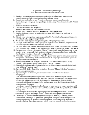 Regulamin Konkursu Fotograficznego "Moje ulubione miejsce w Powiecie Gryfickim" 1. Konkurs jest organizowany na zasadach określonych niniejszym regulaminem i zgodnie z powszechnie obowiązującymi przepisami prawa. 2. Organizatorem Konkursu jest Powiatowe Centrum Marketingu, Rozwoju Gospodarczego i Integracji Europejskiej z siedzibą przy Placu Zwycięstwa 37, 72-300 Gryfice 3. Konkurs ma charakter otwarty. 4. Udział w Konkursie jest bezpłatny. 5. Konkurs podzielony jest na tygodniowe edycje. 6. Zdjęcia należy wysyłać na adres: [email protected] 7. Każda edycja zaczyna się w poniedziałek o godz. 0.00 i kończy w niedzielę o godz.23.59 8. Zdjęcia będą udostępniane w galeriach na Profilu Powiatu Gryfickiego na Facebooku www.facebook.com/powiat.gryficki.9 9. Jeden autor może zgłosić maksymalnie jedną fotografię w tygodniu. 10. Do zdjęć należy dołączyć krótki opis: gdzie zdjęcie zostało zrobione, co przedstawia oraz dlaczego akurat to miejsce zostało wybrane. 11. Do Konkursu dopuszcza się zdjęcia kolorowe i czarno-białe. Nadsyłane pliki nie mogą mieć rozdzielczości większej, niż 2048x1536px. Plik nie może być większy, niż 4MB. 12. Raz zgłoszone zdjęcie w konkursie Zdjęcie Tygodnia, nie może być zgłaszane po raz kolejny w tej i innych edycjach konkursów fotograficznych na Powiatowym Profilu Facebooka www.facebook.com/powiat.gryficki.9 13. W każdej edycji głosowanie trwa 7 dni. Do głosowania uprawnieni są zarejestrowani i zalogowani Użytkownicy portalu facebook.com. Każdy użytkownik może głosować tylko jeden raz na dane zdjęcie. 14. Każdą edycję Konkursu wygrywa fotografia, która otrzyma największą liczbę ‘lajków’. Zwycięska praca otrzymuje tytuł „Zdjęcie Tygodnia”. 15. Równolegle z głosowaniem Internautów Jury wybierze jedną fotografię, której nada tytuł „Zdjęcie Tygodnia Jury”. 16. Ze wszystkich ‘Zdjęć Tygodnia’ zostanie wyłonione ‘Zdjęcie Miesiąca’ z ostatnim dniem każdego miesiąca. 17. Zgłoszenie prac na Konkurs jest równoznaczne z oświadczeniem, iż osoba nadsyłająca: - jest autorem/autorką załączonych zdjęć. Prawa osób portretowanych zostały wyjaśnione i osoby sportretowane wyrażają zgodę na wystawienie i ich publikowanie również dla celów reklamowych Konkursu oraz przyjmuje na siebie wszelkie roszczenia jakiejkolwiek natury, które osoby trzecie mogłyby kierować przeciwko organizatorom Konkursu, - przyjmuje warunki Regulaminu Konkursu, - wyraża zgodę na przetwarzanie swoich danych osobowych zgodnie z ustawą o Ochronie Danych Osobowych ( Dz.U.Nr.133 pozycja 883) - wyraża zgodę na nieodpłatne wykorzystywanie przez Organizatorów Konkursu nadesłanych zdjęć w dowolnym czasie i formie dla celów promocji Konkursu. 18. Organizatorzy zastrzegają sobie prawo do usuwania fotografii i tekstów o treści powszechnie uznawanej za obraźliwe, naruszające prawa osób trzecich lub prawo polskie, zawierających treści pornograficzne lub w sposób oczywisty godzące w uczucia religijne. Decyzja o usunięciu takich treści jest niepodważalna i ostateczna. 19. Organizatorzy zastrzegają sobie prawo zmiany postanowień niniejszego Regulaminu w przypadku zmian przepisów prawnych lub innych istotnych zdarzeń mających wpływ na organizowanie Konkursu. 20. Konkurs nie podlega przepisom ustawy z dnia 29 lipca 1992 roku o grach i zakładach wzajemnych (Dz. U. z 2004 roku Nr 4, poz. 27 z późn. zm.). 21. Niniejszy Regulamin wchodzi w życie z dniem rozpoczęcia Konkursu i obowiązuje do czasu jego zakończenia.