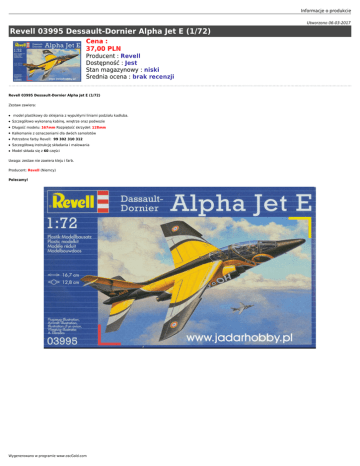 Informacje o produkcie Utworzono 06-03-2017 Revell 03995 Dessault-Dornier Alpha Jet E (1/72) Cena : 37,00 PLN Producent : Revell Dostępność : Jest Stan magazynowy : niski Średnia ocena : brak recenzji Revell 03995 Dessault-Dornier Alpha Jet E (1/72) Zestaw zawiera: ● model plastikowy do sklejania z wypukłymi liniami podziału kadłuba. ● Szczegółowo wykonaną kabinę, wnętrze oraz podwozie ● Długość modelu: 167mm Rozpiętość skrzydeł: 128mm ● Kalkomanie z oznaczeniami dla dwóch samolotów ● Potrzebne farby Revell: 99 302 310 312 ● Szczegółową instrukcję składania i malowania ● Model składa się z 60 części Uwaga: zestaw nie zawiera kleju i farb. Producent: Revell (Niemcy) Polecamy! Wygenerowano w programie www.oscGold.com Ważne informacje: Prosimy o dokładne zapoznanie się z zasadami działania naszego sklepu. To bardzo ważne i pozwoli na uniknięcie nieporozumień związanych z koniecznością oczekiwania na przesyłkę. Wszystkie zamówienia realizujemy w kolejności zgłoszeń. Wybranie "przesyłka priorytetowa" jako sposobu wysyłki nie oznacza, że paczka zostanie wysłana na drugi dzień. To tylko rodzaj usługi pocztowej. Firma Jadar-Model jest właścicielem dwóch sklepów. Jeden z nich to sklep internetowy, drugi zaś jest prawdziwy i mieści się w Warszawie, stolicy Polski. Te same modele i akcesoria oferowane w sklepie internetowym sprzedawane są w jednocześnie w obu sklepach. Ponieważ nasza oferta jest bardzo duża nie mamy magazynu z wielką ilością tych samych przedmiotów. Może zdarzyć się, że model, który chcesz kupić został sprzedany w drugim sklepie. Wtedy zostaniesz powiadomiony emailem, że realizacja Twojego zamówienia będzie dłuższa, ponieważ musimy uzupełnić magazyn i czekamy na dostawę od producenta. Prosimy o cierpliwość i wyrozumiałość. Nie ponosimy odpowiedzialności za różnicę w zawartości pudełka w stosunku do prezentowanego zdjęcia. Zdjęcia są zazwyczaj reklamówkami i mogą zawierać również inne części, które nie wchodzą w skład danego produktu. Salon Modelarski Jadar-Model Ul. Jagiellońska 58, 03-468 Warszawa (przy Pl.Hallera) tel.(0 22) 403-34-30 (w sprawie zamówień prosimy dzwonić: (0 22) 620-05-39) Zobacz w Zumi sklep jest czynny w godz.: pon.-pt. 11.oo 19.oo sobota 10.oo 14.oo Revell (Niemcy) - Model plastikowy do sklejania i malowania - Revell (Niemcy)