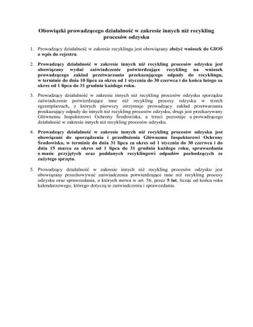 Obowiązki prowadzącego działalność w zakresie innych niż recykling procesów odzysku 1. Prowadzący działalność w zakresie recyklingu jest obowiązany złożyć wniosek do GIOŚ o wpis do rejestru. 2. Prowadzący działalność w zakresie innych niż recykling procesów odzysku jest obowiązany wydać zaświadczenie potwierdzające recykling na wniosek prowadzącego zakład przetwarzania przekazującego odpady do recyklingu, w terminie do dnia 10 lipca za okres od 1 stycznia do 30 czerwca i do końca lutego za okres od 1 lipca do 31 grudnia każdego roku. 3. Prowadzący działalność w zakresie innych niż recykling procesów odzysku sporządza zaświadczenie potwierdzające inne niż recykling procesy odzysku w trzech egzemplarzach, z których pierwszy otrzymuje prowadzący zakład przetwarzania przekazujący odpady do innych niż recykling procesów odzysku, drugi jest przekazywany Głównemu Inspektorowi Ochrony Środowiska, a trzeci pozostaje u prowadzącego działalność w zakresie innych niż recykling procesów odzysku. 4. Prowadzący działalność w zakresie innych niż recykling procesów odzysku jest obowiązani do sporządzenia i przedłożenia Głównemu Inspektorowi Ochrony Środowiska, w terminie do dnia 31 lipca za okres od 1 stycznia do 30 czerwca i do dnia 15 marca za okres od 1 lipca do 31 grudnia każdego roku, sprawozdania o masie przyjętych oraz poddanych recyklingowi odpadów pochodzących ze zużytego sprzętu. 5. Prowadzący działalność w zakresie innych niż recykling procesów odzysku jest obowiązany przechowywać zaświadczenia potwierdzające inne niż recykling procesy odzysku oraz sprawozdania, o których mowa w art. 56, przez 5 lat, licząc od końca roku kalendarzowego, którego dotyczą te zaświadczenia i sprawozdania.