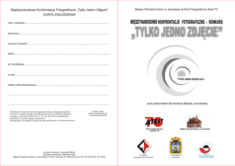 Międzynarodowe Konfrontacje Fotograficzne „Tylko Jedno Zdjęcie” KARTA ZGŁOSZENIA Miejski Ośrodek Kultury w Jarosławiu Klub Fotograficzny Atest 70 Imię i nazwisko................................................................................................................ MIĘDZYNARODOWE KONFRONTACJE FOTOGRAFICZNE – KONKURS: tytuł pracy....................................................................................................................... ,,TYLKO JEDNO ZDJĘCIE” wymiary fotografii........................................................................................................................ adres.............................................................................................................................. tel. kontaktowy................................................................................................................ e-mail............................................................................................................................. TYLKO JEDNO ZDJĘCIE 2011 krótka notka fotograficzna........................................................................................................... . .................................................................................................................................................... . ..................................................................................................................................................... Oświadczam, że jestem autorem zgłoszonej pracy, akceptuję regulamin konkursu i wyrażam zgodę na publikowanie danych osobowych zgodnie z ustawą z dnia 29.08.1997r. (Dz. U. Nr 133, poz. 883 z późniejszymi zmianami) o ochronie danych osobowych. Oświadczam, że zgłoszona praca nie była nagrodzona w innych konkursach. pod patronatem Burmistrza Miasta Jarosławia czytelny podpis podpis równoznaczny jest z akceptacją regulaminu 7 Klub fotograficzny “ATEST 70” Kurator Konkursu: Krzysztof Mruk Sekretarz Konkursu: Marzena Stęc Miejski Ośrodek Kultury w Jarosławiu 37-500 Jarosław pl. Mickiewicza 6 tel. 016 6214434, 6213294 Fundacja „Fotografia dla Przyszłości” Urząd Miasta Jarosławia FOTOKLUB RZECZYPOSPOLIT EJ POLSKIE J STOWARZYSZENIE TWÓRCÓW REGULAMIN Międzynarodowe Konfrontacje Fotograficzne „TYLKO JEDNO ZDJĘCIE 2011” WARUNKI UDZIAŁU: 1.Konfrontacje organizowane są na zasadzie konkursu - dostępne dla wszystkich fotografujących. 2.Każdy autor może nadesłać tylko jedno zdjęcie czarno-białe lub barwne, technika dowolna (nie podpisane) do którego należy dołączyć wglądówkę na płycie CD/ DVD oraz czytelnie wypełnioną kartę zgłoszenia. 3.Format prac od 20 x 30 do 40 x 60 bez paspartou z tym, że krótszy bok może mieć min 20 cm zaś dłuższy max 60 cm uzasadnione koncepcją autorską. Zdjęcie nie może być podklejone ani oprawione. 4.Istnieje możliwość przesłania pracy drogą elektroniczną (format JPG o rozdzielczości 300 dpi) na adres: [email protected] z dopiskiem Tylko Jedno Zdjęcie. Odbitkę pracy wykona organizator (maksymalny format: 30x45 cm). 5.Oceny prac, podziału nagród, wyboru prac do katalogu oraz na wystawę dokona Jury powołane przez organizatorów. 6.Nagrodzone i wyróżnione prace przechodzą na własność organizatorów. 7.Każdy uczestnik wystawy pokonkursowej otrzyma pamiątkowy katalog. 8.Organizator zastrzega sobie prawo do wielokrotnego, nieodpłatnego rozpowszechniania, utrwalania i powielania prac na potrzeby konfrontacji tj.: prezentacji wystawy konkursowej, reprodukcji w katalogu, w mediach, w internecie, a także w okolicznościowych wydawnictwach marketingowych i promujących Konfrontacje. 9.Prace niespełniające warunków regulaminu nie będą podlegać ocenie Jury. 10.Fotografie, które brały udział w poprzednich edycjach Konfrontacji Fotograficznych „Tylko Jedno Zdjęcie” nie będą oceniane oraz eksponowane na wystawie pokonkursowej. 11.Organizatorzy nie biorą odpowiedzialności za ewentualne zaginięcie lub uszkodzenie prac podczas transportu. 12.Za udział w konfrontacjach należy wnieść opłatę w wysokości 30 zł lub 10 euro, natomiast za zdjęcia przesłane drogą elektroniczną dodatkowa opłata celem wykonania fotografii w wysokości 15 zł. lub 5 euro na konto: Miejski Ośrodek Kultury w Jarosławiu PKO SA I o/Jarosław 47 1240 2571 1111 0010 1417 0097 z dopiskiem „Międzynarodowe Konfrontacje Fotograficzne 2011” z podanym imieniem, nazwiskiem i adresem autora pracy. 13.Prace należy wysyłać na adres: Miejski Ośrodek Kultury Pl. A. Mickiewicza 6, 37-500 Jarosław z dopiskiem „Międzynarodowe Konfrontacje Fotograficzne 2011”. 1. Nadesłana praca jest równoznacznie oświadczeniem posiadania praw autorskich do zdjęcia. Prawa osób portretowanych zostały wyjaśnione a autor prac posiada stosowne zezwolenie na wykorzystanie wizerunku osób utrwalonych na fotografii na potrzeby konfrontacji. ( ustawa z dnia 4 lutego 1994 r. z późniejszymi zmianami o prawie autorskim i prawach pokrewnych). 2.Autor zdjęcia akceptuje warunki regulaminu i wyraża zgodę na przetwarzanie danych osobowych zgodnie z ustawą z dnia 29.08.1997 r. o ochronie danych osobowych ( Dz. U. Nr 133, poz. 883 z późniejszymi zmianami) na potrzeby Konfrontacji i w celach marketingowych. 3.Organizator nie ponosi odpowiedzialności za ewentualne szkody spowodowane opublikowaniem nieprawdziwych danych osobowych bądź innych nieprawdziwych informacji opartych na zgłoszeniu sporządzonym przez uczestników. KALENDARIUM: 1. Ogłoszenie regulaminu Konfrontacji marzec 2011 r. 2. Termin nadsyłania prac do 10 września 2011 r. (decyduje data stempla pocztowego na przesyłce). 3. Ogłoszenie wyników Konfrontacji do 9 października 2011 r. 4. Powiadomienie nagrodzonych i zakwalifikowanych na wystawę pokonkursową do 22 października 2011 r, na stronach: www.mok-jar.pl i www.jaroslaw.pl 5. Ekspozycja prac: 29.10.2011 - 18.11.2011 r., „Galeria R