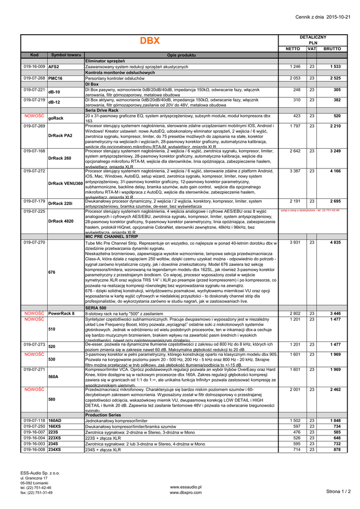 Cennik z dnia 2015-10-21 DBX Kod Symbol towaru Opis produktu Eliminator sprzężeń 019-16-009 AFS2 Zaawansowany system redukcji sprzężeń akustycznych Kontrola monitorów odsłuchowych 019-07-268 PMC16 Personlany kontroler odsłuchów DI Box DI Box pasywny, wzmocnienie 0dB/20dB/40dB, impedancja 150kΩ, odwracanie fazy, włącznik 019-07-221 dB-10 zerowania, filtr górnozaporowy, metalowa obudowa DI Box aktywny, wzmocnienie 0dB/20dB/40dB, impedancja 150kΩ, odwracanie fazy, włącznik 019-07-219 dB-12 zerowania, filtr górnozaporowy,zasilanie od 20V do 48V, metalowa obudowa Seria Drive Rack 20 x 31-pasmowy graficzne EQ, system antysprzężeniowy, subsynh module, moduł kompresora dbx NOWOŚĆ goRack 163 Procesor sterujący systemem nagłośnienia, sterowanie zdalne urządzeniami mobilnymi IOS, Android i 019-07-269 Windows! Kreator ustawień: nowe AutoEQ, udoskonalony eliminator sprzężeń, 2 wejścia / 6 wyjść, DrRack PA2 zwrotnica sygnału, kompresor, limiter, do 75 presetów możliwych do zapisania na stałe, korektor parametryczny na wejściach i wyjściach, 28-pasmowy korektor graficzny, automatyczna kalibracja, wejście dla opcjonalnego mikrofonu RTA-M, wyświetlacz, gniazda XLR. Procesor sterujący systemem nagłośnienia, 2 wejścia / 6 wyjść, zwrotnica sygnału, kompresor, limiter, 019-07-168 system antysprzężeniowy, 28-pasmowy korektor graficzny, automatyczna kalibracja, wejście dla DrRack 260 opcjonalnego mikrofonu RTA-M, wejście dla sterowników, linia opóźniająca, zabezpieczenie hasłem, wyświetlacz, gniazda XLR Procesor sterujący systemem nagłośnienia, 2 wejścia / 6 wyjść, sterowanie zdalne z platform Android, 019-07-272 iOS, Mac, Windows, AutoEQ, setup wizard, zwrotnica sygnału, kompresor, limiter, nowy system DrRack VENU360 antysprzężeniowy, 31-pasmowy korektor graficzny, 12-pasmowy korektor parametryczny, subharmoniczne, backline delay, bramka szumów, auto gain control, wejście dla opcjonalnego mikrofonu RTA-M i współpraca z AutoEQ, wejście dla sterowników, zabezpieczenie hasłem, wyświetlacz, gniazda XLR Dwukanałowy procesor dynamiczny, 2 wejścia / 2 wyjścia, korektory, kompresor, limiter, system 019-07-179 DrRack 220i antysprzężeniowy, bramka szumów, de-eser, bez wyświetlacza Procesor sterujący systemem nagłośnienia, 4 wejścia analogowe i cyfrowe AES/EBU oraz 8 wyjść 019-07-225 analogowych i cyfrowych AES/EBU, zwrotnica sygnału, kompresor, limiter, system antysprzężeniowy, DrRack 4820 28-pasmowy korektor graficzny, 9-pasmowy korektor parametryczny, linia opóźniająca, zabezpieczenie hasłem, protokół HiQnet, opcjonalnie CobraNet, sterowniki zewnętrzne, 48kHz i 96kHz, bez wyświetlacza, gniazda XLR MIC PRE CHANNEL STRIP 019-07-270 Tube Mic Pre Channel Strip. Reprezentuje on wszystko, co najlepsze w ponad 40-letnim dorobku dbx w dziedzinie przetwarzania dynamiki sygnału. Nieskazitelna brzmieniowo, zapewniająca wysokie wzmocnienie, lampowa sekcja przedwzmacniacza Class-A, która działa z napięciem 250 woltów, dzięki czemu uzyskać można - odpowiednio do potrzeb sygnał zarówno krystalicznie czysty, jak i dowolnie zniekształcony. Model 676 zawiera też sekcję kompresora/limitera, wzorowaną na legendarnym modelu dbx 162SL, jak również 3-pasmowy korektor 676 parametryczny z przestrajanym środkiem. Co więcej, procesor wyposażony został w wejście symetryczne XLR oraz wyjścia TRS 1/4” i XLR po preampie (przed kompresorem) i po kompresorze, co pozwala na realizację kompresji równoległej bez wyprowadzania sygnału na zewnątrz. 676 - dzięki solidnej konstrukcji, wintydżowemu posmakowi, wychyłowemu miernikowi VU oraz opcji wyposażenia w kartę wyjść cyfrowych w niedalekiej przyszłości - to doskonały channel strip dla profesjonalistów, do wykorzystania zarówno w studiu nagrań, jak w zastosowaniach live. NOWOŚĆ PowerRack 8 NOWOŚĆ 510 019-07-273 520 NOWOŚĆ 530 019-07-271 560A NOWOŚĆ 580 019-07-118 019-07-250 019-16-007 019-16-004 019-16-003 019-16-008 160AD 166XS 223S 223XS 234S 234XS SERIA 500 8-slotowy rack na karty "500" z zasilaniem Syntetyzer częstotliwości subharmonicznych. Pracuje dwupasmowo i wyposażony jest w niezależny układ Low Frequency Boost, który pozwala „wyciągnąć” ostatnie soki z niskotonowych systemów głośnikowych. Jednak w odróżnieniu od wielu podobnych procesorów, ten w inkarnacji dbx-a cechuje się bardzo muzycznym brzmieniem, brakiem wpływu na zawartość pasm średnich i wysokich częstotliwości, nawet przy najintensywniejszym działaniu. De-esser, pozwala na dynamiczne tłumienie częstotliwości z zakresu od 800 Hz do 8 kHz, których ich poziom zmienia się w zakresie nawet 60 dB. Maksymalna głębokość redukcji to 20 dB. 3-pasmowy korektor w pełni parametryczny, którego konstrukcję oparto na klasycznym modelu dbx 905. Pozwala na korygowanie poziomu pasm 20 - 500 Hz, 200 Hz - 5 kHz oraz 800 Hz - 20 kHz. Skrajne filtry można przełączać w tryb półkowy, zaś głębokość tłumienia/podbicia to +/-15 dB. Kompresor/limiter VCA. Oprócz podstawowych regulacji pozwala an wybór trybów OverEasy oraz Hard Knee, które dostępne są w rackowym procesorze dbx 160A. Zakres regulacji głębokości kompresji zawiera się w granicach od 1:1 do 1:∞, ale unikalna funkcja Infinity+ pozwala zastosować kompresję ze współczynnikiem ujemnym. Przedwzmacniacz mikrofonowy. Charakteryzuje się bardzo niskim poziomem szumów i 60decybelowym zakresem wzmocnienia. Wyposażony został w filtr dolnozaporowy o przestrajanej częstotliwości odcięcia, wskazówkowy miernik VU, dwupasmową korekcję LOW DETAIL i HIGH DETAIL i tłumik 20 dB. Zapewnia też zasilanie fantomowe 48V i pozwala na odwracanie biegunowości sygnału. Production Series Jednokanałowy kompresor/limiter Dwukanałowy kompresor/limiter/bramka szumów Zwrotnica sygnałowa: 2-drożna w Stereo, 3-drożna w Mono 223S + złącza XLR Zwrotnica sygnałowa: 2 lub 3-drożna w Stereo, 4-drożna w Mon
