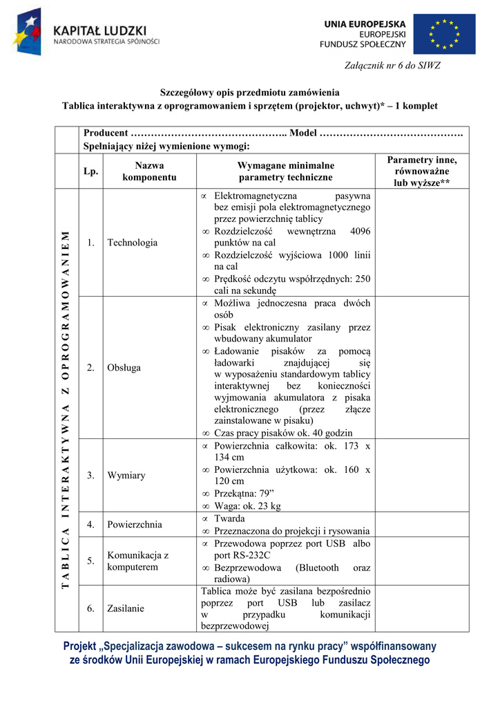 Załącznik nr 6 do SIWZ TABLICA INTERAKTYWNA Z OPROGRAMOWANIEM Szczegółowy opis przedmiotu zamówienia Tablica interaktywna z oprogramowaniem i sprzętem (projektor, uchwyt)* – 1 komplet Producent ……………………………………….. Model ……………………………………. Spełniający niżej wymienione wymogi: Parametry inne, Nazwa Wymagane minimalne Lp. równoważne komponentu parametry techniczne lub wyższe** • Elektromagnetyczna pasywna bez emisji pola elektromagnetycznego przez powierzchnię tablicy • Rozdzielczość wewnętrzna 4096 punktów na cal 1. Technologia • Rozdzielczość wyjściowa 1000 linii na cal • Prędkość odczytu współrzędnych: 250 cali na sekundę • Możliwa jednoczesna praca dwóch osób • Pisak elektroniczny zasilany przez wbudowany akumulator • Ładowanie pisaków za pomocą się ładowarki znajdującej 2. Obsługa w wyposażeniu standardowym tablicy interaktywnej bez konieczności wyjmowania akumulatora z pisaka elektronicznego (przez złącze zainstalowane w pisaku) • Czas pracy pisaków ok. 40 godzin • Powierzchnia całkowita: ok. 173 x 134 cm • Powierzchnia użytkowa: ok. 160 x 3. Wymiary 120 cm • Przekątna: 79” • Waga: ok. 23 kg • Twarda 4. Powierzchnia • Przeznaczona do projekcji i rysowania • Przewodowa poprzez port USB albo Komunikacja z port RS-232C 5. komputerem • Bezprzewodowa (Bluetooth oraz radiowa) Tablica może być zasilana bezpośrednio poprzez port USB lub zasilacz 6. Zasilanie w przypadku komunikacji bezprzewodowej Projekt „Specjalizacja zawodowa – sukcesem na rynku pracy” współfinansowany ze środków Unii Europejskiej w ramach Europejskiego Funduszu Społecznego PROJEKTOR MULTI MEDIALNY 7. Oprogramowanie 8. Wyposażenie 9. Gwarancja 2. 3. 4. Rozdzielczość rzeczywista Kontrast Jasność Technologia 5. Żywotność lampy 6. Moc lampy 7. Poziom szumu 8. Interfejs 1. • Umożliwiające wykorzystanie wszystkich funkcjonalności tablicy • Rozpoznawanie narysowanych odręcznie kształtów i przekształcanie ich na figury geometryczne • Mechanizm przeciągnij i upuść • Narzędzie umożliwiające tworzenie własnych ćwiczeń interaktywnych • Wpisywanie i zachowywanie notatek wykonanych przy pomocy tablicy w plikach popularnych aplikacji oprogramowania biurowego i możliwość późniejszej edycji dokonywanych wpisów Wstawianie różnego rodzaju wzorców tła, np. papier w kratkę, papier w linię, nutowy, układ współrzędnych, z zewnętrznej bazy programu tablicę poprzez obsługującego mechanizm przeciągnij i upuść • Kabel USB o długości o długości ok. 5 m • Kabel RS-232 C o długości ok. 8 m • Zasilacz uniwersalny input/output • Uchwyt do mocowania tablicy na ścianie • Płyta CD z oprogramowaniem • Instrukcje z instalacjami • Pisaki interaktywne do tablicy (białoniebieski, niebiesko-biały) – 4 sztuki • Ładowarka do pisaków (mocowana i zasilana bezpośrednio z tablicy) – 1 sztuka 24 miesiące XGA (1024 x 768) 13000:1 3000ANSI Lumenów DLP 4500 h – tryb normalny 6000 h – tryb oszczędny 1000 h – tryb SmartEco 190W 328/28 dBA (tryb normalny/tryb ekonomiczny) Computer in (D-sub 15 pin) x 2 Monitor out (D-sub 15 pin) x 1 Projekt „Specjalizacja zawodowa – sukcesem na rynku pracy” współfinansowany ze środków Unii Europejskiej w ramach Europejskiego Funduszu Społecznego Composite Video in (RCA) x 1 S-Video in (Mini DIN 4 pin) x 1 HDMI x 1 Audio in (Mini Jack) x 2 Audio out (Mini Jack) x 1 Audio L/R in (RCA) x 1 Speaker x 1 (10W) USB (Type Mini B) x 1 RS232 (DB-9pin) x 1 LAN (RJ45) x 1 10. Rozmiar obrazu (przekątna) Waga 11. Wyposażenie 12. Zasilanie 13. Uchwyt 14. Gwarancja 9. 60”~ 300” ok. 2,6 kg Pilot Baterie do pilota Kabel zasilający Instrukcja obsługi w języku polskim Kabel VGA(D-sub 15 pin) Zasłonka obiektywu Lampa Torba AC 100 do 240 V, 50 do 60 Hz • Uchwyt ścienny do projektorów krótkoogniskowych • Regulowana długość ramienia w zakresie od 63 do 116 cm • Możliwość pochylenia w osi uchwytu +/- 42o • Możliwość regulacji pochylenia o na boki +/-42 • Maksymalny udźwig do 12 kg • Możliwość ukrycia kabli w uchwycie • Materiał – aluminium • Kolor zgodny z kolorem projektora • Dodatkowa linka obciążająca w zestawie 24 miesiące * Należy wskazać oferowany produkt, nazwa producenta + typ/model ** Należy wypełnić w przypadku, jeżeli oferowany towar posiada parametry inne, przynajmniej równoważne lub wyższe ....................................................................... podpis osoby – osób upoważnionych do składania oświadczeń woli w imieniu wykonawcy Projekt „Specjalizacja zawodowa – sukcesem na rynku pracy” współfinansowany ze środków Unii Europejskiej w ramach Europejskiego Funduszu Społecznego