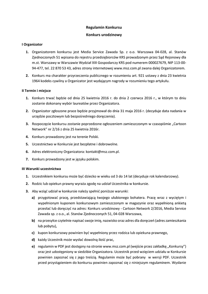 Regulamin Konkursu Konkurs urodzinowy I Organizator 1. Organizatorem konkursu jest Media Service Zawada Sp. z o.o. Warszawa 04-028, al. Stanów Zjednoczonych 51 wpisana do rejestru przedsiębiorców KRS prowadzonym przez Sąd Rejonowy dla m.st. Warszawy w Warszawie Wydział XIII Gospodarczy KRS pod numerem 000027679, NIP 113-0094-477, tel. 22 870 53 43, adres strony internetowej www.msz.com.pl zwana dalej Organizatorem. 2. Konkurs ma charakter przyrzeczenia publicznego w rozumieniu art. 921 ustawy z dnia 23 kwietnia 1964 kodeks cywilny a Organizator jest wydającym nagrody w rozumieniu tego artykułu. II Termin i miejsce 1. Konkurs trwać będzie od dnia 25 kwietnia 2016 r. do dnia 2 czerwca 2016 r., w którym to dniu zostanie dokonany wybór laureatów przez Organizatora. 2. Organizator zgłoszone prace będzie przyjmował do dnia 31 maja 2016 r. (decyduje data nadania w urzędzie pocztowym lub bezpośredniego doręczenia). 3. Rozpoczęcie konkursu zostanie poprzedzone ogłoszeniem zamieszczonym w czasopiśmie „Cartoon Network” nr 2/16 z dnia 25 kwietnia 2016r. 4. Konkurs prowadzony jest na terenie Polski. 5. Uczestnictwo w Konkursie jest bezpłatne i dobrowolne. 6. Adres elektroniczny Organizatora: [email protected]. 7. Konkurs prowadzony jest w języku polskim. III Warunki uczestnictwa 1. Uczestnikiem konkursu może być dziecko w wieku od 3 do 14 lat (decyduje rok kalendarzowy). 2. Rodzic lub opiekun prawny wyraża zgodę na udział Uczestnika w konkursie. 3. Aby wziąć udział w konkursie należy spełnić poniższe warunki: a) przygotować pracę, przedstawiającą twojego ulubionego bohatera. Pracę wraz z wyciętym i wypełnionym kuponem konkursowym zamieszczonym w magazynie oraz wypełnioną ankietą przesłać lub doręczyć na adres: Konkurs urodzinowy - Cartoon Network 2/2016, Media Service Zawada sp. z o.o., al. Stanów Zjednoczonych 51, 04-028 Warszawa, b) na przesyłce czytelnie napisać swoje imię, nazwisko oraz adres dla doręczeń (adres zamieszkania lub pobytu), c) kupon konkursowy powinien być wypełniony przez rodzica lub opiekuna prawnego, d) każdy Uczestnik może wysłać dowolną ilość prac, e) regulamin w PDF jest dostępny na stronie www.msz.com.pl (wejście przez zakładkę „Konkursy”) oraz jest udostępniony w siedzibie Organizatora. Uczestnik przed wzięciem udziału w Konkursie powinien zapoznać się z jego treścią. Regulamin może być pobrany w wersji PDF. Uczestnik przed przystąpieniem do konkursu powinien zapoznać się z niniejszym regulaminem. Wysłanie kuponu konkursowego oznacza, iż Uczestnik Konkursu (rodzic/opiekun prawny) zapoznał się z Regulaminem i polityką prywatności, f) biorąc udział w Konkursie, Uczestnik nie będzie dostarczać treści bezprawnych, w szczególności używać obraźliwych oznaczeń . UWAGA: Z uwagi na fakt, iż Uczestnikiem Konkursu może być osoba małoletnia, poniżej 18 lat, z Regulaminem Konkursu oraz Polityką prywatności powinien zapoznać się rodzic albo opiekun prawny. Określone czynności powinny być podejmowane przez rodzica (opiekuna prawnego) albo być przez niego potwierdzone. 4. Uczestnikowi nie przysługuje zwrot kosztów wykonania i przesłania prac. 5. Organizator ma prawo zatrzymania oryginału prac zgłoszonych do konkursu i ich publikacji. IV Wyłonienie laureata 1. Organizator w terminie do 2 czerwca wyłoni 69 laureatów. 2. Spośród Uczestników Konkursu, którzy dokonali Zgłoszenia do Konkursu. Nagroda przyznana zostanie temu Uczestnikowi, którego odpowiedź na zadanie Konkursowe zostanie uznana za najciekawszą, i która najpełniej spełniła kryteria Konkursu opisane poniżej. Laureatów Konkursu wybierze Komisja Konkursowa, składająca się z 3-5 osób, która przy wyborze Laureata będzie kierowała się następującymi kryteriami: • zgodność merytoryczna, • oryginalność, pomysłowość, • kreatywność, • poprawność językowa. 3. Przy wyborze Laureata nie ma znaczenia kolejność zgłoszeń. 4. Organizator sporządzi listę laureatów zawierającą imiona, nazwiska i adresy dla doręczeń laureatów, rodzaj przyznanej nagrody, datę i podpis osoby sporządzającej listę. 5. Informacja o otrzymaniu nagrody głównej lub nagród dodatkowych zostanie przesłana na adres e-mail Uczestnika lub rodzica/opiekuna prawnego podany w kuponie konkursowym oraz zostanie opublikowana wraz z imieniem, nazwiskiem, miejscowością zamieszkania w czasopiśmie „Cartoon Network” nr 4/16 z dnia 25.08.2016r. lub na stronie internetowej. V Nagrody 1. Laureaci konkursu otrzymają nagrody w postaci: a) 2 zestawy LEGO Star Wars 75111 ufundowane przez firmę LEGO Polska Sp. z o.o. o wartości jednostkowej 130 zł brutto. b) 2 zestawy LEGO Star Wars 75112 ufundowane przez firmę LEGO Polska Sp. z o.o. o wartości jednostkowej 150 zł brutto. c) 2 zestawy LEGO Star Wars 75113 ufundowane przez firmę LEGO Polska Sp. z o.o. o wartości jednostkowej 90 zł brutto. d) 1 parasol „Pora na przygodę” ufundowany przez firmę Media Service Zawada Sp. z o.o. o wartości jednostkowej 70 zł brutto e) 1 torba „Pora na przygodę” ufundowana przez firmę Media Service Zawada Sp. z o.o. o wartości jednostkowej 60 zł brutto f) 2 torby z Atomówkami ufundowane przez firmę Media Service Zawada Sp. z o.o. o wartości jednostkowej 60 zł brutto g) 1 niebieska torba Cartoon Network ufundowana przez firmę Media Service Zawada Sp. z o.o. o wartości jednostkowej 40 zł brutto h) 1 worek Cartoon Network ufundowany przez firmę Media Service Zawada Sp. z o.o. o wartości jednostkowej 25 zł brutto i) 1 plecak „The Amazing world of Gumball” ufundowany przez firmę Media Service Zawada Sp. z o.o. o wartości jednostkowej 60 zł brutto j) 20 figurek piłkarzy Reprezentacji Polski ufundowanych przez firmę TM Toys Sp. z o.o. o wartości jednostkowej 34 zł brutto k) 2 zabawki Amazing Zhus – Kapelusz ufundowane przez firmę COBI S.A. o wartości jednostkowej 87 zł brutto. l) 2 zabawk