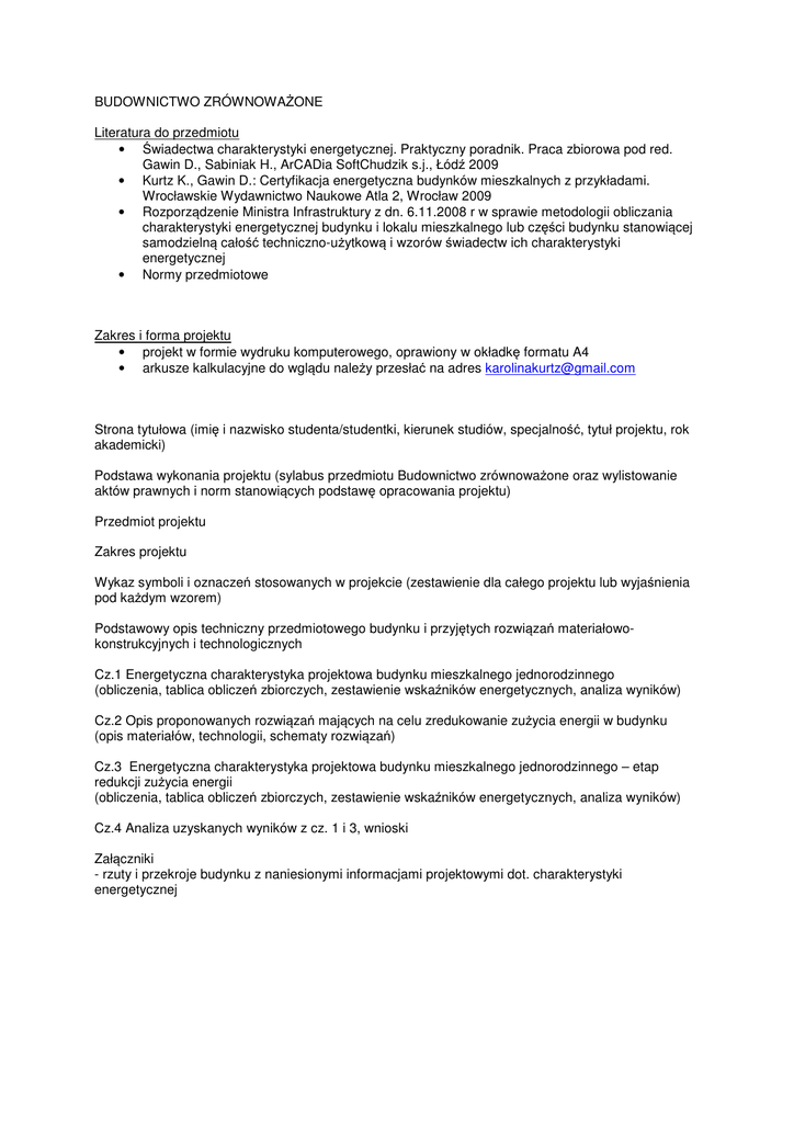 BUDOWNICTWO ZRÓWNOWAŻONE Literatura do przedmiotu • Świadectwa charakterystyki energetycznej. Praktyczny poradnik. Praca zbiorowa pod red. Gawin D., Sabiniak H., ArCADia SoftChudzik s.j., Łódź 2009 • Kurtz K., Gawin D.: Certyfikacja energetyczna budynków mieszkalnych z przykładami. Wrocławskie Wydawnictwo Naukowe Atla 2, Wrocław 2009 • Rozporządzenie Ministra Infrastruktury z dn. 6.11.2008 r w sprawie metodologii obliczania charakterystyki energetycznej budynku i lokalu mieszkalnego lub części budynku stanowiącej samodzielną całość techniczno-użytkową i wzorów świadectw ich charakterystyki energetycznej • Normy przedmiotowe Zakres i forma projektu • projekt w formie wydruku komputerowego, oprawiony w okładkę formatu A4 • arkusze kalkulacyjne do wglądu należy przesłać na adres [email protected] Strona tytułowa (imię i nazwisko studenta/studentki, kierunek studiów, specjalność, tytuł projektu, rok akademicki) Podstawa wykonania projektu (sylabus przedmiotu Budownictwo zrównoważone oraz wylistowanie aktów prawnych i norm stanowiących podstawę opracowania projektu) Przedmiot projektu Zakres projektu Wykaz symboli i oznaczeń stosowanych w projekcie (zestawienie dla całego projektu lub wyjaśnienia pod każdym wzorem) Podstawowy opis techniczny przedmiotowego budynku i przyjętych rozwiązań materiałowokonstrukcyjnych i technologicznych Cz.1 Energetyczna charakterystyka projektowa budynku mieszkalnego jednorodzinnego (obliczenia, tablica obliczeń zbiorczych, zestawienie wskaźników energetycznych, analiza wyników) Cz.2 Opis proponowanych rozwiązań mających na celu zredukowanie zużycia energii w budynku (opis materiałów, technologii, schematy rozwiązań) Cz.3 Energetyczna charakterystyka projektowa budynku mieszkalnego jednorodzinnego – etap redukcji zużycia energii (obliczenia, tablica obliczeń zbiorczych, zestawienie wskaźników energetycznych, analiza wyników) Cz.4 Analiza uzyskanych wyników z cz. 1 i 3, wnioski Załączniki - rzuty i przekroje budynku z naniesionymi informacjami projektowymi dot. charakterystyki energetycznej