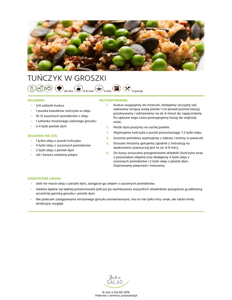 d TUŃCZYK W GROSZKI 20 min. 6-9 min. 5 min. 4 porcje SKŁADNIKI: × × × × × PRZYGOTOWANIE: 1. Kuskus wsypujemy do miseczki, dodajemy szczyptę soli, zalewamy wrzącą wodą (około 1 cm ponad poziom kaszy), 1 puszka kawałków tuńczyka w oleju przykrywamy i odstawiamy na ok. 6 minut do napęcznienia. 10-12 suszonych pomidorów z oleju Po upływie tego czasu przesypujemy kaszę do większej 1 szklanka mrożonego zielonego groszku miski. 3-4 łyżki pestek dyni 2. Pestki dyni prażymy na suchej patelni. 3/4 szklanki kuskus SKŁADNIKI NA SOS: × × × × 1 łyżka oleju z puszki tuńczyka 4 łyżki oleju z suszonych pomidorów 2 łyżki oleju z pestek dyni sól i świeżo zmielony pieprz 3. Wyjmujemy tuńczyka z puszki pozostawiając 1-2 łyżki oleju. 4. Suszone pomidory wyjmujemy z zalewy i kroimy w paseczki. 5. Groszek mrożony gotujemy zgodnie z instrukcją na opakowaniu (zazwyczaj jest to ok. 6-9 min.). 6. Do kaszy wrzucamy przygotowane składniki (tuńczyka wraz z pozostałym olejem) oraz dodajemy 4 łyżki oleju z suszonych pomidorów i 2 łyżki oleju z pestek dyni. Doprawiamy pieprzem i mieszamy. DODATKOWE UWAGI: × Jeśli nie macie oleju z pestek dyni, zastąpcie go olejem z suszonych pomidorów. × Sałatka będzie się ładniej prezentowała jeśli już po wymieszaniu wszystkich składników posypiecie ją odłożoną wcześniej garstką groszku i pestek dyni. × Nie polecam zastępowania mrożonego groszku konserwowym, ma on nie tylko inny smak, ale także mniej atrakcyjny wygląd. © Just a SALAD 2016 Pobrano z serwisu: justasalad.pl